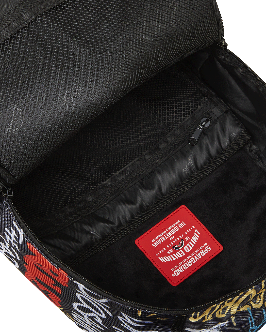 Dimensions: 18" x 6" x 11.5" • Front zipper pocket • Side pockets • Zippered Stash pocket • Separate velour sunglass compartment • Ergonomic mesh back padding • Adjustable Straps for custom sizing • Gold zippers with metal hardware • Metal "Sprayground Authentic" badge • Slide through back sleeve connects to carry-on luggage to free your hands