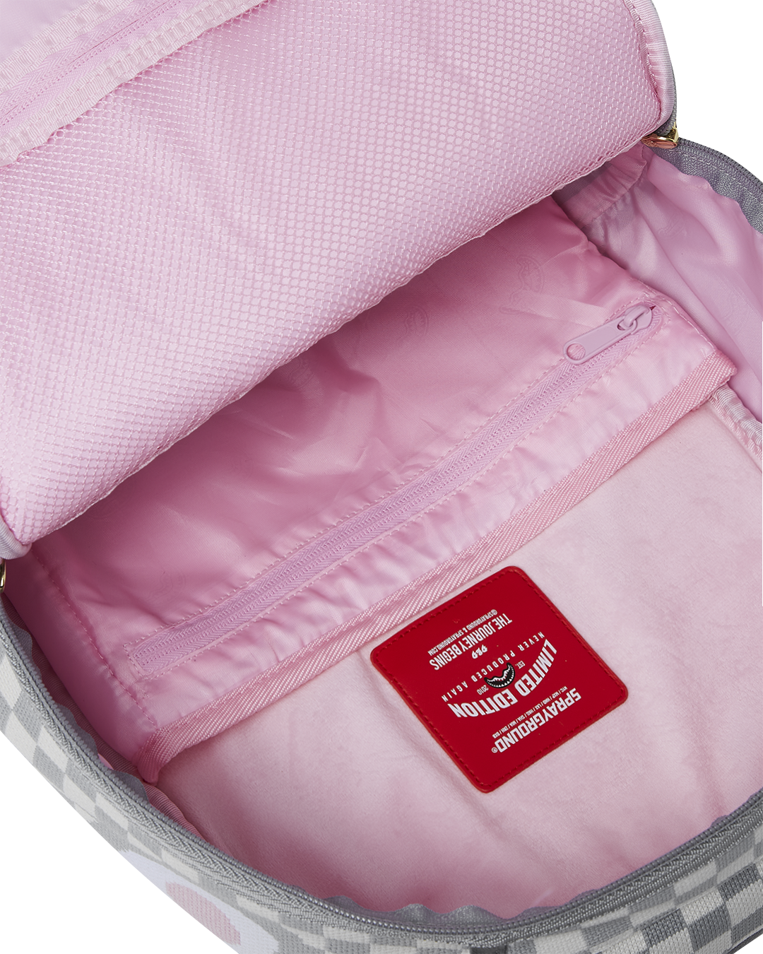 Dimensions: 18" x 6" x 11.5" • Front zipper pocket • Side pockets • Zippered Stash pocket • Separate velour sunglass compartment • Ergonomic mesh back padding • Adjustable Straps for custom sizing • Gold zippers with metal hardware • Metal "Sprayground Authentic" badge • Slide through back sleeve connects to carry-on luggage to free your hands