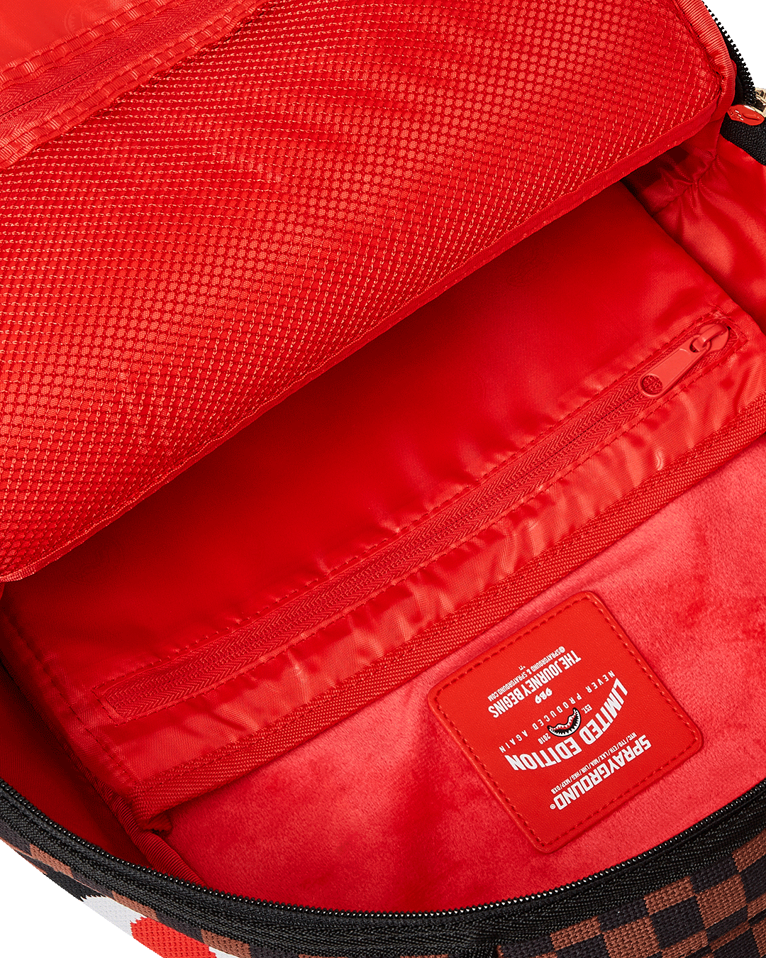 Dimensions: 18" x 6" x 11.5" • Front zipper pocket • Side pockets • Zippered Stash pocket • Separate velour sunglass compartment • Ergonomic mesh back padding • Adjustable Straps for custom sizing • Gold zippers with metal hardware • Metal "Sprayground Authentic" badge • Slide through back sleeve connects to carry-on luggage to free your hands