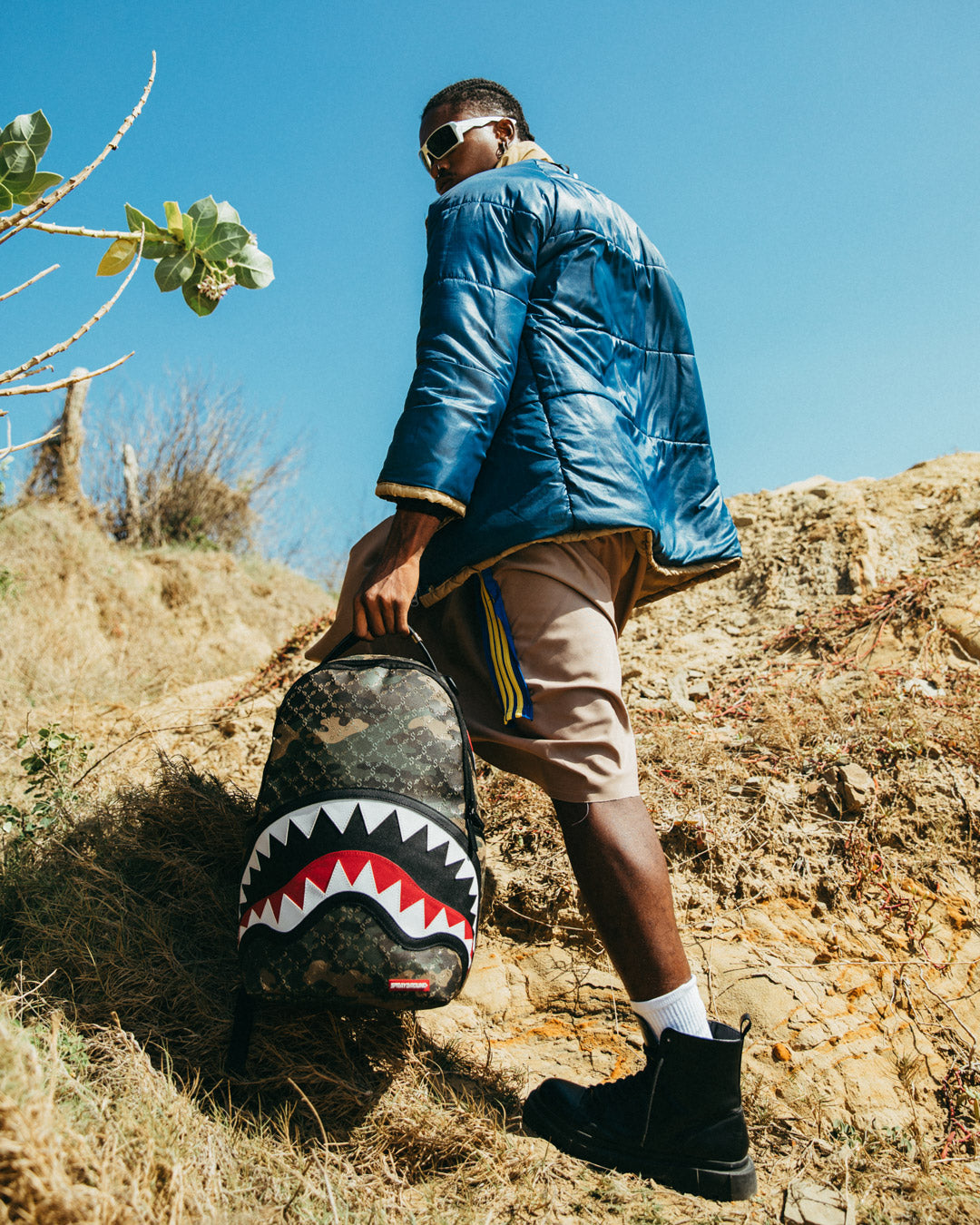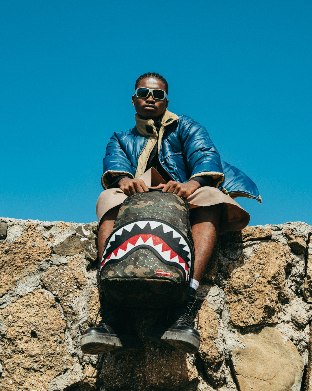 Dimensions: 18" x 6" x 11.5" • Front zipper pocket • Side pockets • Zippered Stash pocket • Separate velour sunglass compartment • Ergonomic mesh back padding • Adjustable Straps for custom sizing • Gold zippers with metal hardware • Metal "Sprayground Authentic" badge • Slide through back sleeve connects to carry-on luggage to free your hands