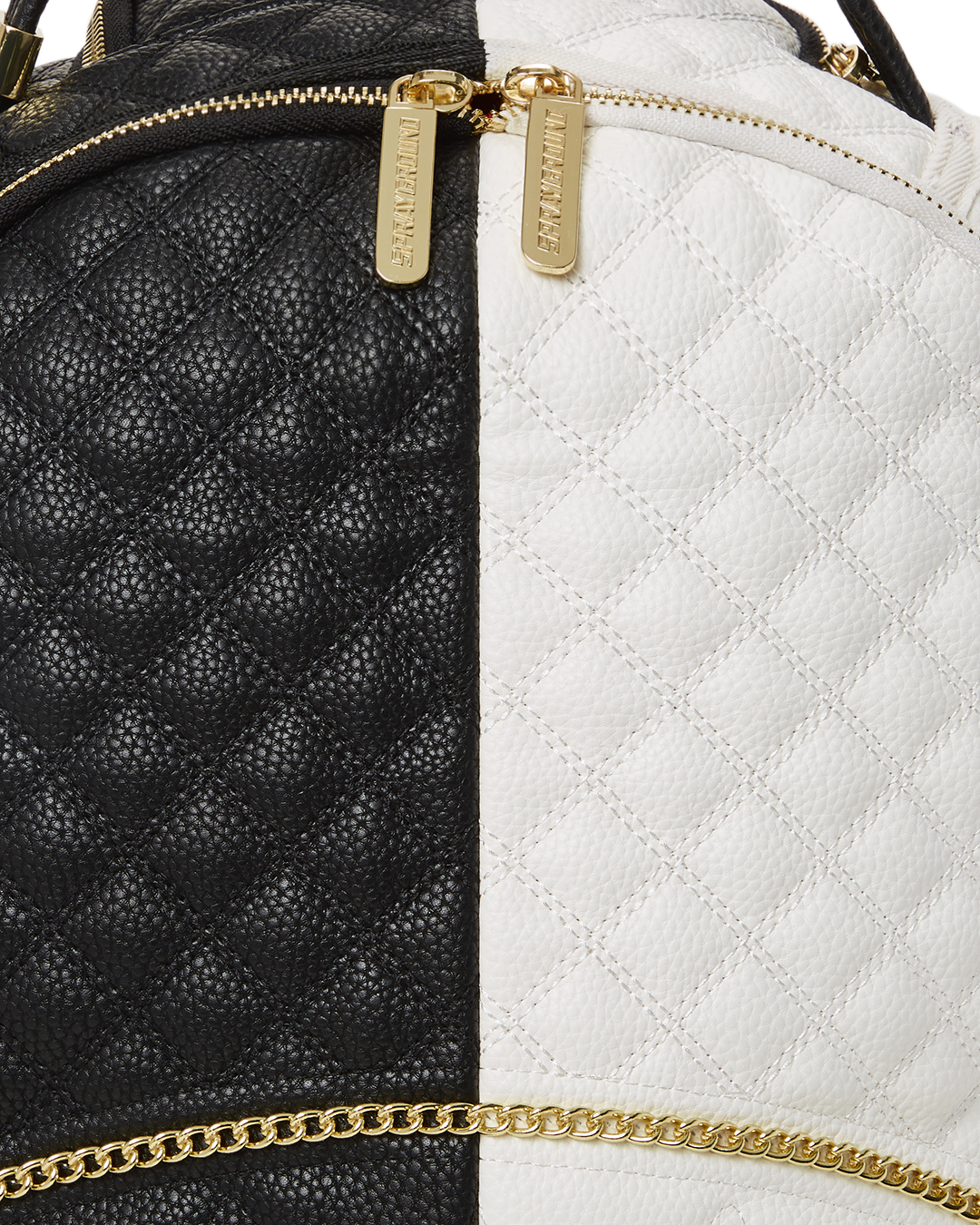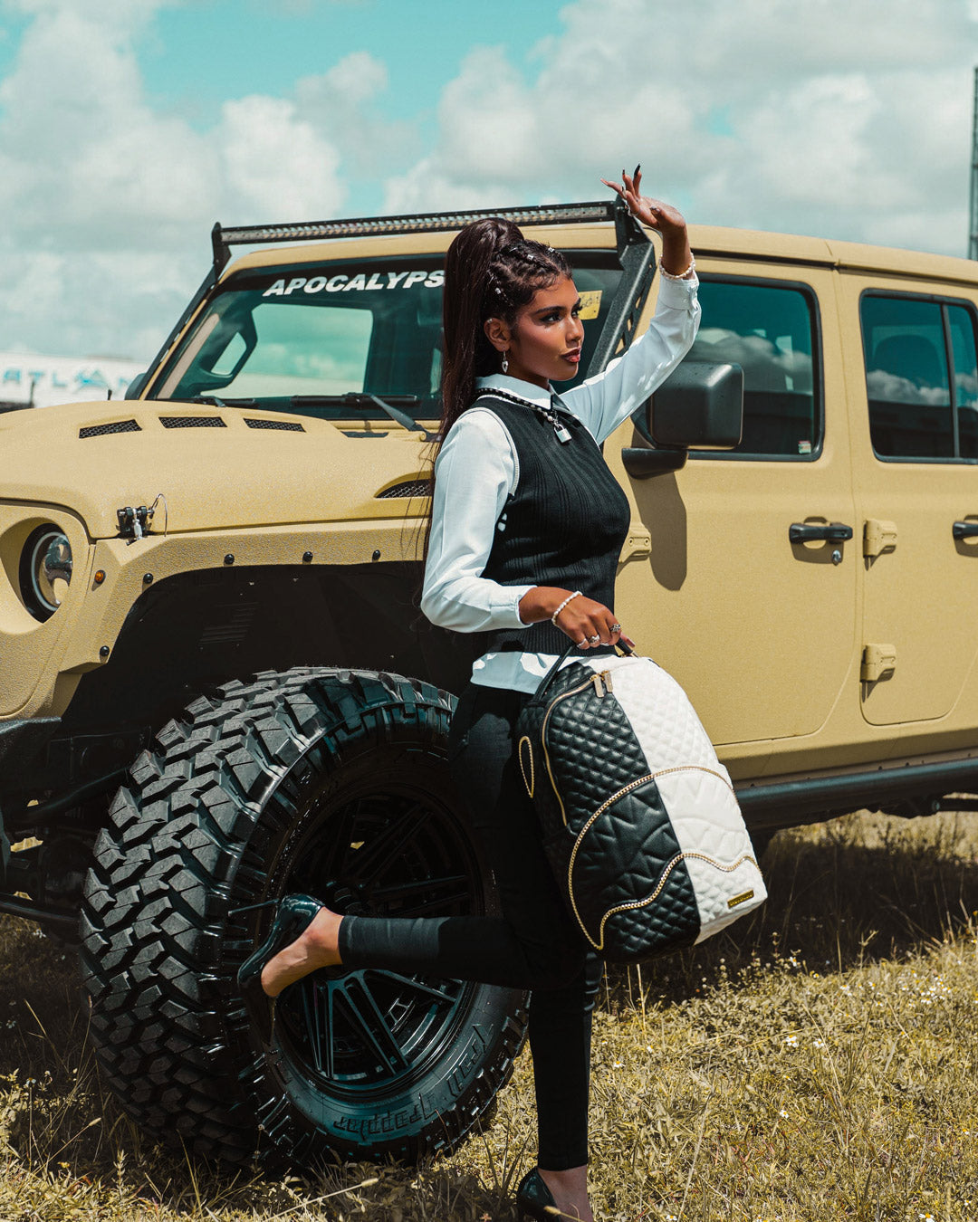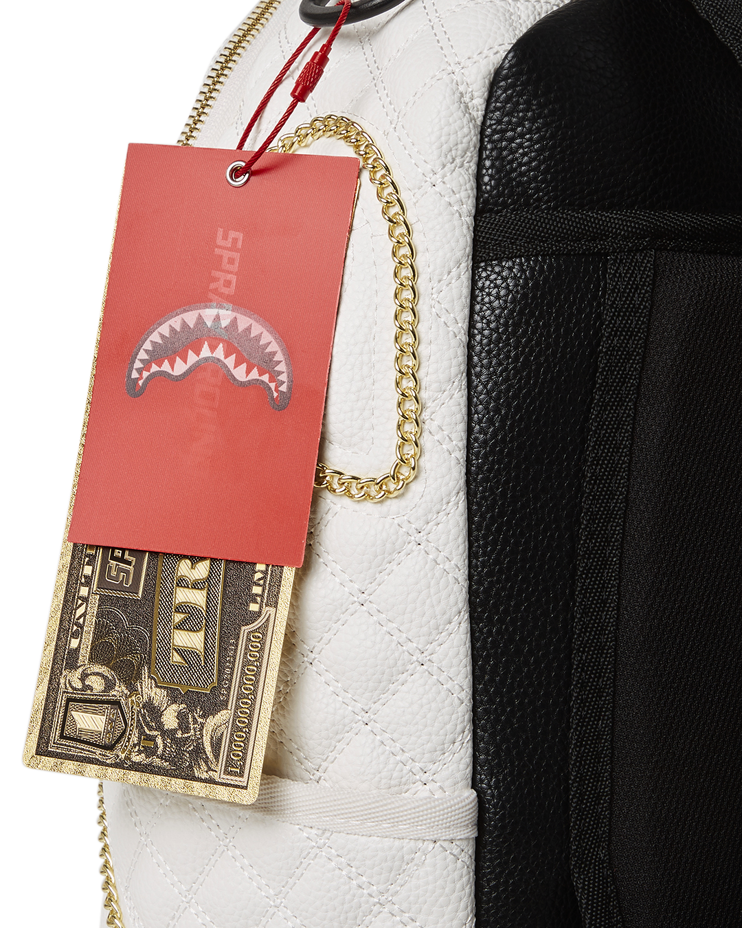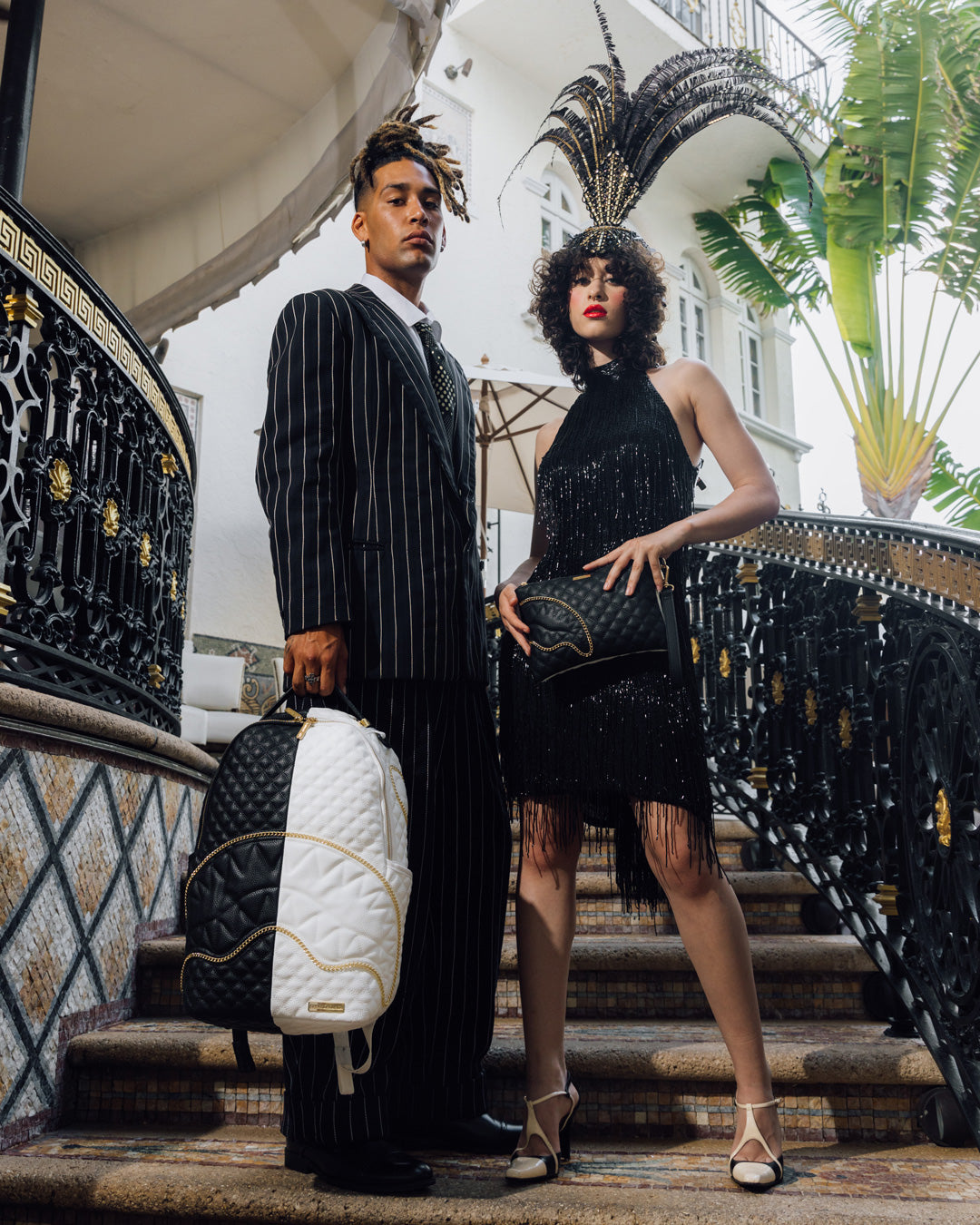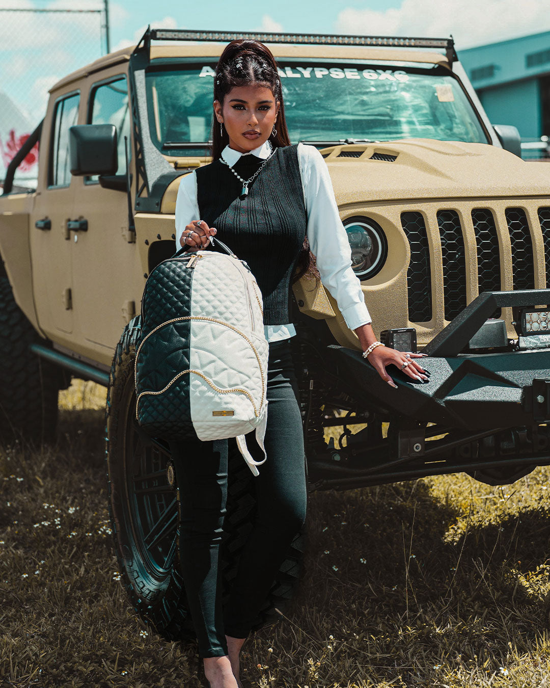 Dimensions: 18" x 6" x 11.5" • Front zipper pocket • Side pockets • Zippered Stash pocket • Separate velour sunglass compartment • Ergonomic mesh back padding • Adjustable Straps for custom sizing • Gold zippers with metal hardware • Metal "Sprayground Authentic" badge • Slide through back sleeve connects to carry-on luggage to free your hands