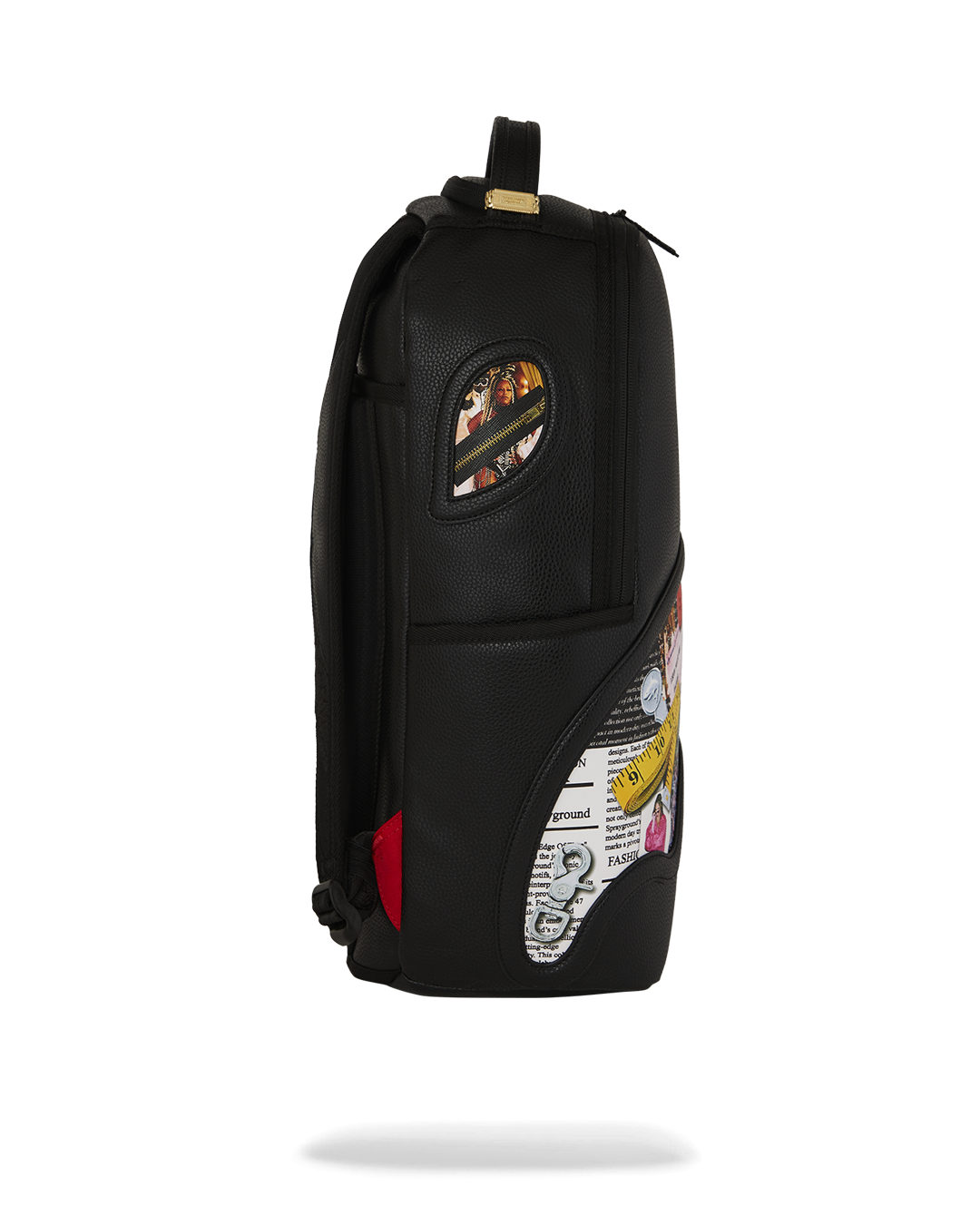 Dimensions: 18" x 6" x 11.5" • Front zipper pocket • Side pockets • Zippered Stash pocket • Separate velour sunglass compartment • Ergonomic mesh back padding • Adjustable Straps for custom sizing • Gold zippers with metal hardware • Metal "Sprayground Authentic" badge • Slide through back sleeve connects to carry-on luggage to free your hands