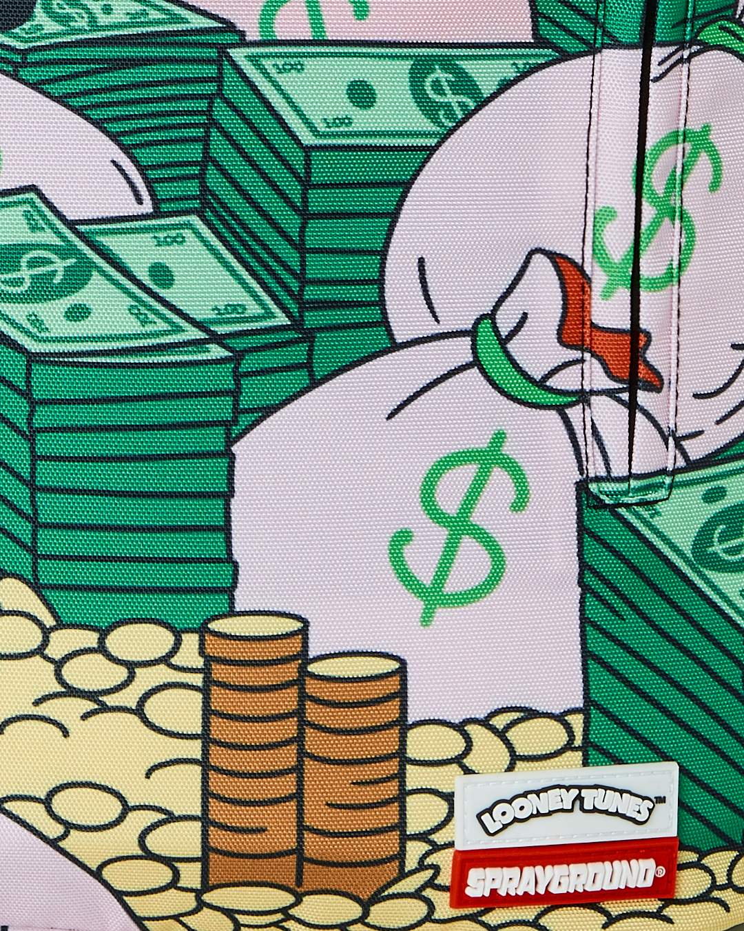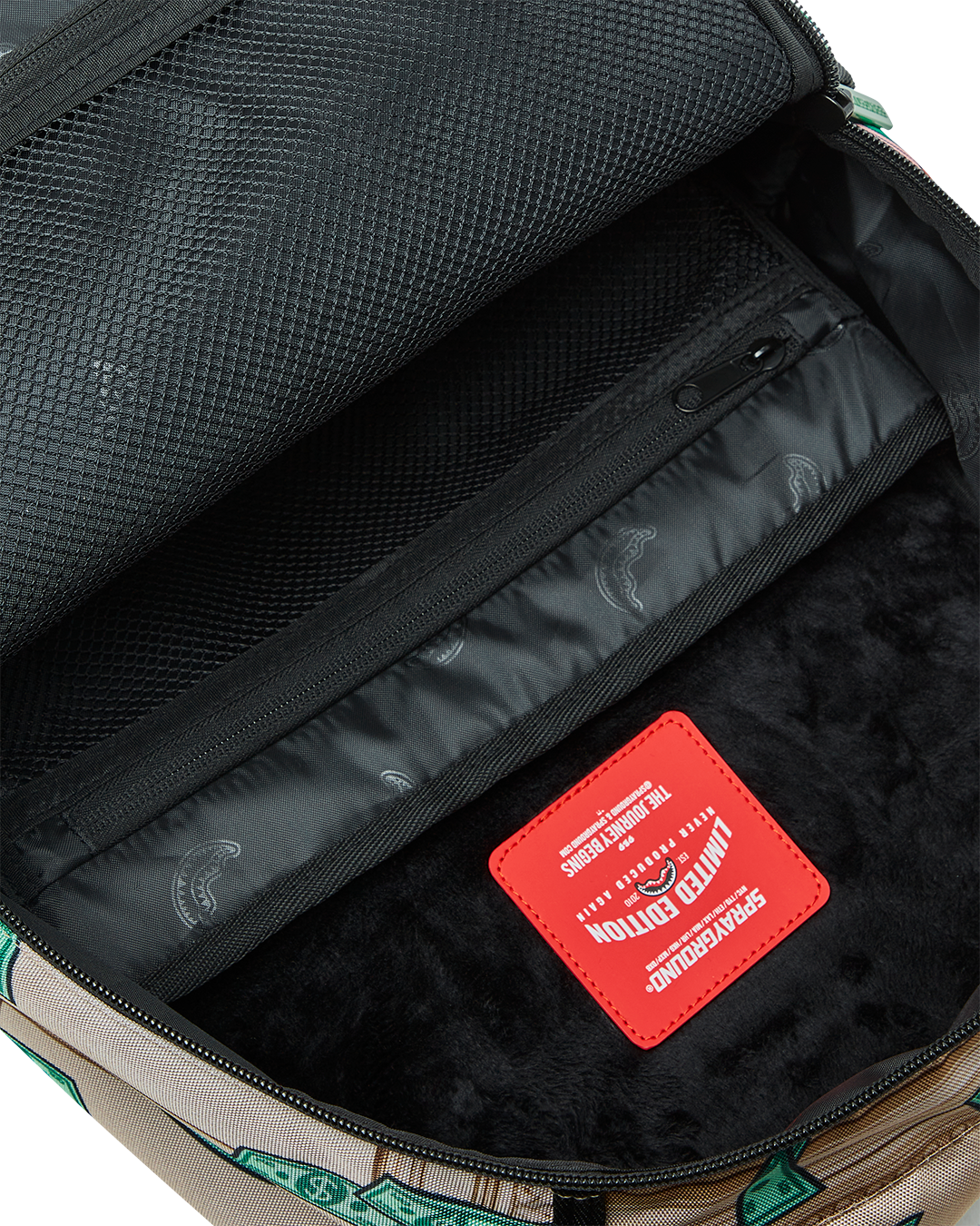 Dimensions: 18" x 6" x 11.5" • Front zipper pocket • Side pockets • Zippered Stash pocket • Separate velour sunglass compartment • Ergonomic mesh back padding • Adjustable Straps for custom sizing • Gold zippers with metal hardware • Metal "Sprayground Authentic" badge • Slide through back sleeve connects to carry-on luggage to free your hands