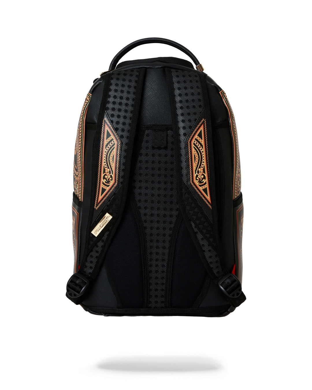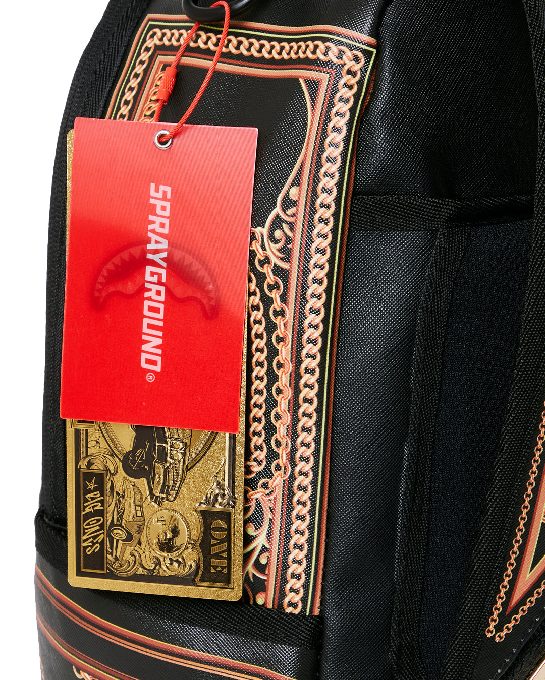 ExteriorDimensions: 18" x 6" x 11.5" • Front zipper pocket • Side pockets • Zippered Stash pocket • Separate velour sunglass compartment • Ergonomic mesh back padding • Adjustable Straps for custom sizing • Green zippers with metal hardware • Metal "Sprayground Authentic" badge • Slide through back sleeve connects to carry on luggage to free your hands