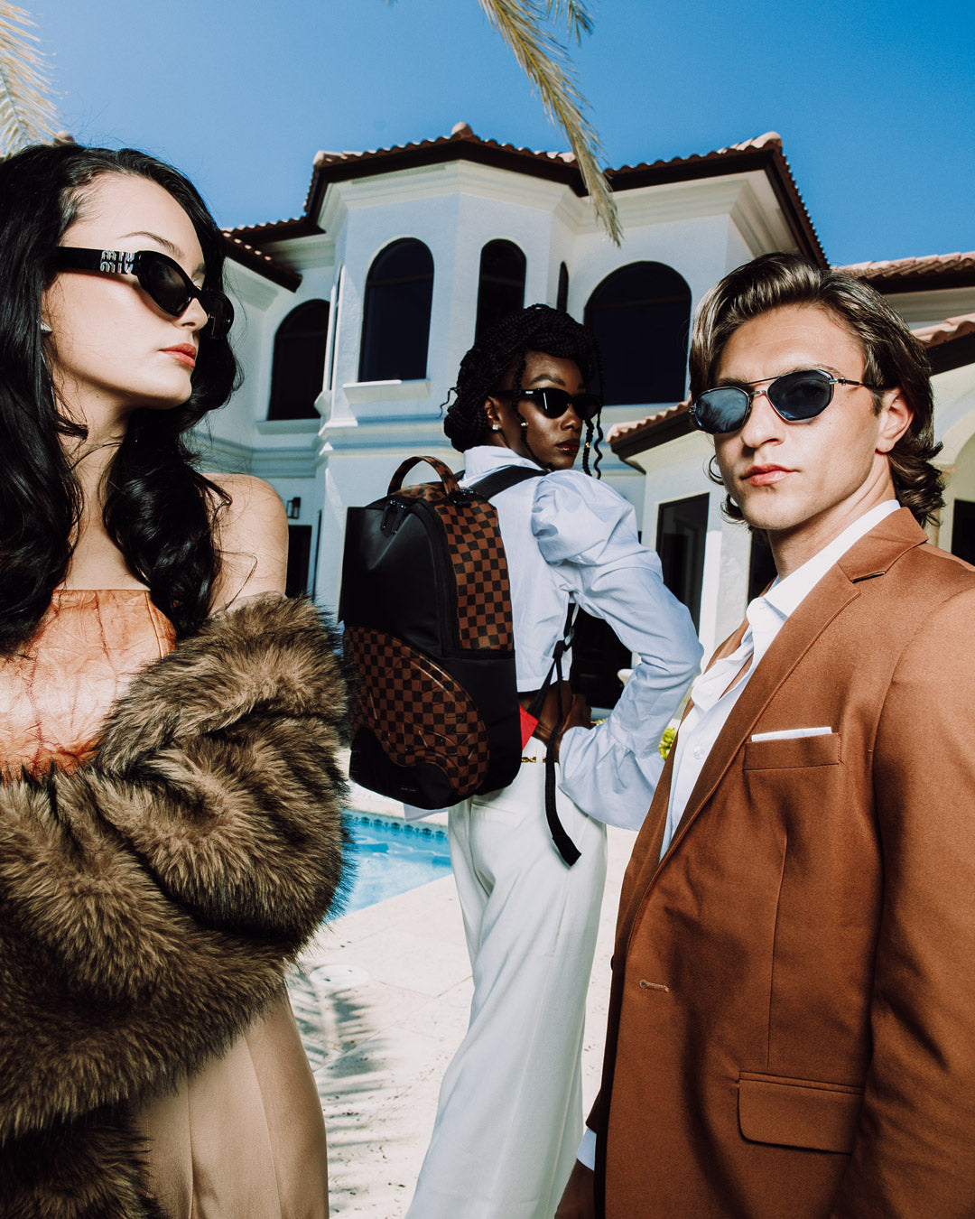 Dimensions: 18" x 6" x 11.5" • Front zipper pocket • Side pockets • Zippered Stash pocket • Separate velour sunglass compartment • Ergonomic mesh back padding • Adjustable Straps for custom sizing • Gold zippers with metal hardware • Metal "Sprayground Authentic" badge • Slide through back sleeve connects to carry-on luggage to free your hands
