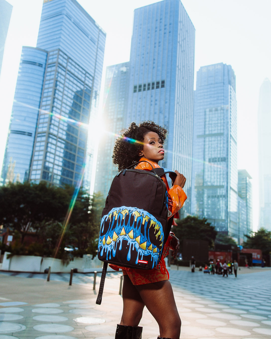 Dimensions: 18" x 6" x 11.5" • Front zipper pocket • Side pockets • Zippered Stash pocket • Separate velour sunglass compartment • Ergonomic mesh back padding • Adjustable Straps for custom sizing • Gold zippers with metal hardware • Metal "Sprayground Authentic" badge • Slide through back sleeve connects to carry-on luggage to free your hands