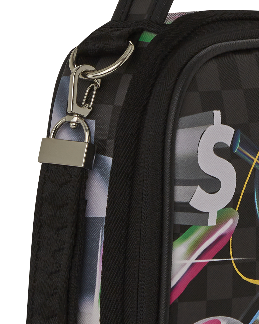 ExteriorDimensions: 8.5" x 3" x 8.5" • Double zipper opening • Top handle • Removable side handle • Red zippers with metal hardware • Zippered stash pocket