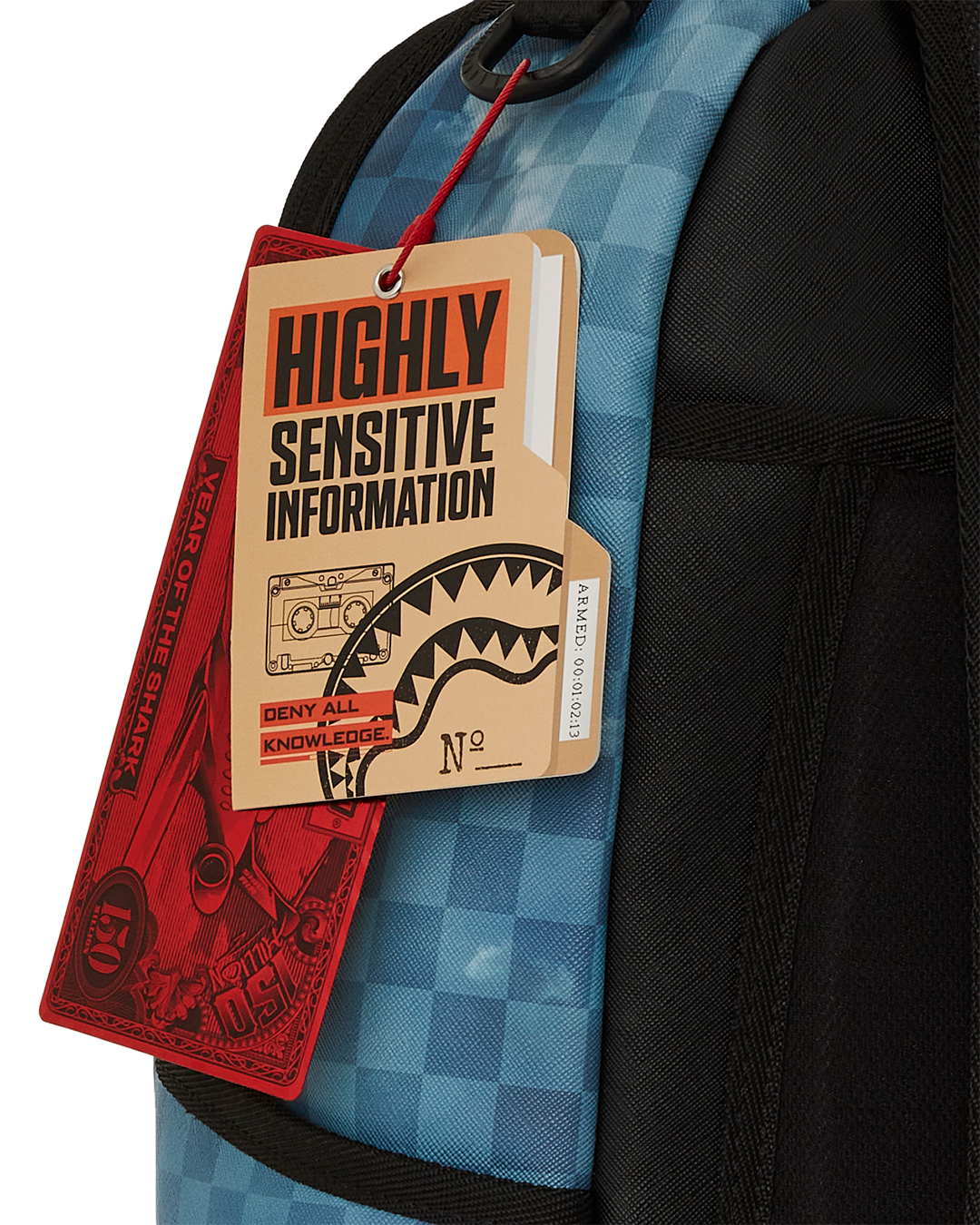 Dimensions: 18" x 6" x 11.5" • Front zipper pocket • Side pockets • Zippered Stash pocket • Separate velour sunglass compartment • Ergonomic mesh back padding • Adjustable Straps for custom sizing • Gold zippers with metal hardware • Metal "Sprayground Authentic" badge • Slide through back sleeve connects to carry-on luggage to free your hands