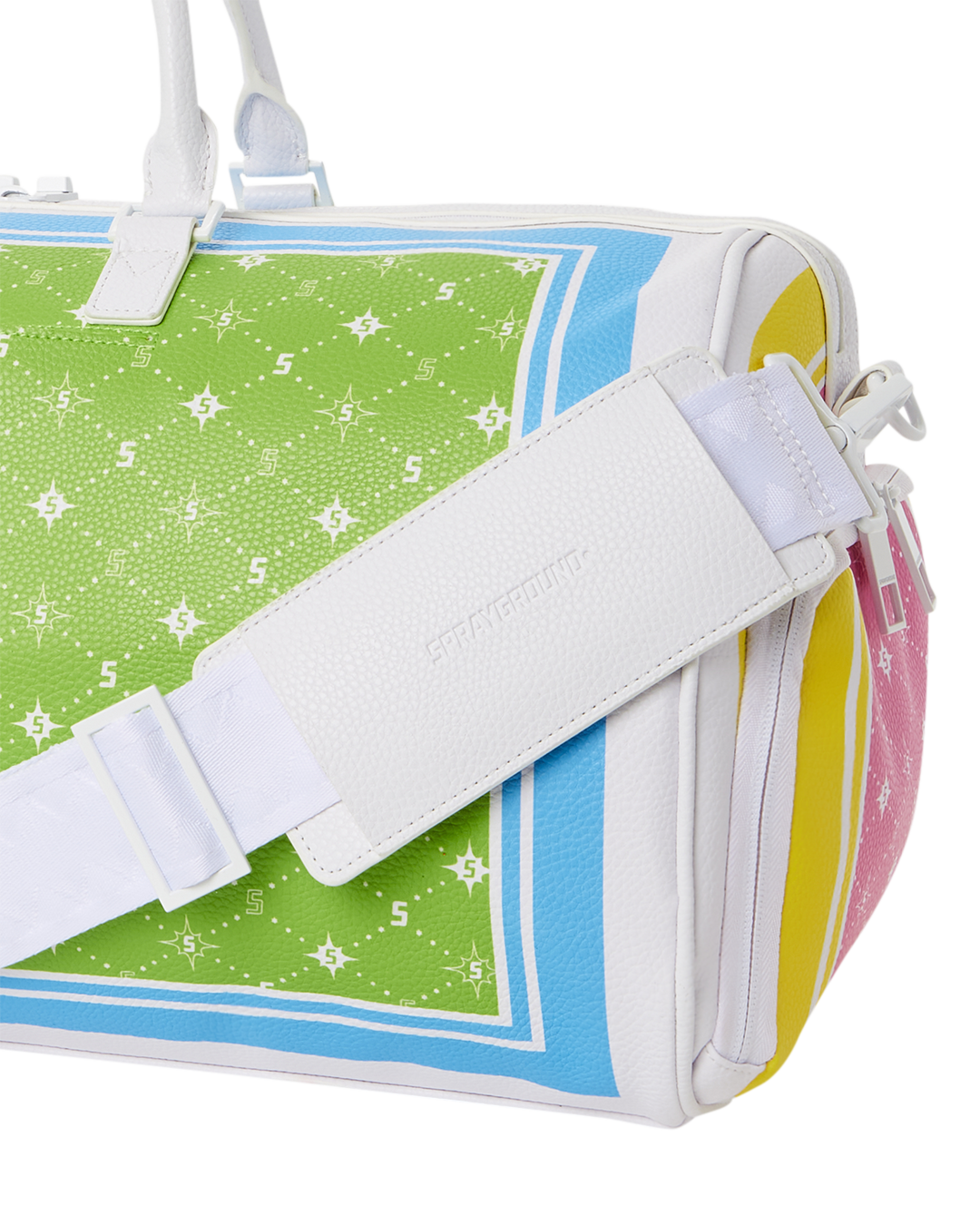 Faux leather printed in a brightly colored custom bandana pattern.