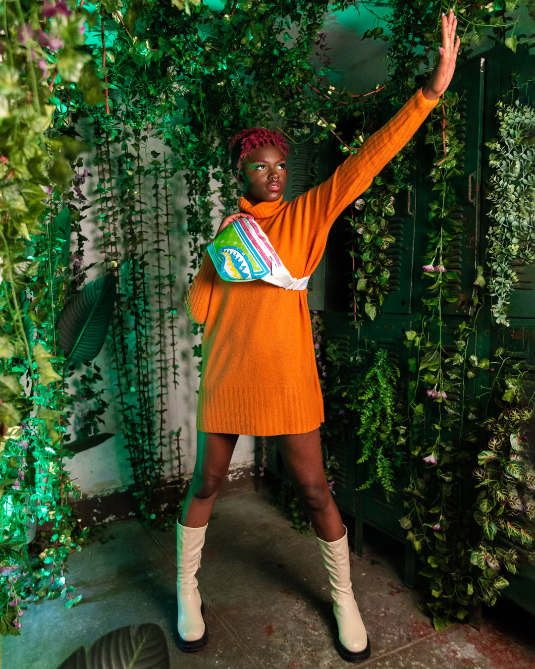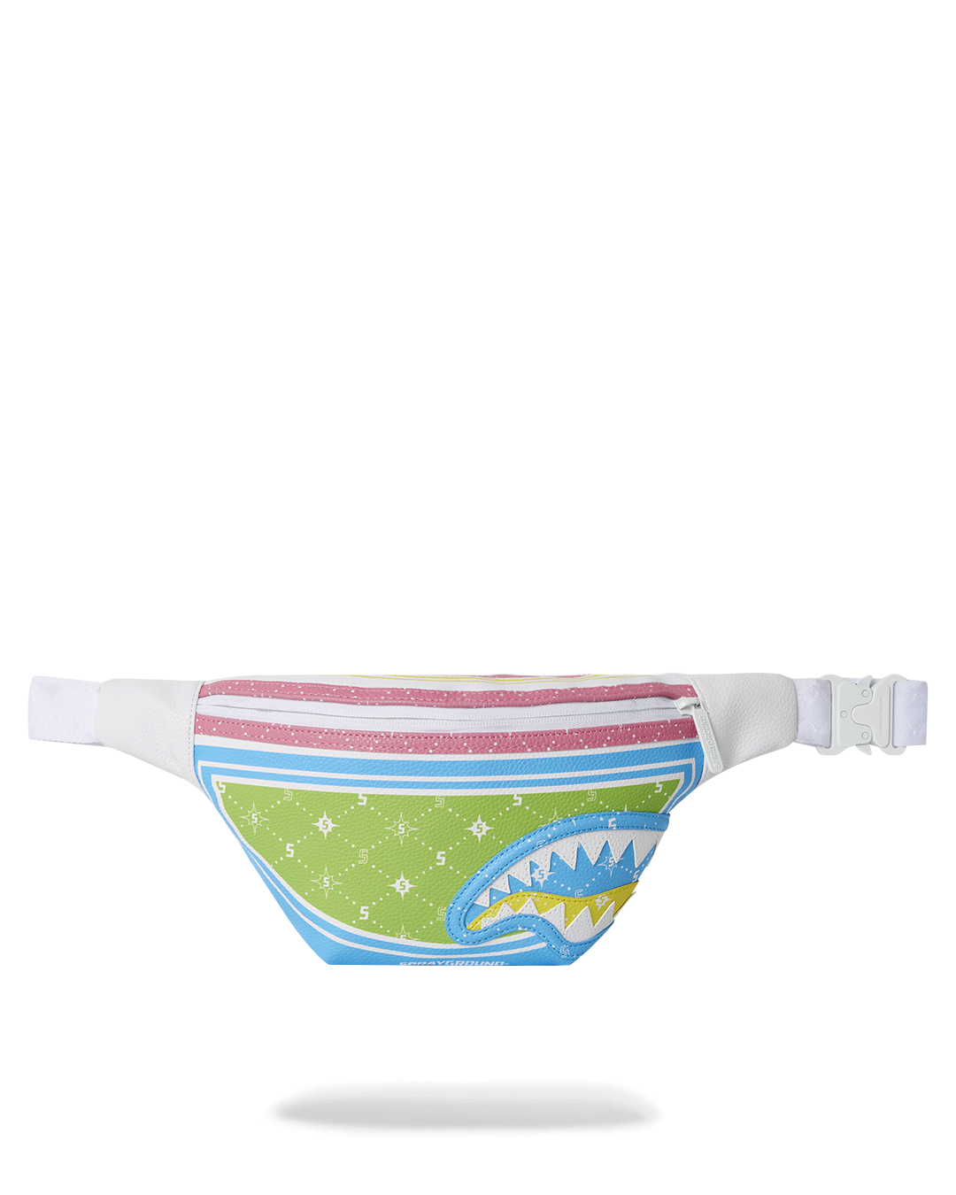 Faux leather printed in a brightly colored custom bandana pattern.