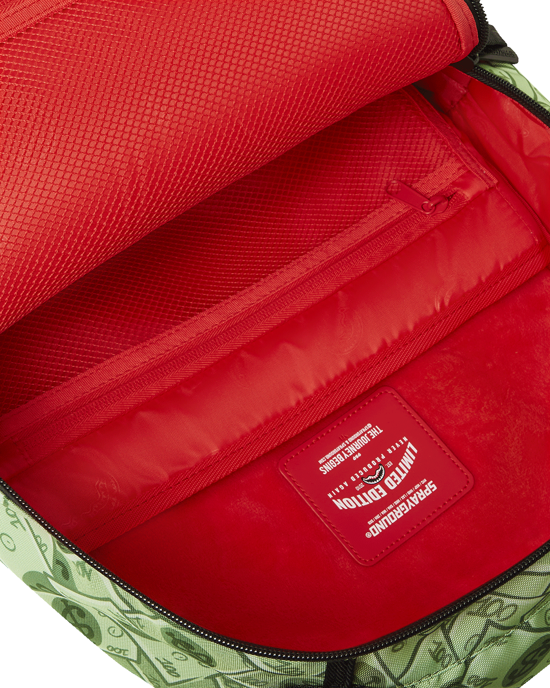 Dimensions: 18" x 6" x 11.5" • Front zipper pocket • Side pockets • Zippered Stash pocket • Separate velour sunglass compartment • Ergonomic mesh back padding • Adjustable Straps for custom sizing • Gold zippers with metal hardware • Metal "Sprayground Authentic" badge • Slide through back sleeve connects to carry-on luggage to free your hands