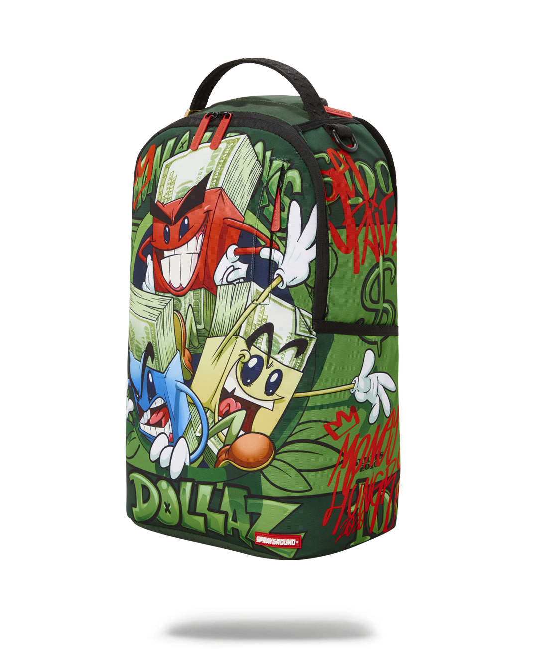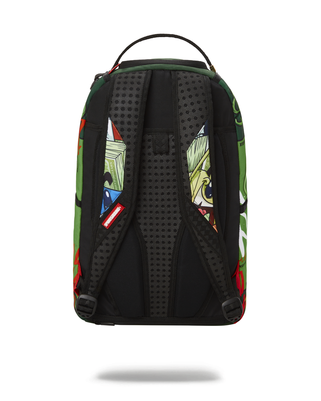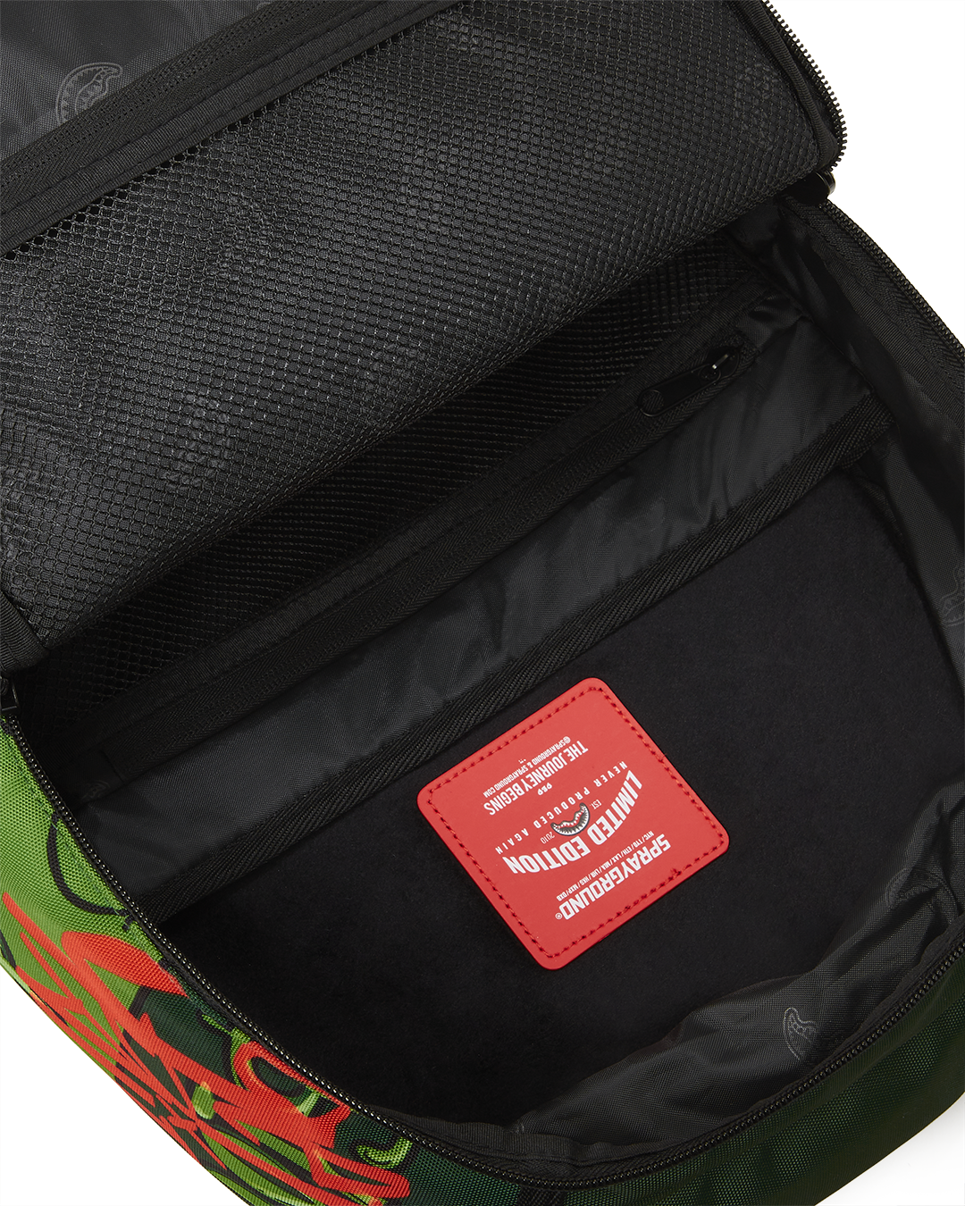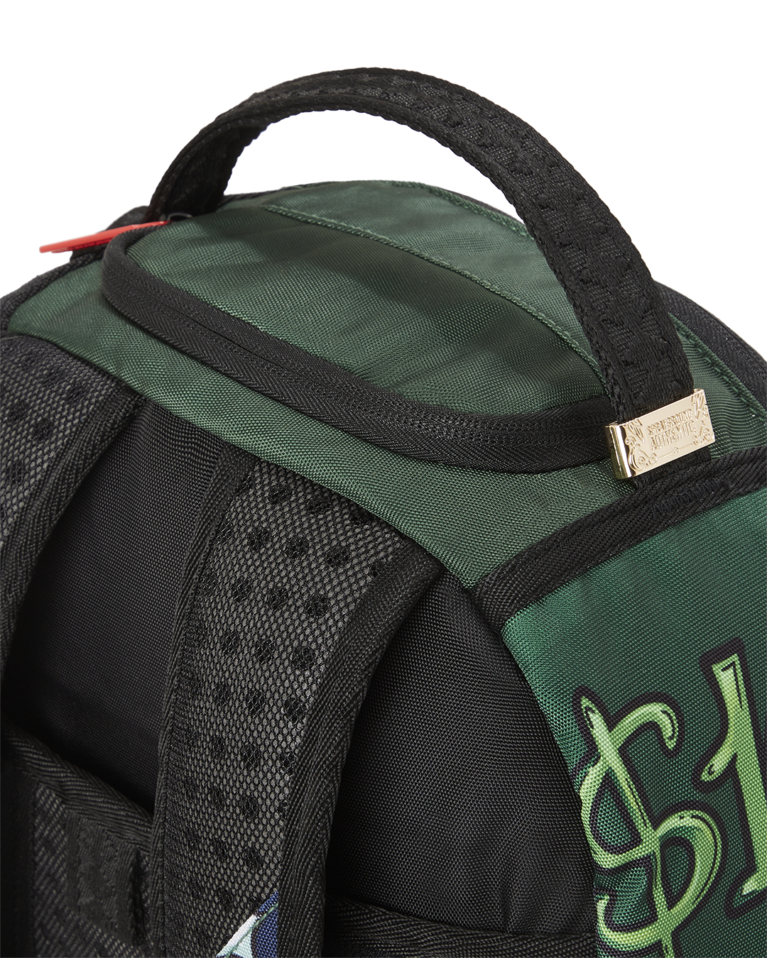 ExteriorDimensions: 18" x 6" x 11.5" • Front zipper pocket • Side pockets • Zippered Stash pocket • Separate velour sunglass compartment • Ergonomic mesh back padding • Adjustable Straps for custom sizing • Green zippers with metal hardware • Metal "Sprayground Authentic" badge • Slide through back sleeve connects to carry on luggage to free your hands