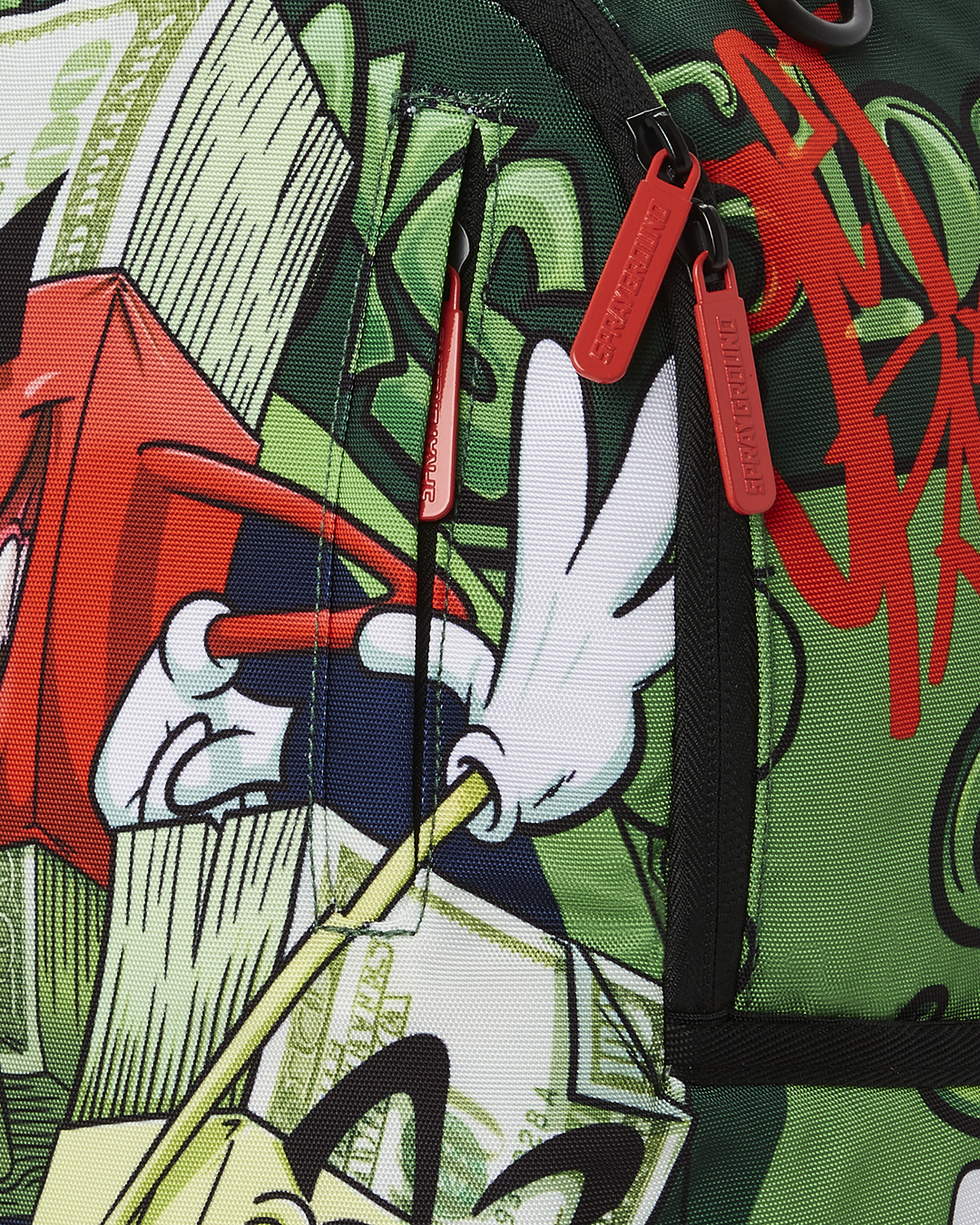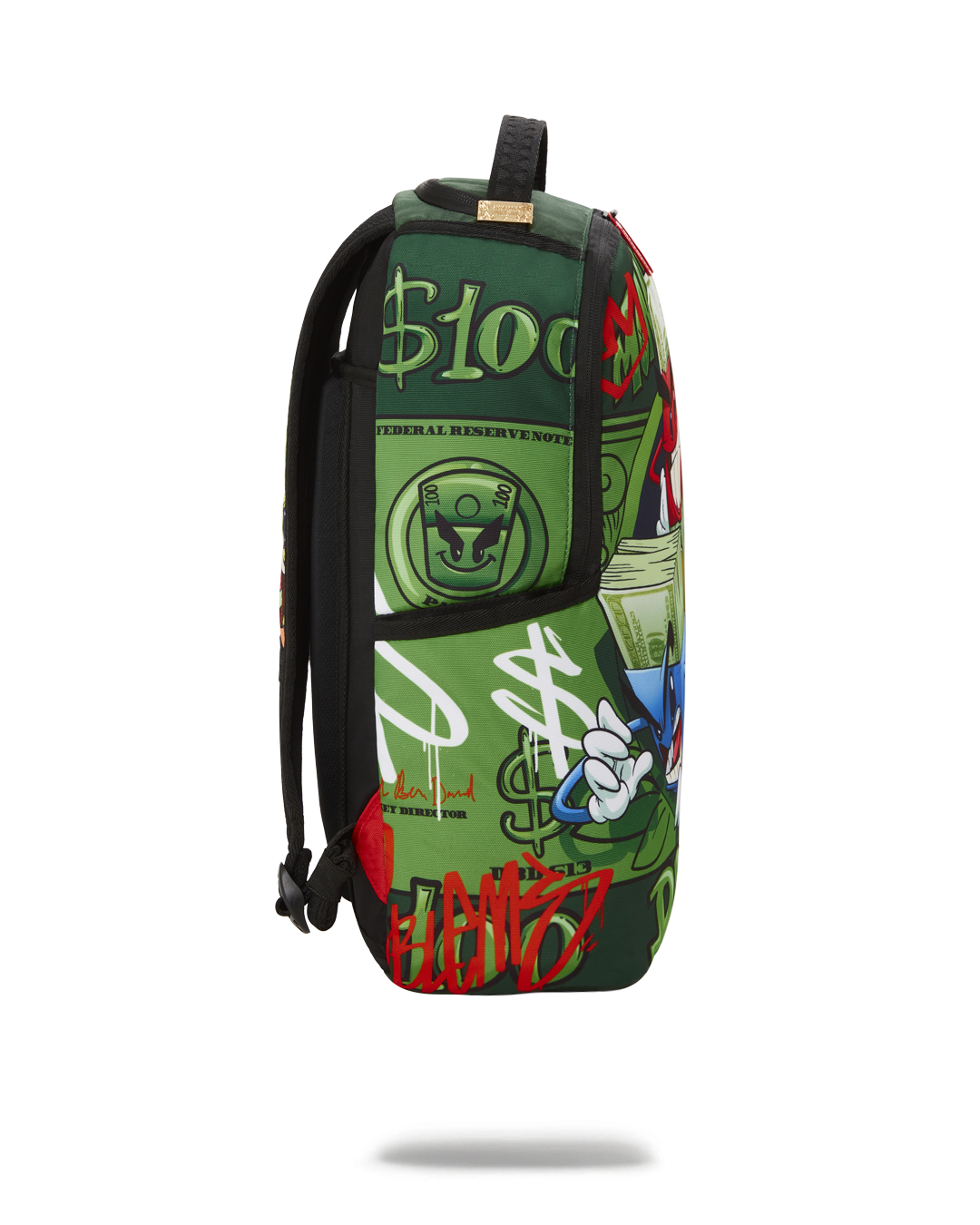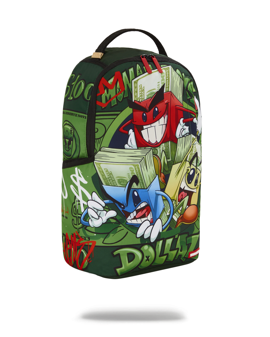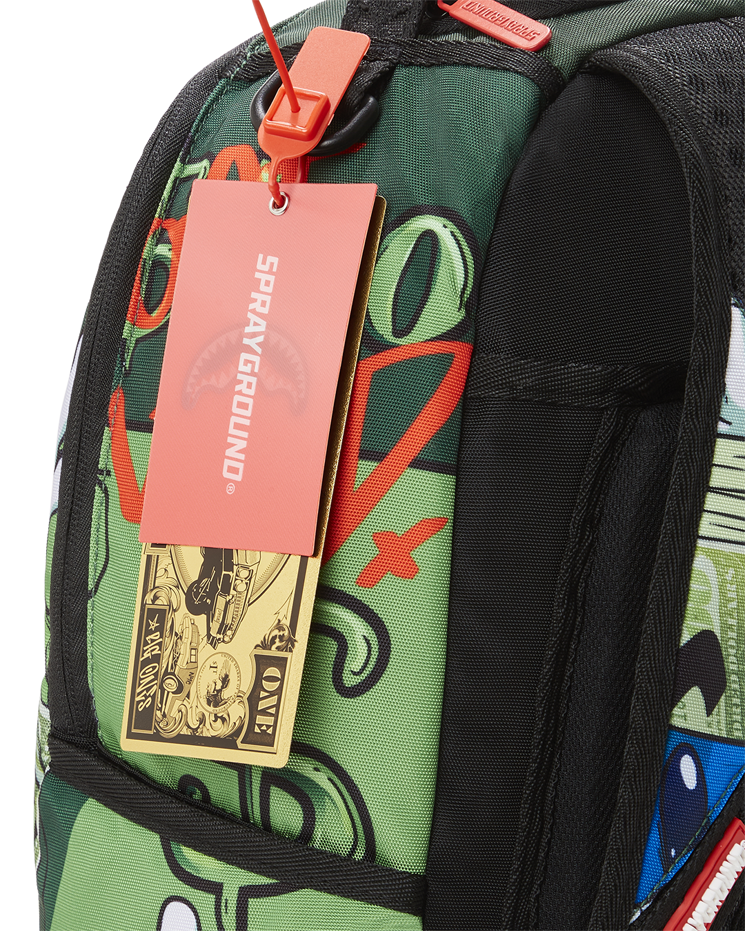 ExteriorDimensions: 18" x 6" x 11.5" • Front zipper pocket • Side pockets • Zippered Stash pocket • Separate velour sunglass compartment • Ergonomic mesh back padding • Adjustable Straps for custom sizing • Green zippers with metal hardware • Metal "Sprayground Authentic" badge • Slide through back sleeve connects to carry on luggage to free your hands