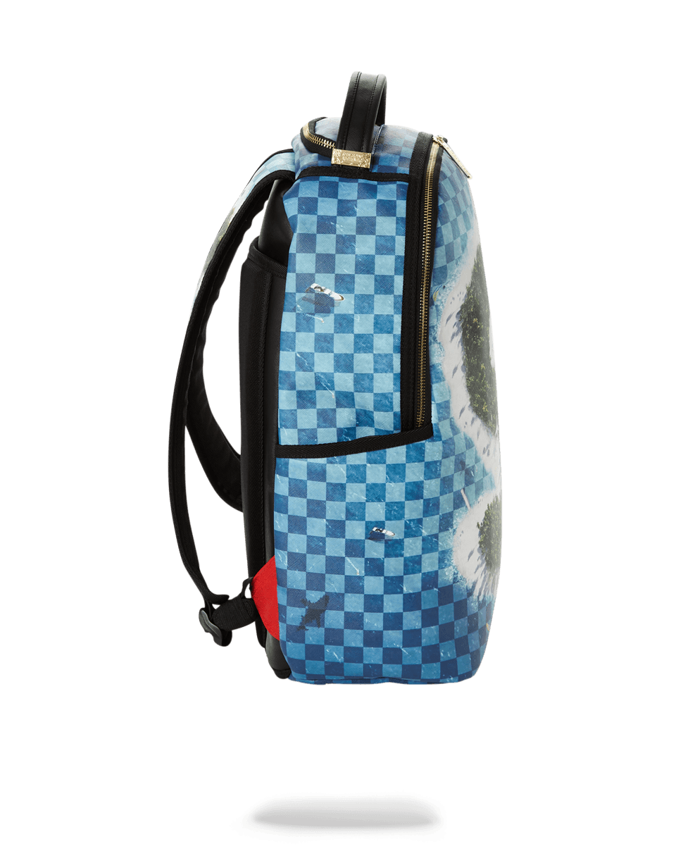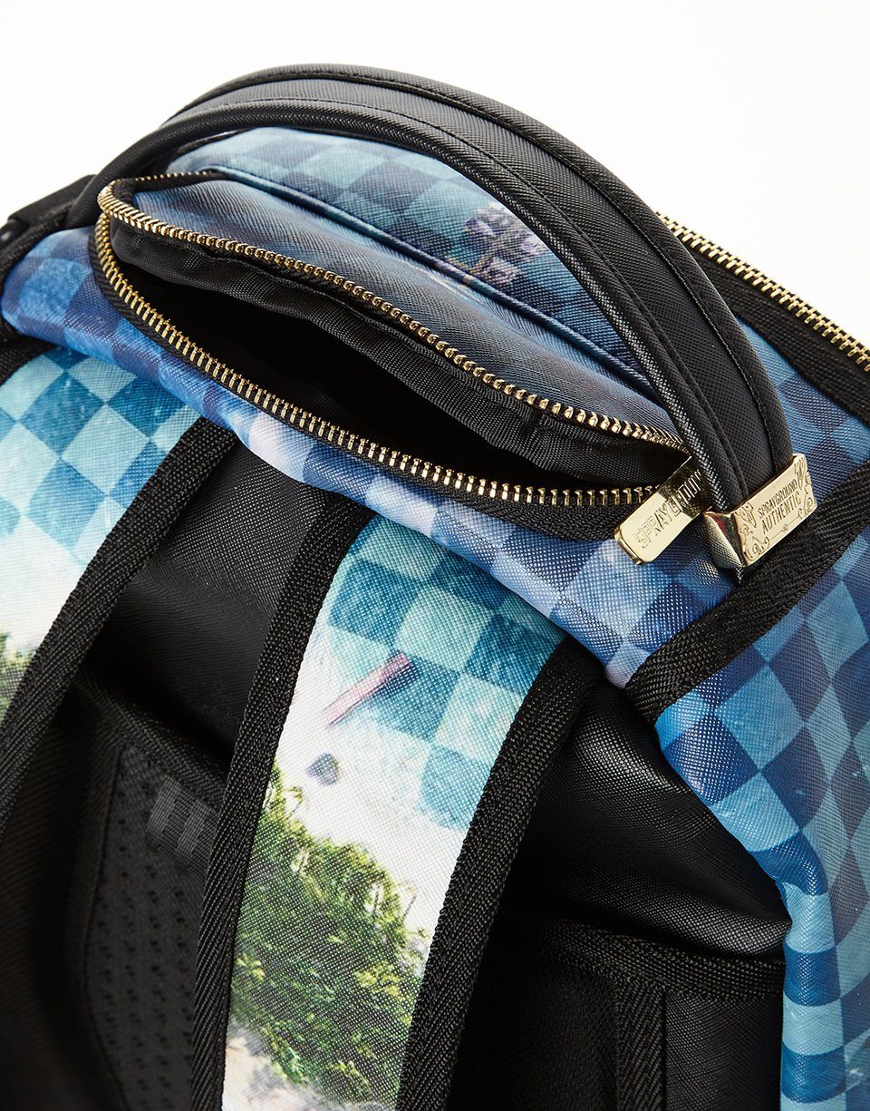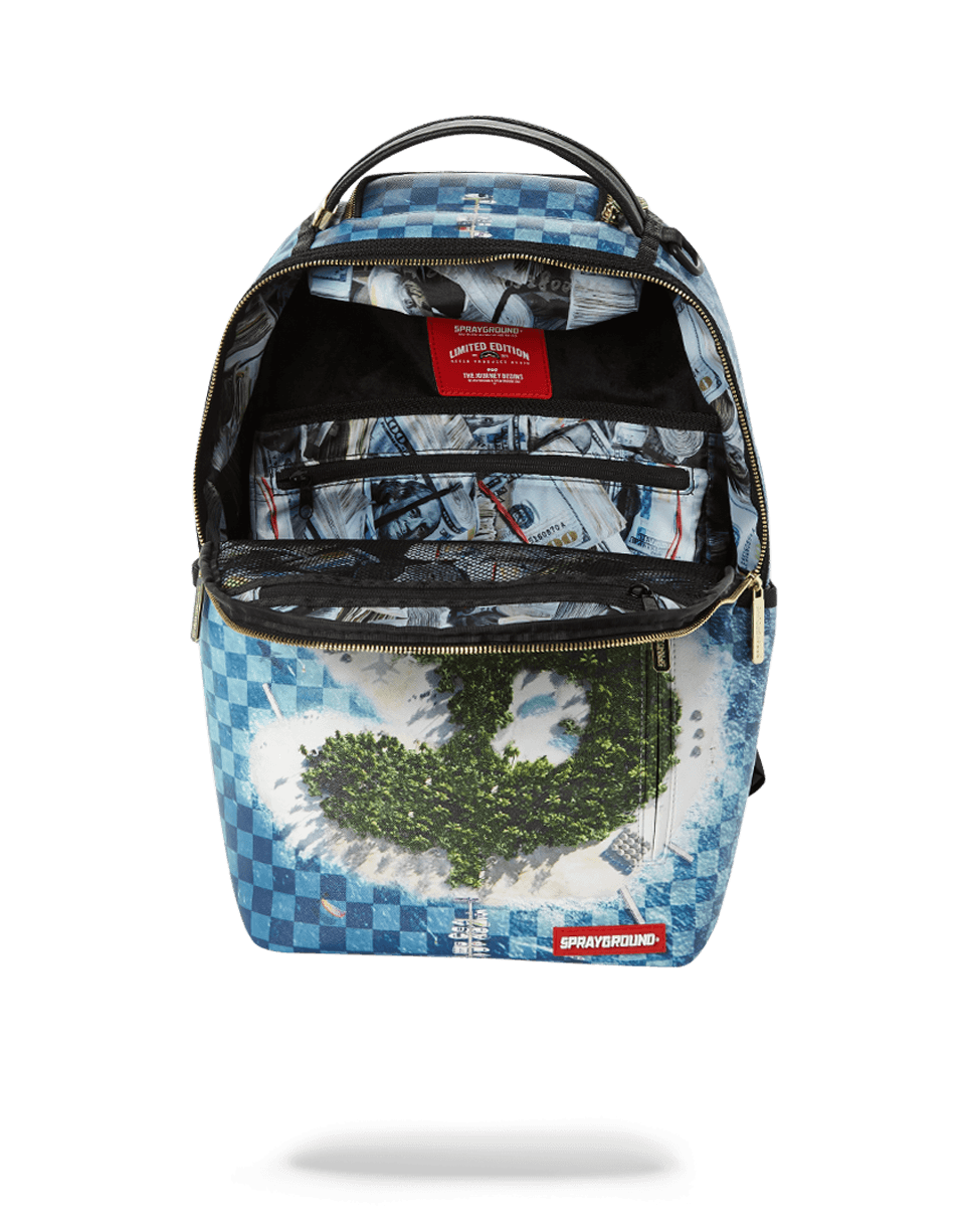 ExteriorDimensions: 18" x 6" x 11.5" • Front zipper pocket • Side pockets • Zippered Stash pocket • Ergonomic mesh back padding • Adjustable Straps for custom sizing • Nylon Zippers with Metal Hardware • Metal "Sprayground Authentic" badge • Slide through back sleeve connects to Carry on luggage to free your hands • Bag of Sprayground Money