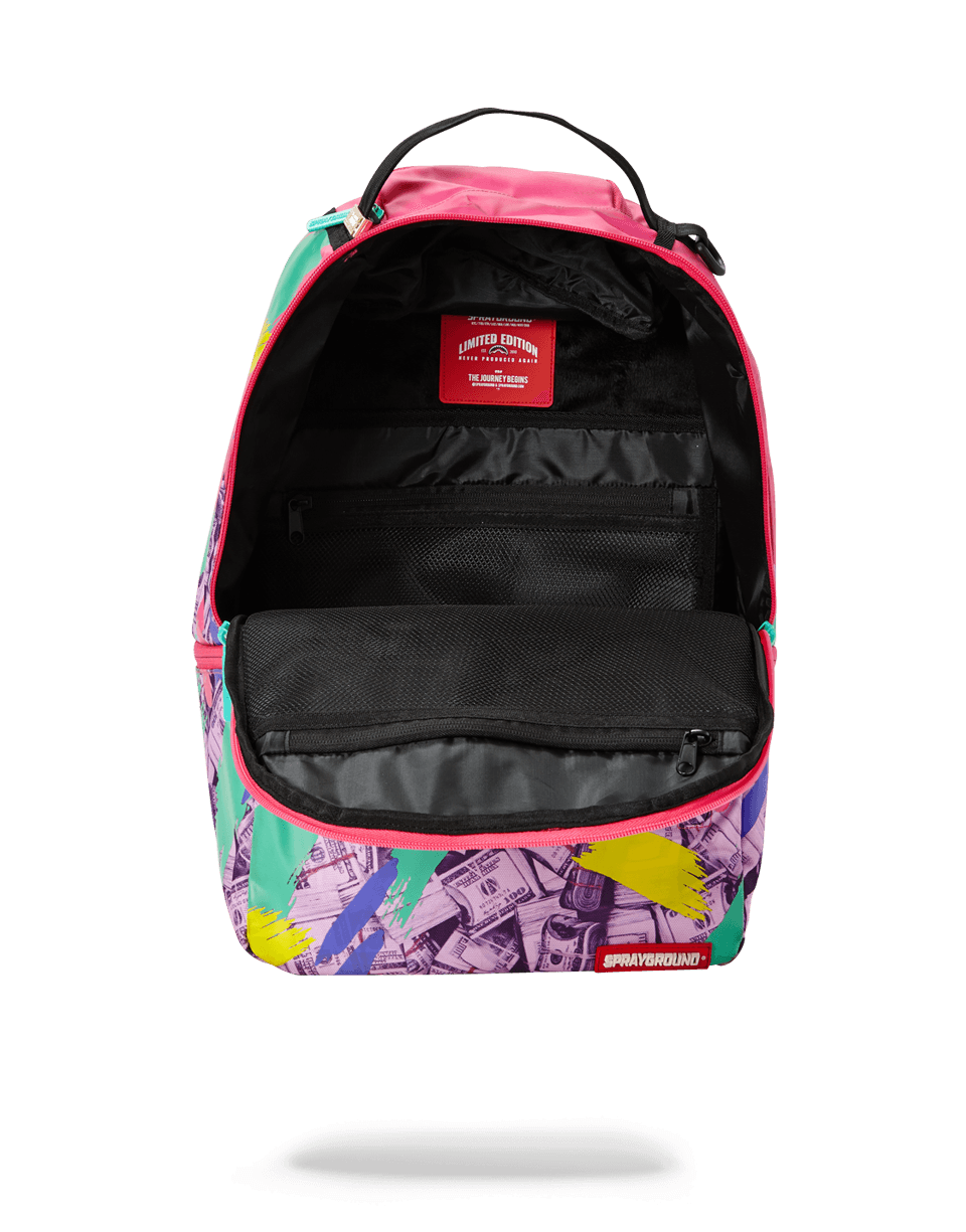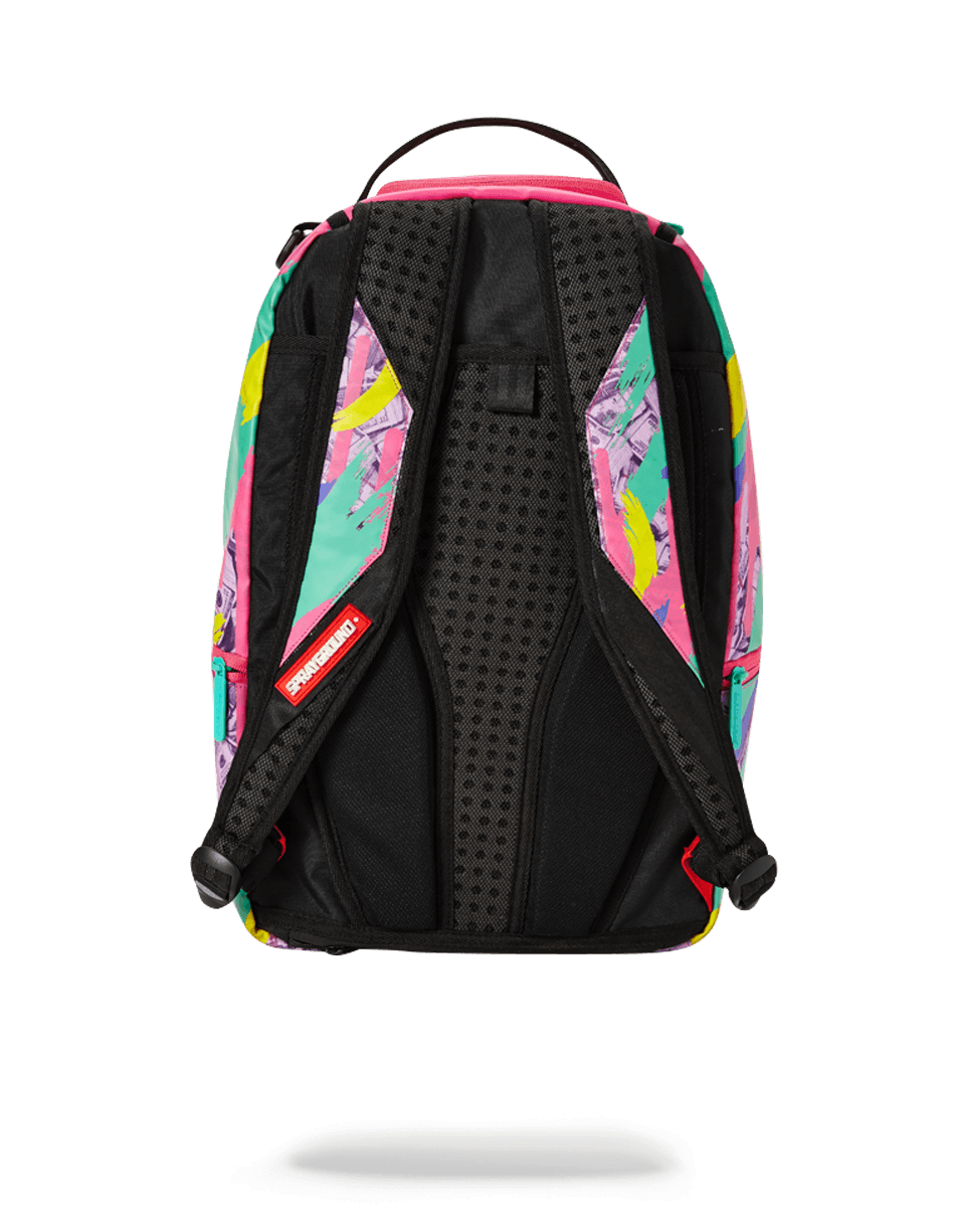 ExteriorDimensions: 18" x 6" x 11.5" ∙ Front zipper pocket ∙ Side pockets ∙ Zippered Stash pocket ∙ Ergonomic mesh back padding ∙ Adjustable Straps for custom sizing ∙ Nylon Zippers with Metal Hardware ∙ Metal "Sprayground Authentic" badge ∙ Slide through back sleeve connects to Carry on luggage to free your hands