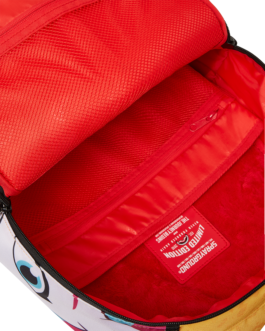 Dimensions: 18" x 6" x 11.5" • Front zipper pocket • Side pockets • Zippered Stash pocket • Separate velour sunglass compartment • Ergonomic mesh back padding • Adjustable Straps for custom sizing • Gold zippers with metal hardware • Metal "Sprayground Authentic" badge • Slide through back sleeve connects to carry-on luggage to free your hands