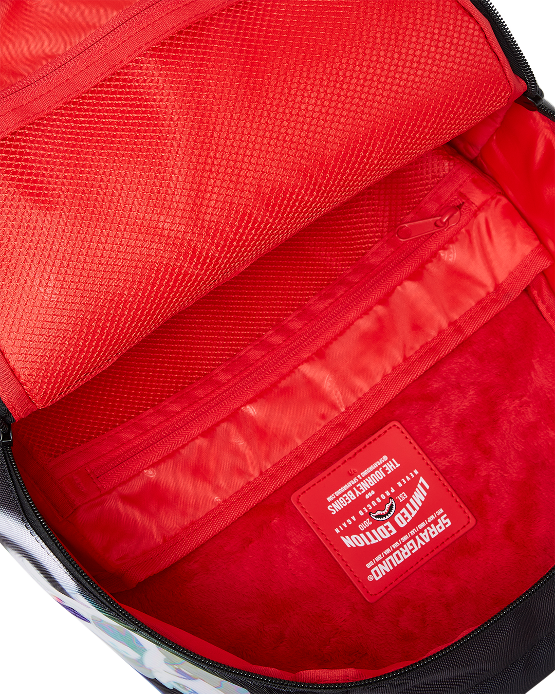 Dimensions: 18" x 6" x 11.5" • Front zipper pocket • Side pockets • Zippered Stash pocket • Separate velour sunglass compartment • Ergonomic mesh back padding • Adjustable Straps for custom sizing • Gold zippers with metal hardware • Metal "Sprayground Authentic" badge • Slide through back sleeve connects to carry-on luggage to free your hands