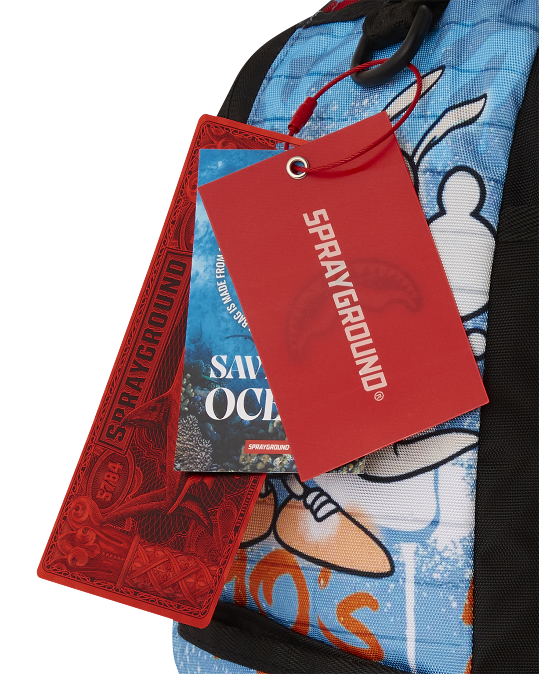 Dimensions: 18" x 6" x 11.5" • Front zipper pocket • Side pockets • Zippered Stash pocket • Separate velour sunglass compartment • Ergonomic mesh back padding • Adjustable Straps for custom sizing • Gold zippers with metal hardware • Metal "Sprayground Authentic" badge • Slide through back sleeve connects to carry-on luggage to free your hands