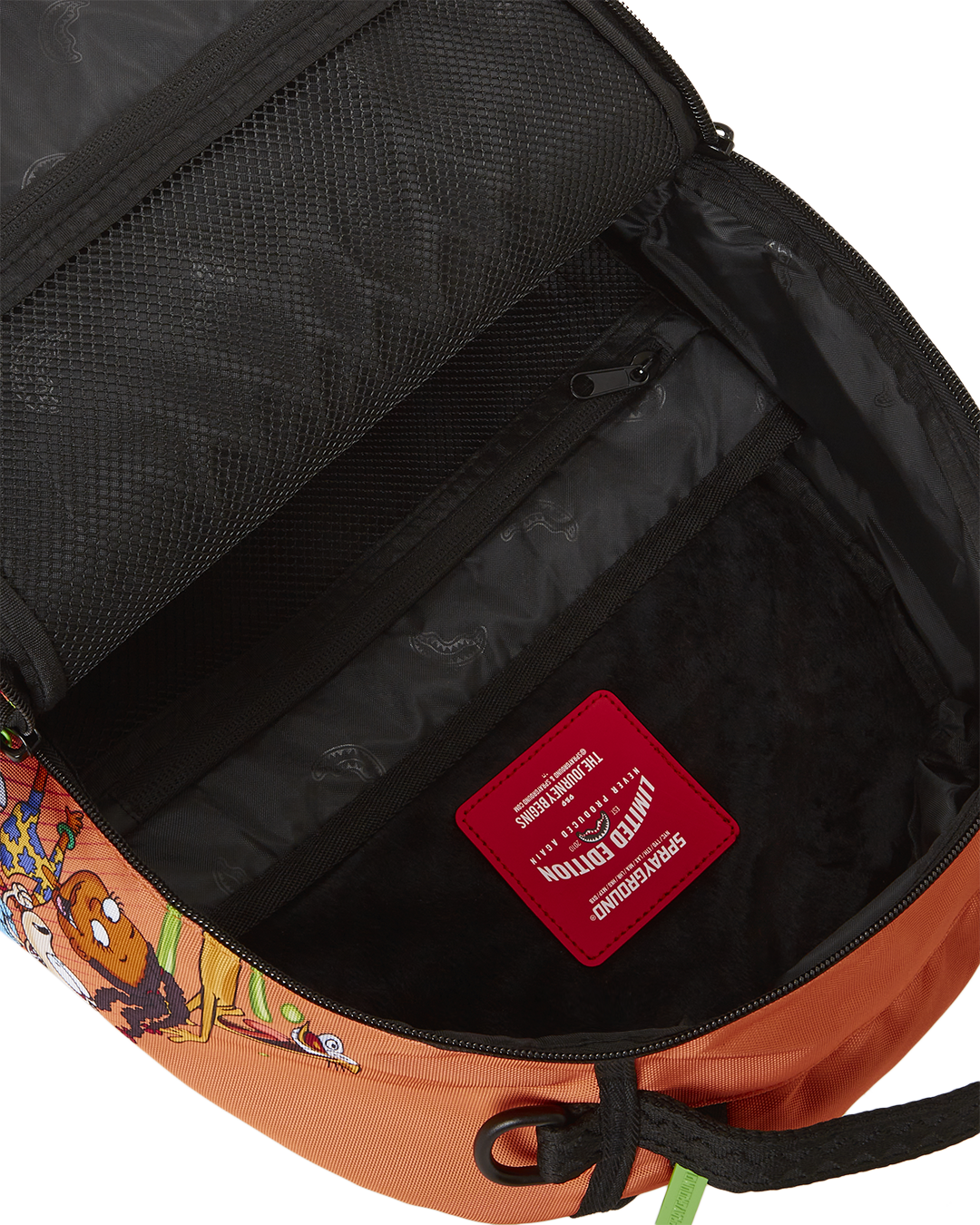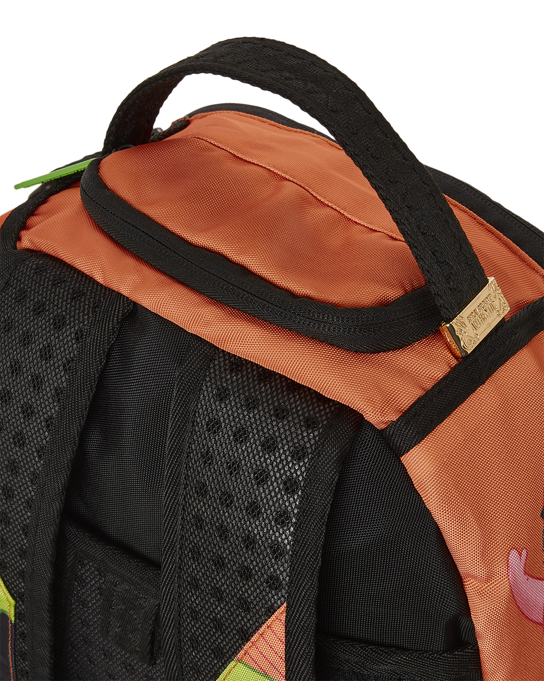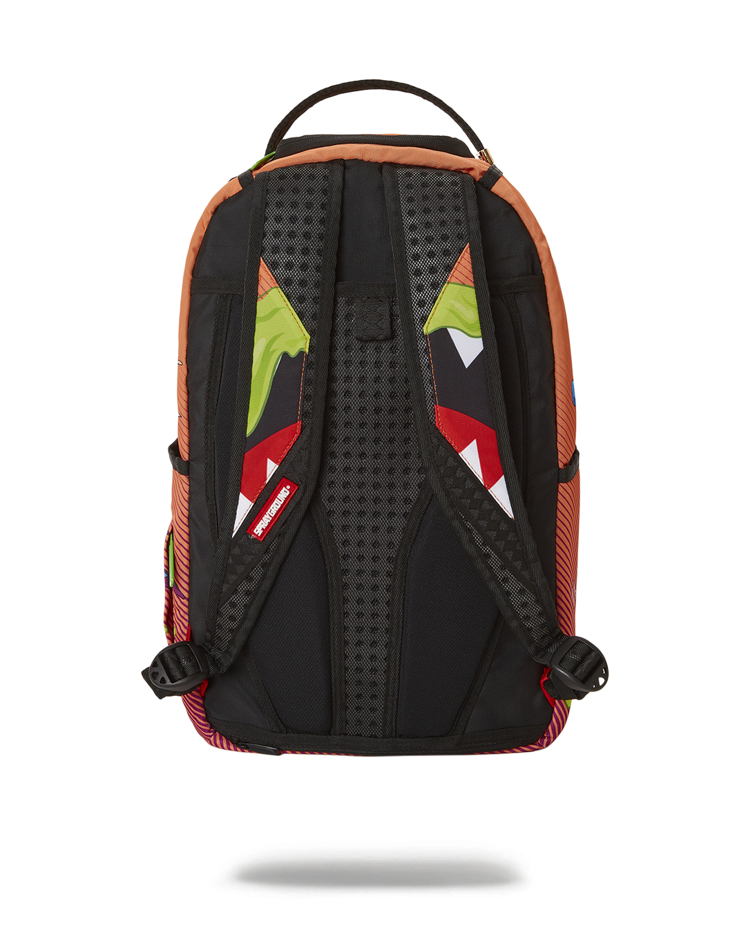 ExteriorDimensions: 18" x 6" x 11.5" • Front zipper pocket • Side pockets • Zippered Stash pocket • Separate velour sunglass compartment • Ergonomic mesh back padding • Adjustable Straps for custom sizing • Green zippers with metal hardware • Metal "Sprayground Authentic" badge • Slide through back sleeve connects to carry on luggage to free your hands