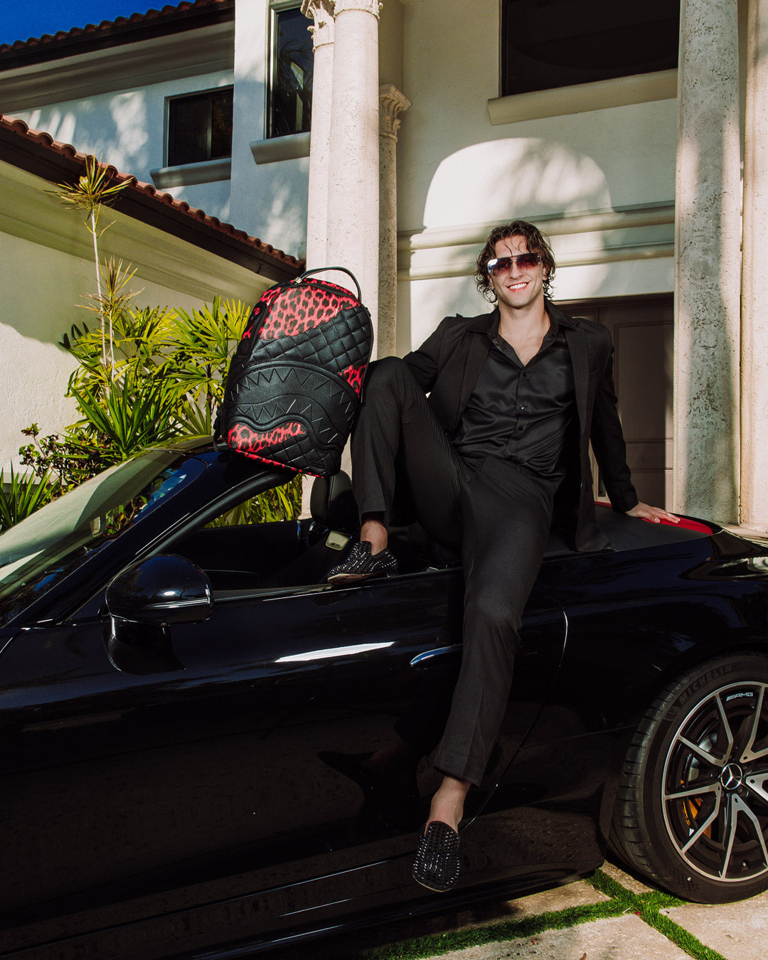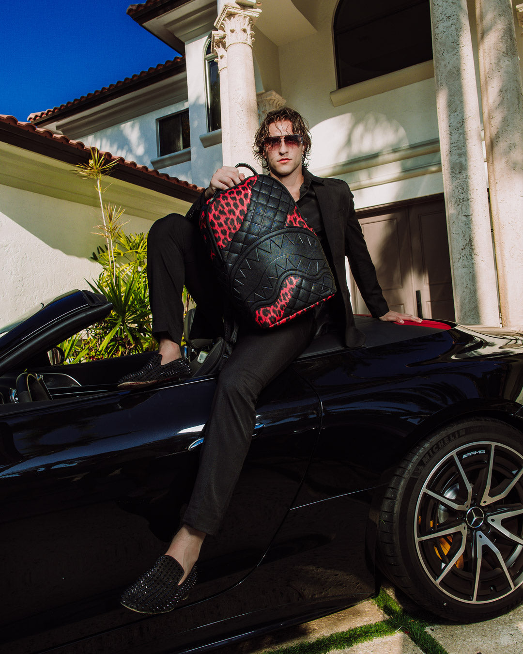 Dimensions: 18" x 6" x 11.5" • Front zipper pocket • Side pockets • Zippered Stash pocket • Separate velour sunglass compartment • Ergonomic mesh back padding • Adjustable Straps for custom sizing • Gold zippers with metal hardware • Metal "Sprayground Authentic" badge • Slide through back sleeve connects to carry-on luggage to free your hands