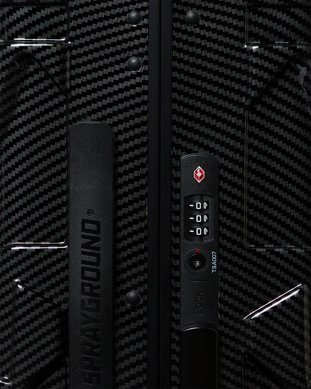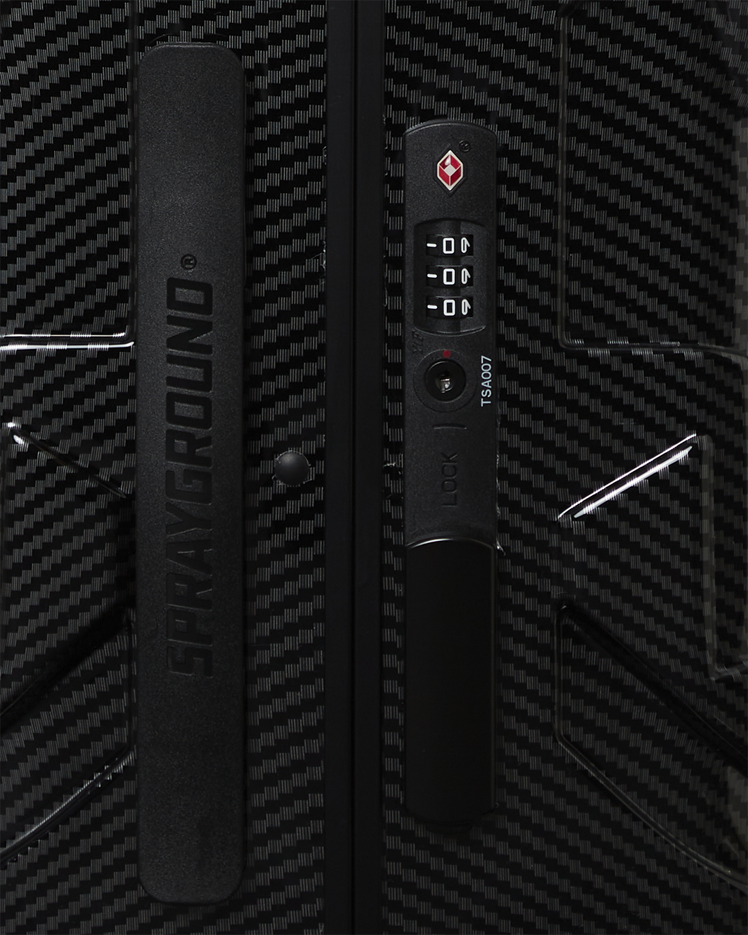 Faux carbon fiber carry-on luggage. Features an embossed sharkmouth.