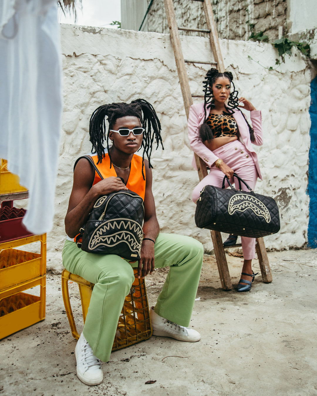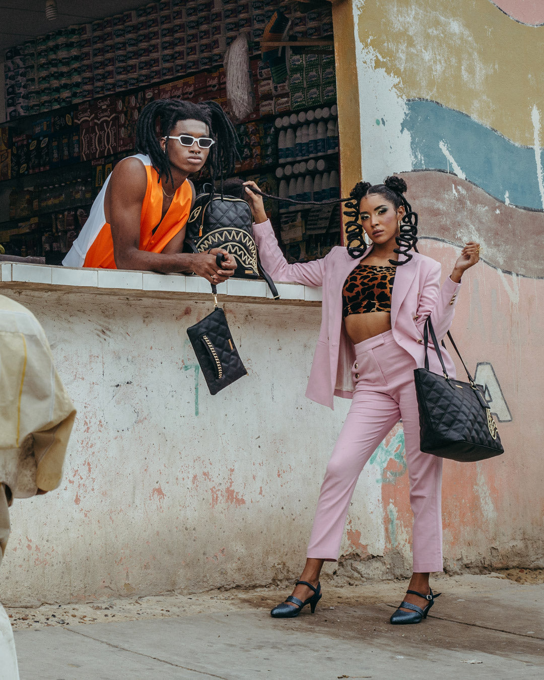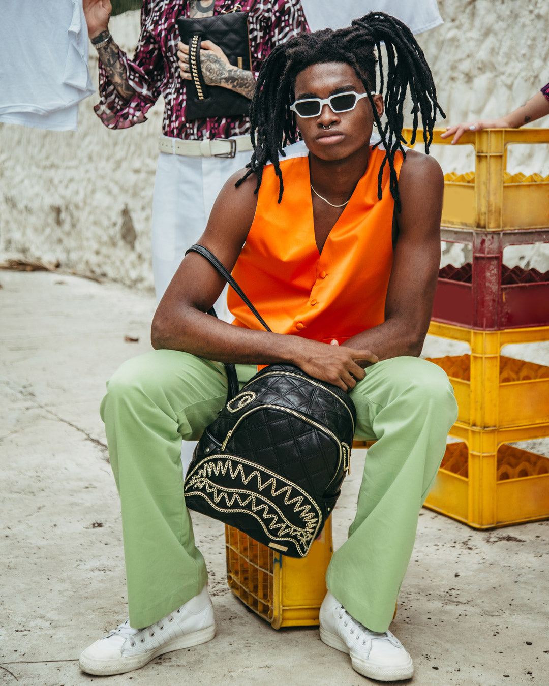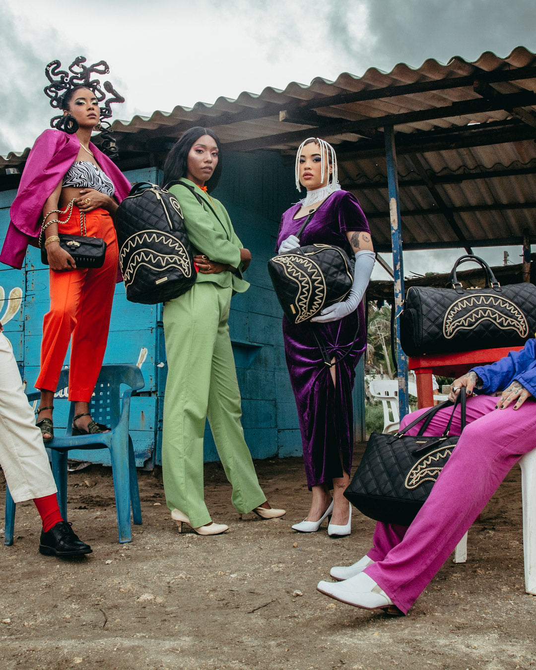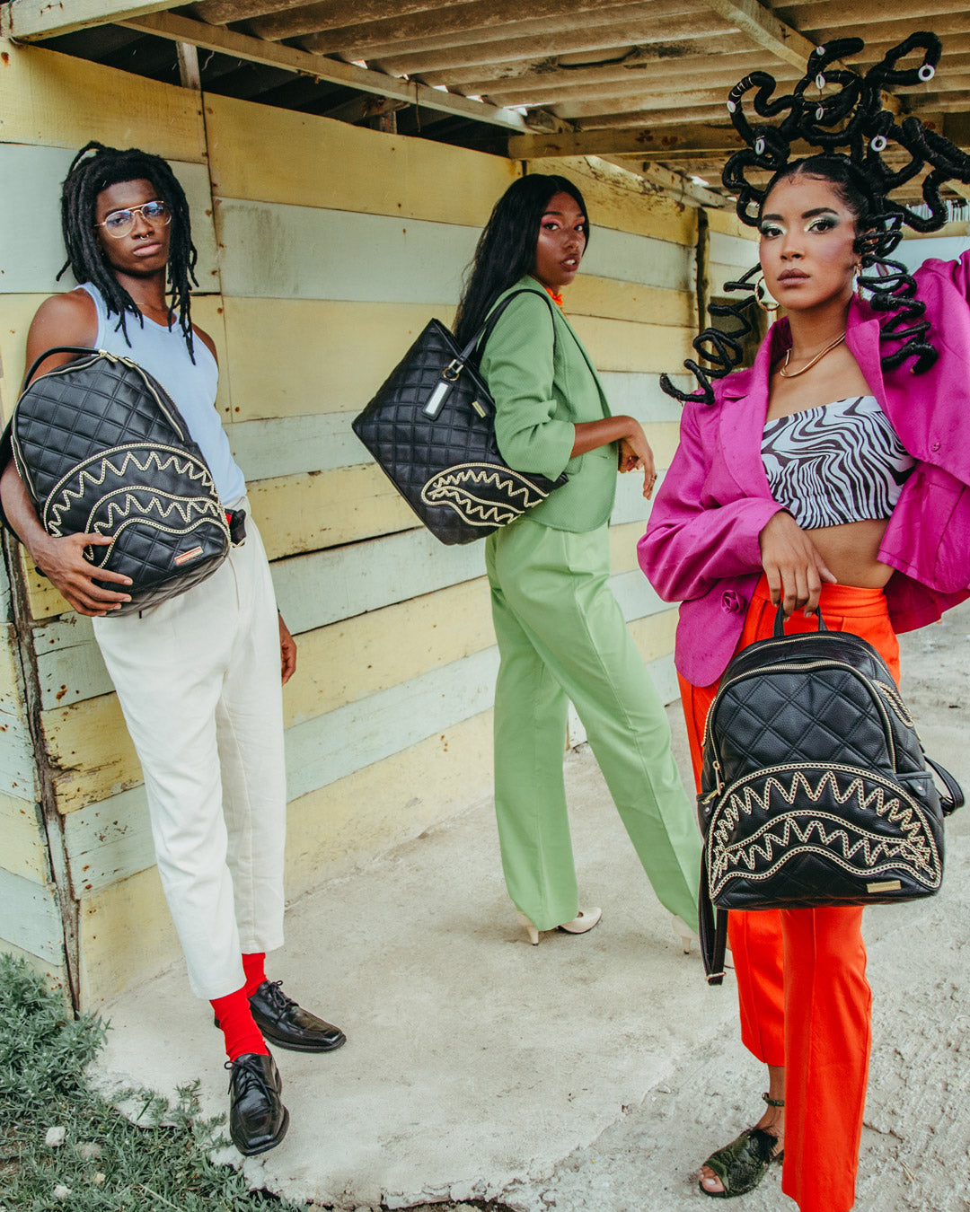 Dimensions: 10" x 5" x 11.5" • Two large main zippered compartments • Side pockets • Zippered Stash pocket • Adjustable straps for custom sizing • Gold zippers with metal hardware