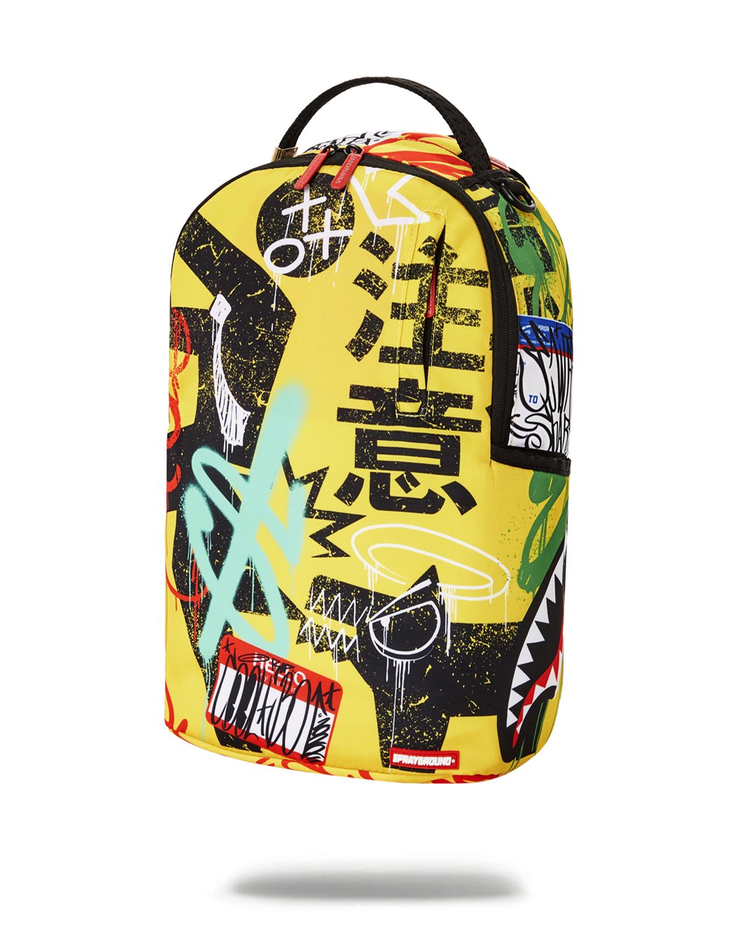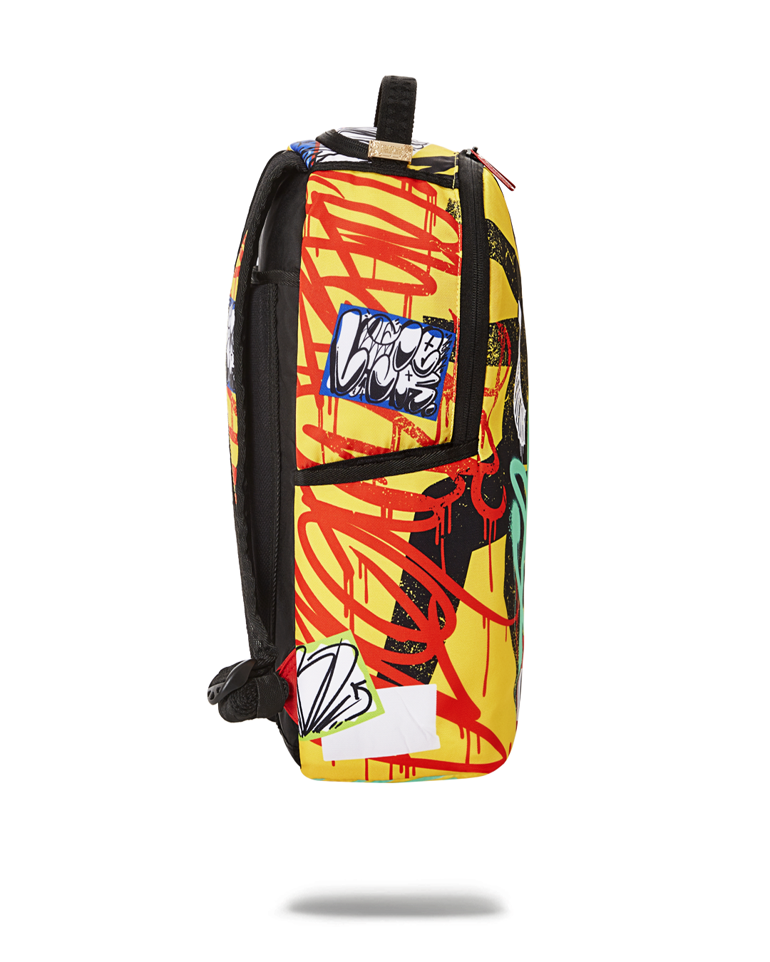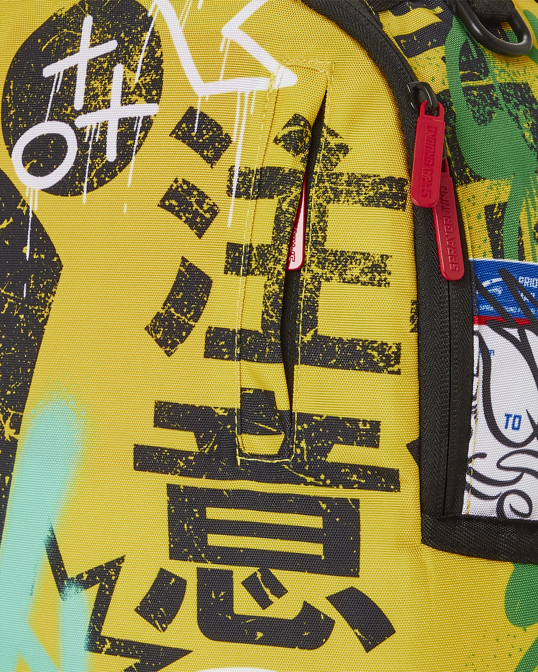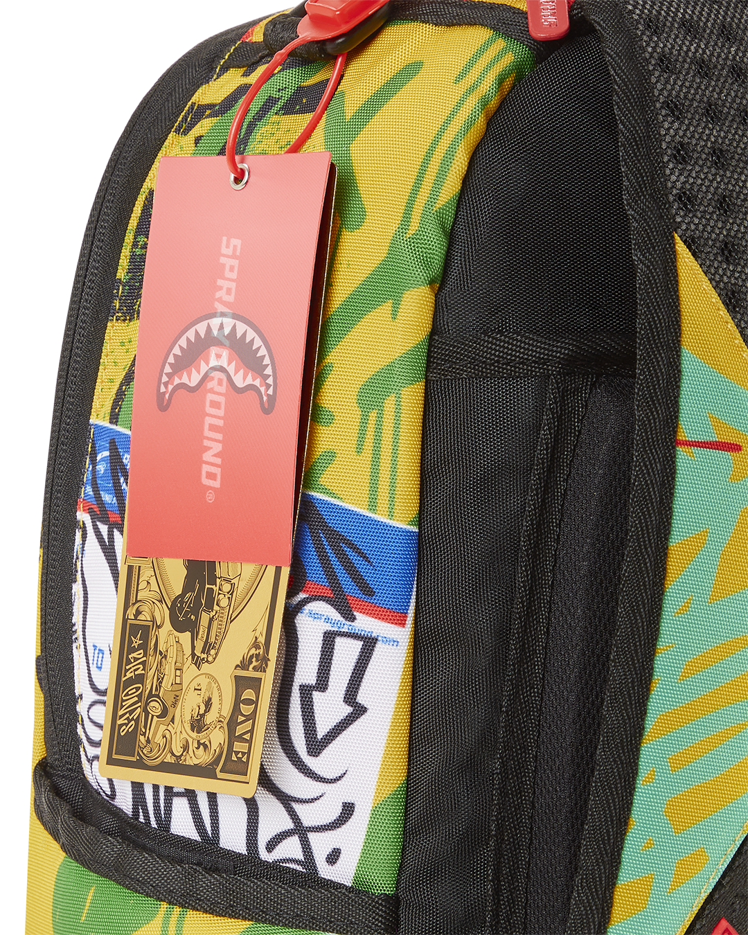 ExteriorDimensions: 18" x 6" x 11.5" • Front zipper pocket • Side pockets • Zippered Stash pocket • Separate velour sunglass compartment • Ergonomic mesh back padding • Adjustable Straps for custom sizing • Green zippers with metal hardware • Metal "Sprayground Authentic" badge • Slide through back sleeve connects to carry on luggage to free your hands
