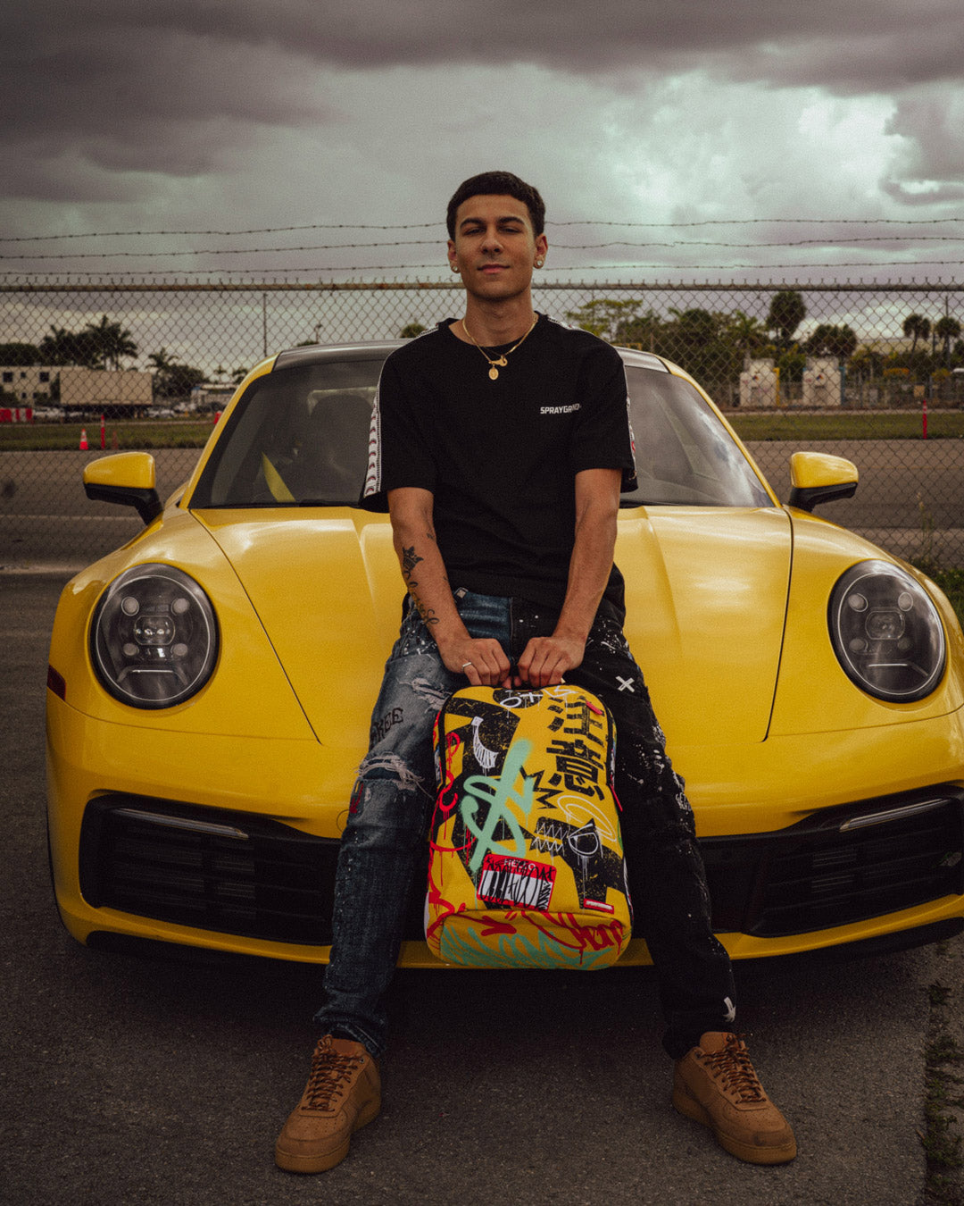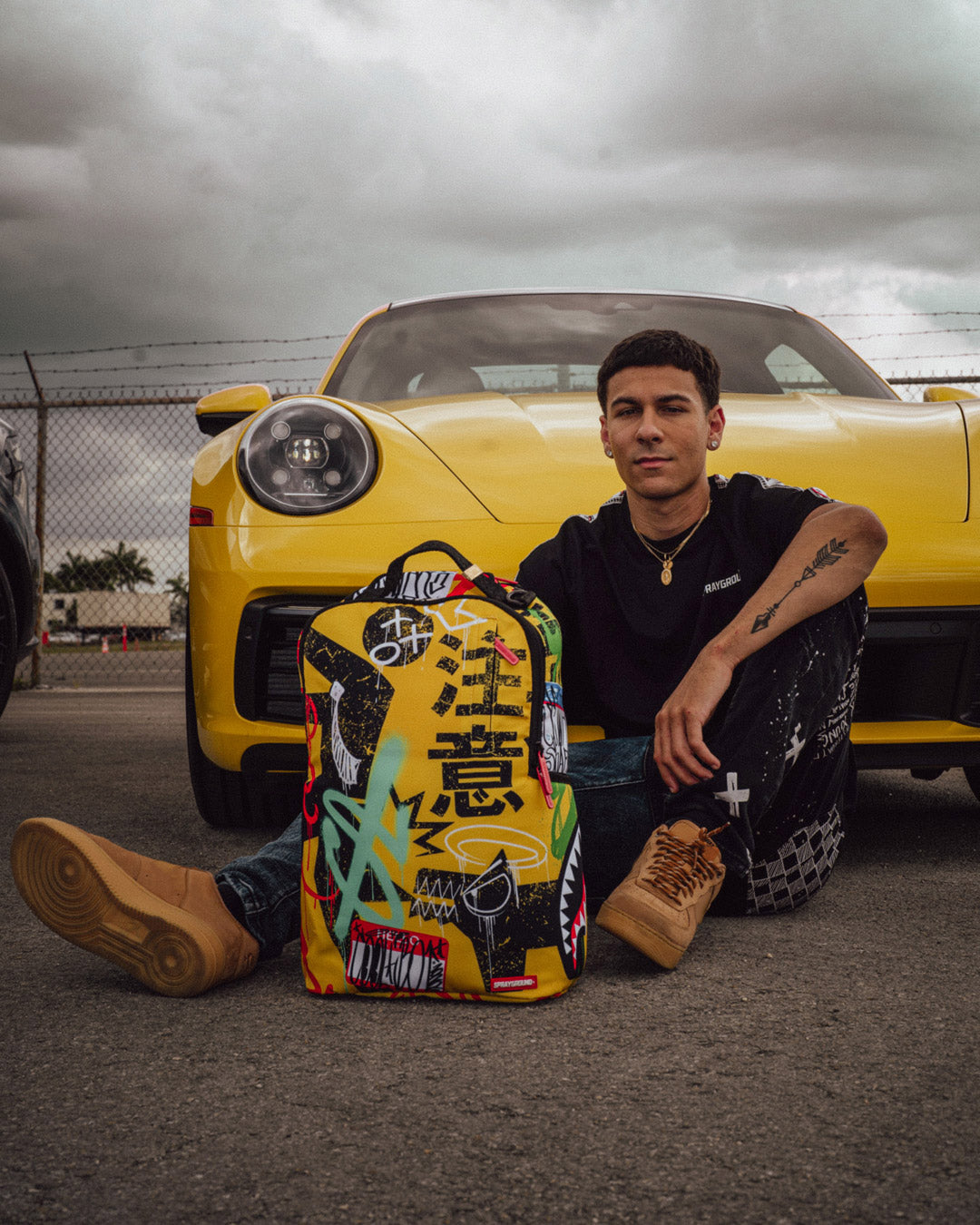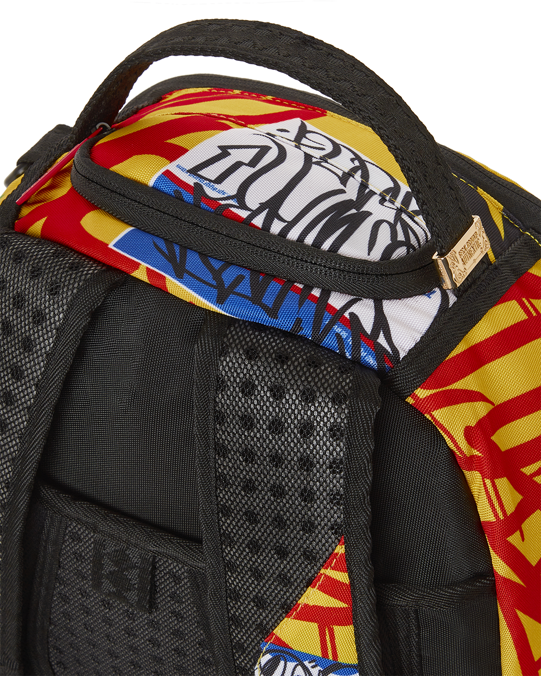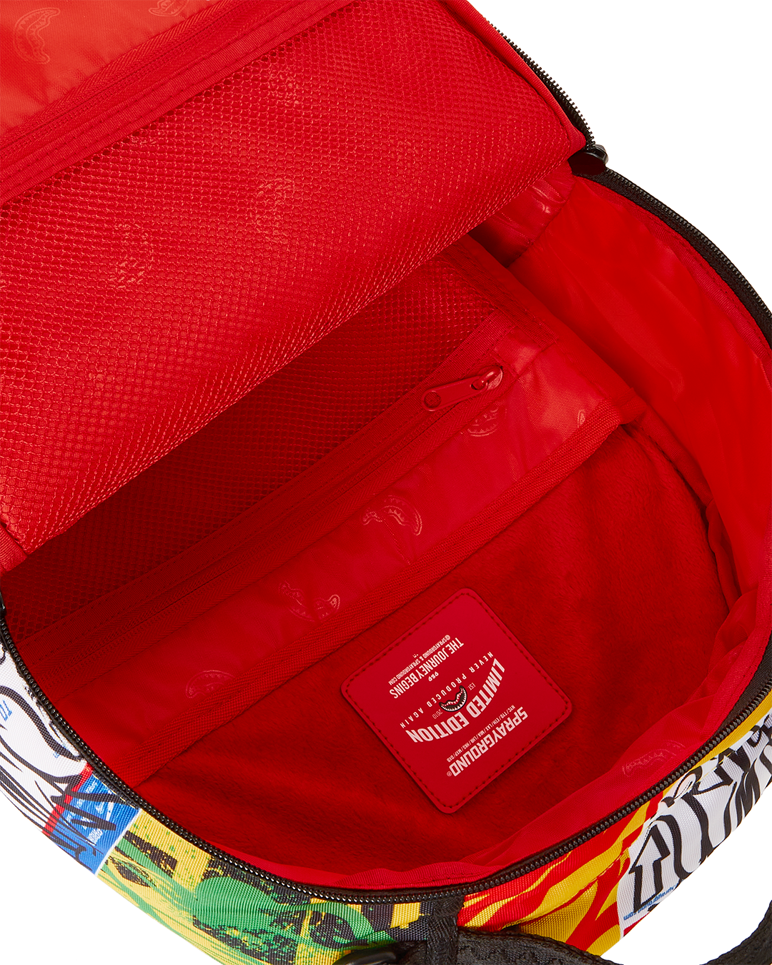 ExteriorDimensions: 18" x 6" x 11.5" • Front zipper pocket • Side pockets • Zippered Stash pocket • Separate velour sunglass compartment • Ergonomic mesh back padding • Adjustable Straps for custom sizing • Green zippers with metal hardware • Metal "Sprayground Authentic" badge • Slide through back sleeve connects to carry on luggage to free your hands