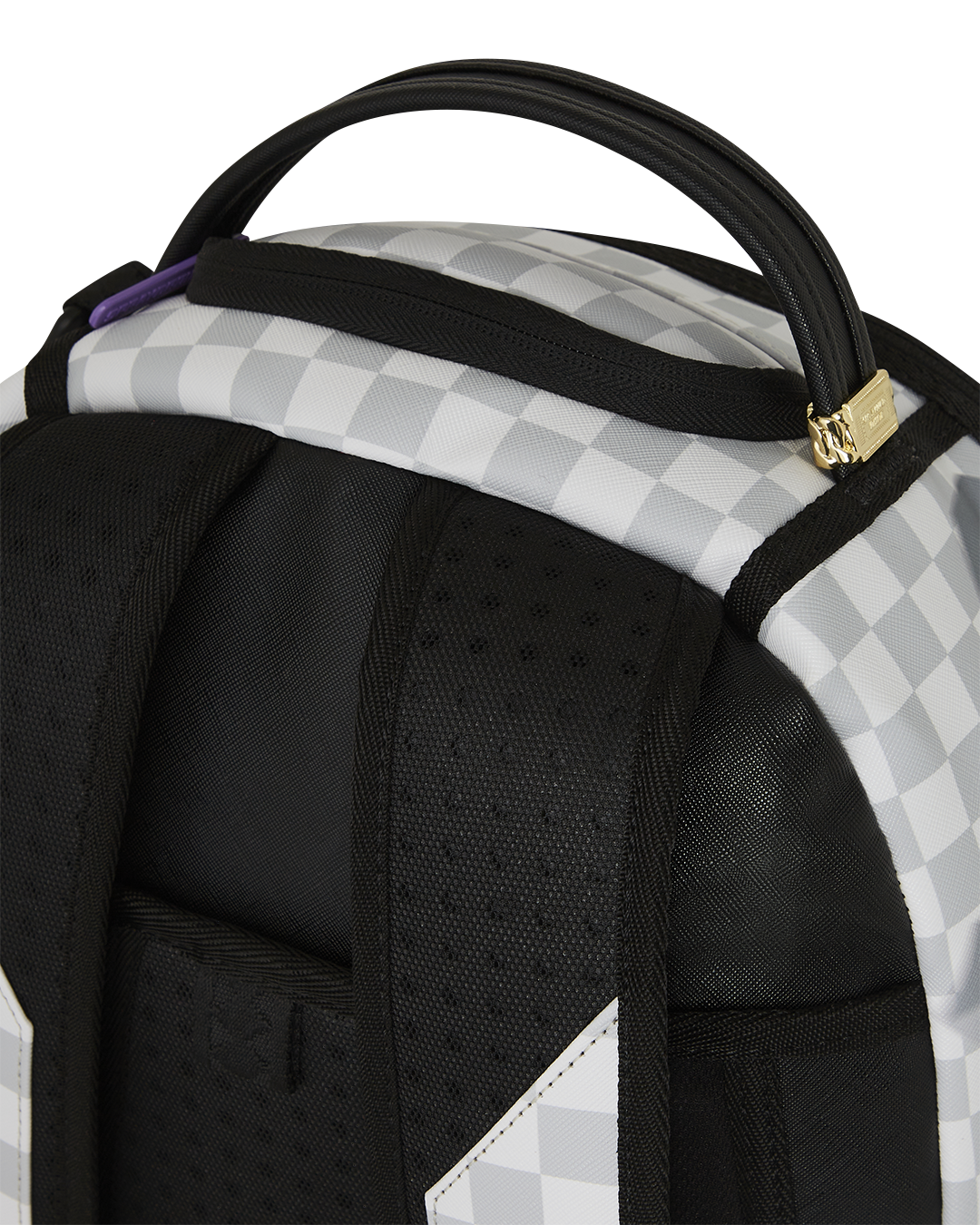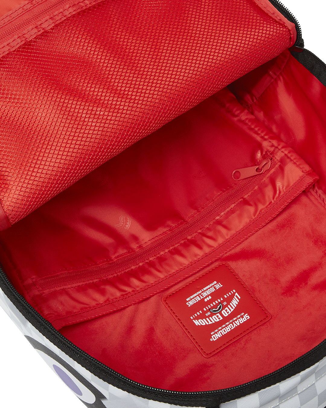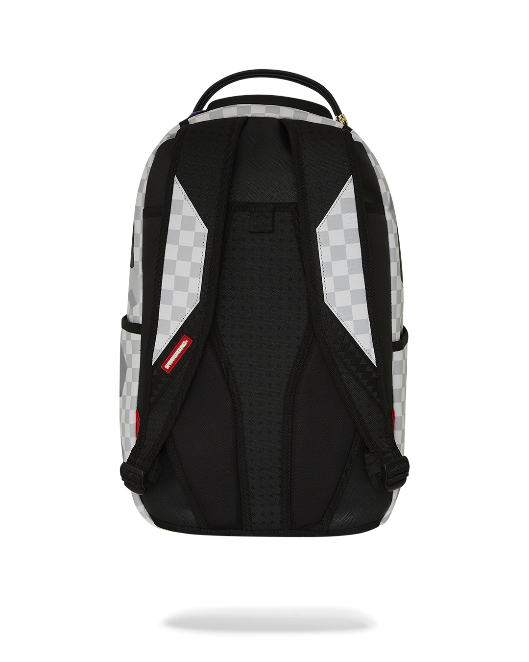 Dimensions: 18" x 6" x 11.5" • Front zipper pocket • Side pockets • Zippered Stash pocket • Separate velour sunglass compartment • Ergonomic mesh back padding • Adjustable Straps for custom sizing • Gold zippers with metal hardware • Metal "Sprayground Authentic" badge • Slide through back sleeve connects to carry-on luggage to free your hands