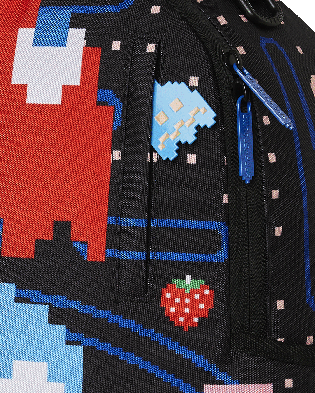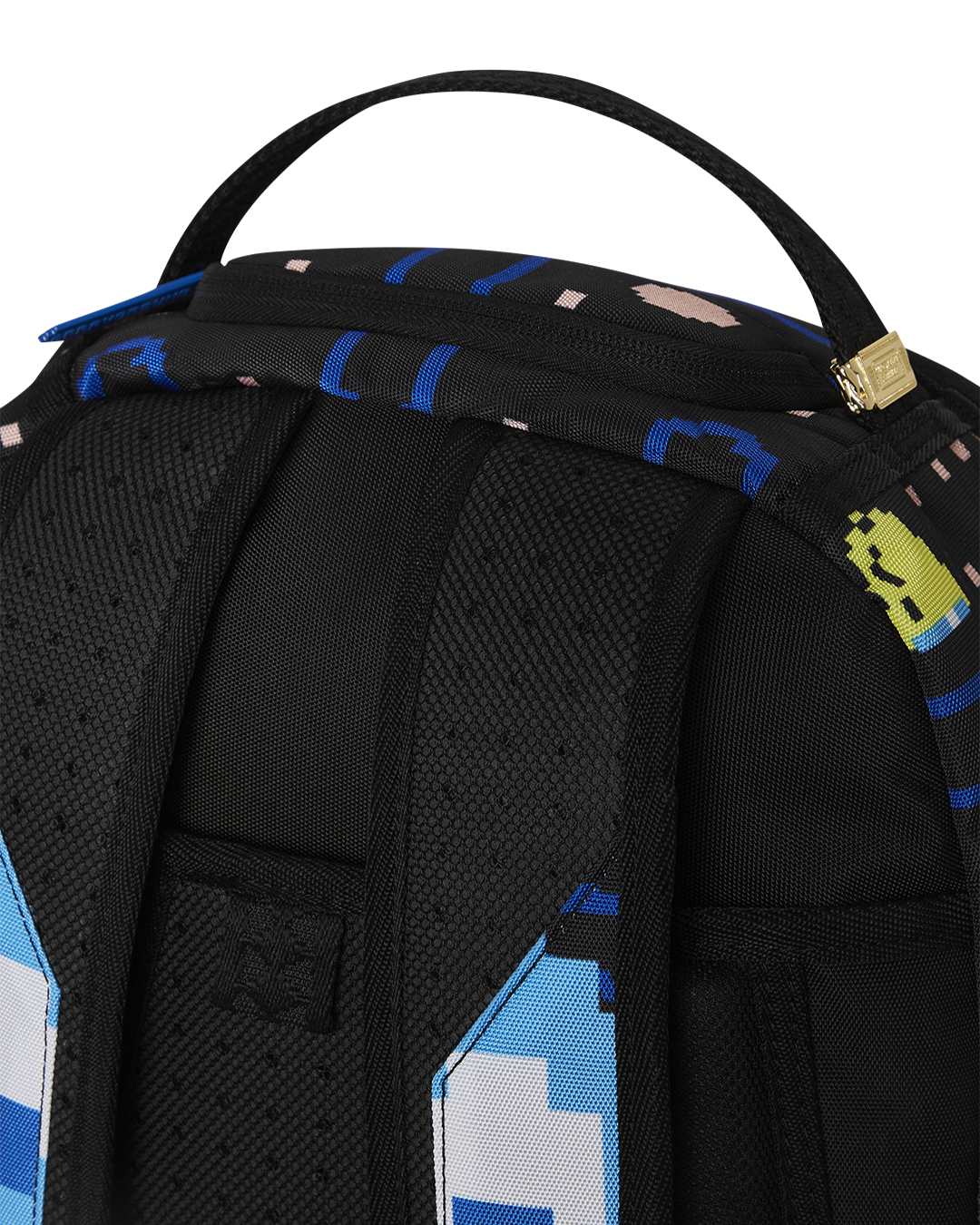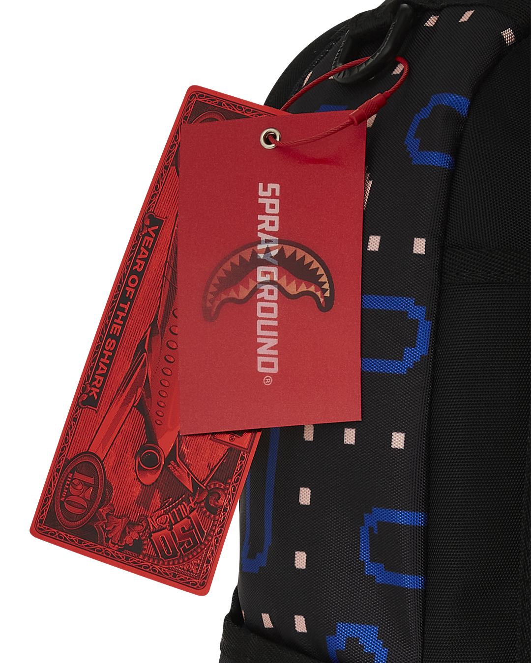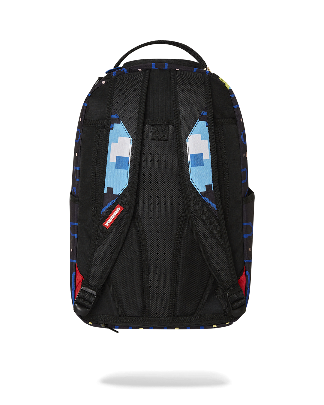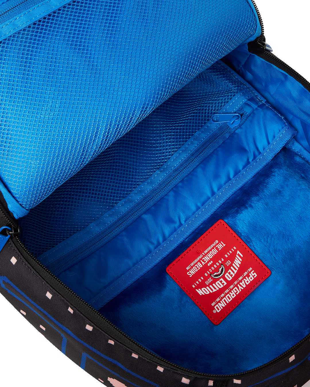 Dimensions: 18" x 6" x 11.5" • Front zipper pocket • Side pockets • Zippered Stash pocket • Separate velour sunglass compartment • Ergonomic mesh back padding • Adjustable Straps for custom sizing • Gold zippers with metal hardware • Metal "Sprayground Authentic" badge • Slide through back sleeve connects to carry-on luggage to free your hands