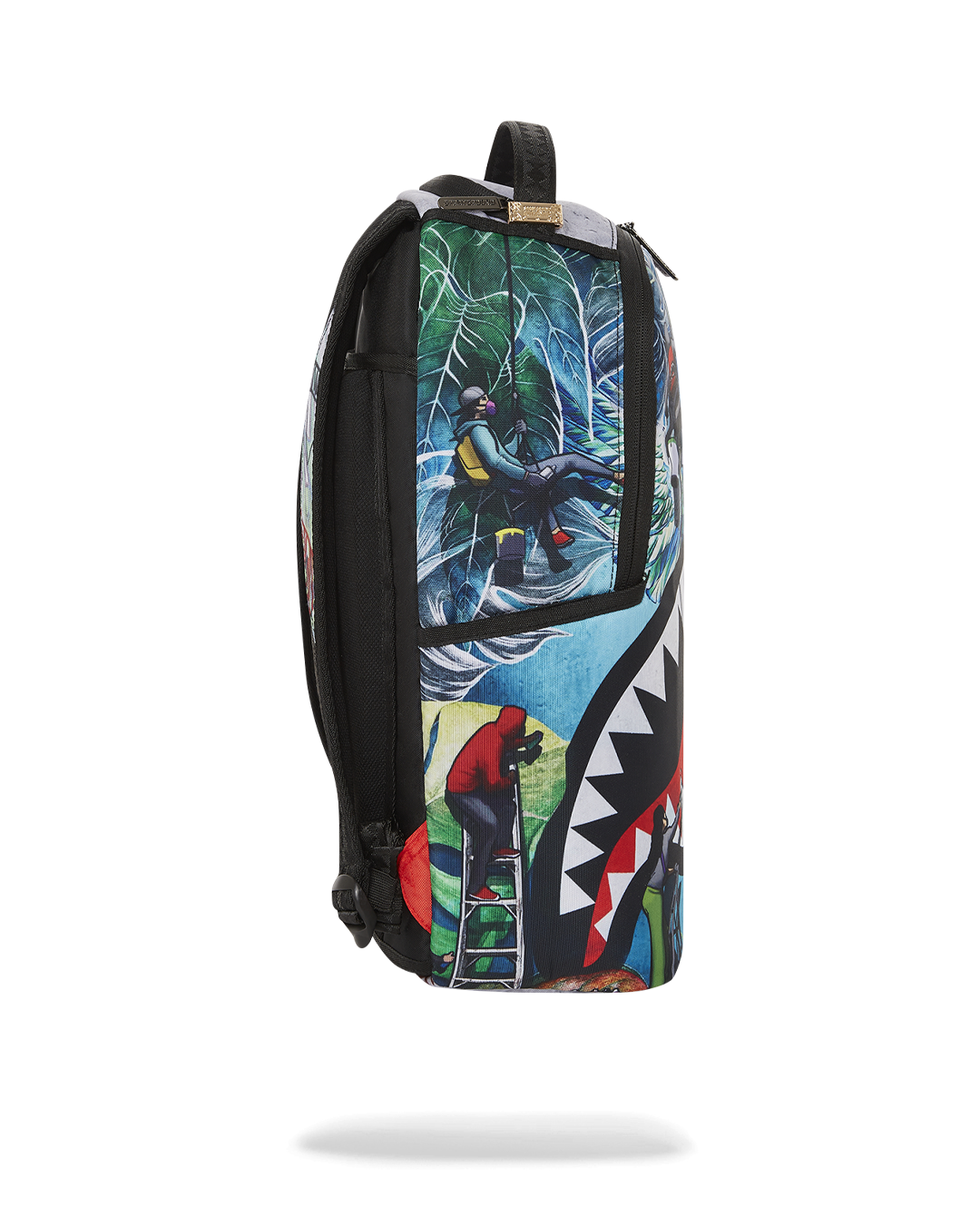 Dimensions: 18" x 6" x 11.5" • Front zipper pocket • Side pockets • Zippered Stash pocket • Separate velour sunglass compartment • Ergonomic mesh back padding • Adjustable Straps for custom sizing • Gold zippers with metal hardware • Metal "Sprayground Authentic" badge • Slide through back sleeve connects to carry-on luggage to free your hands