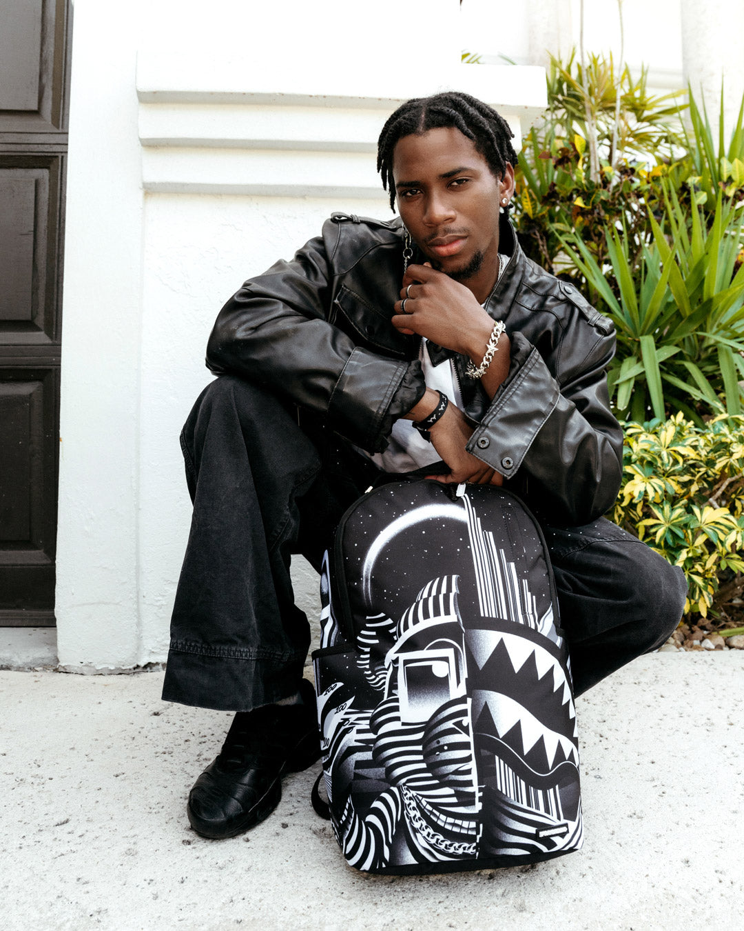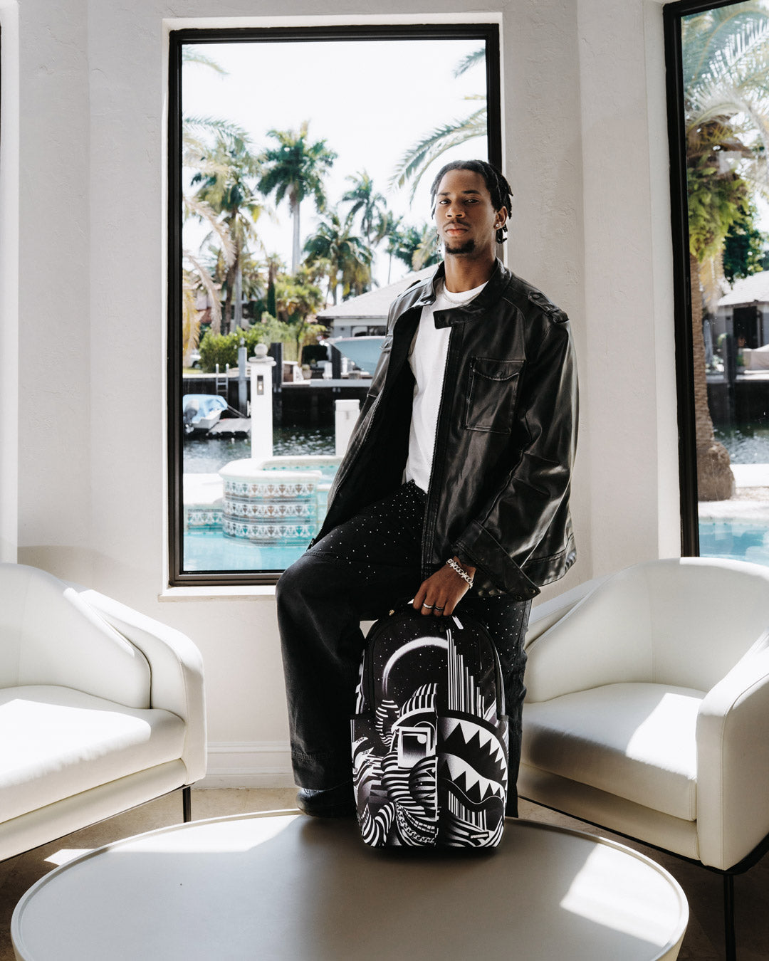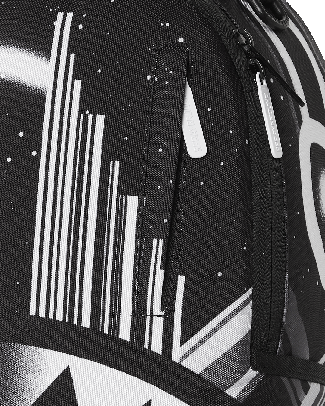 Dimensions: 18" x 6" x 11.5" • Front zipper pocket • Side pockets • Zippered Stash pocket • Separate velour sunglass compartment • Ergonomic mesh back padding • Adjustable Straps for custom sizing • Gold zippers with metal hardware • Metal "Sprayground Authentic" badge • Slide through back sleeve connects to carry-on luggage to free your hands