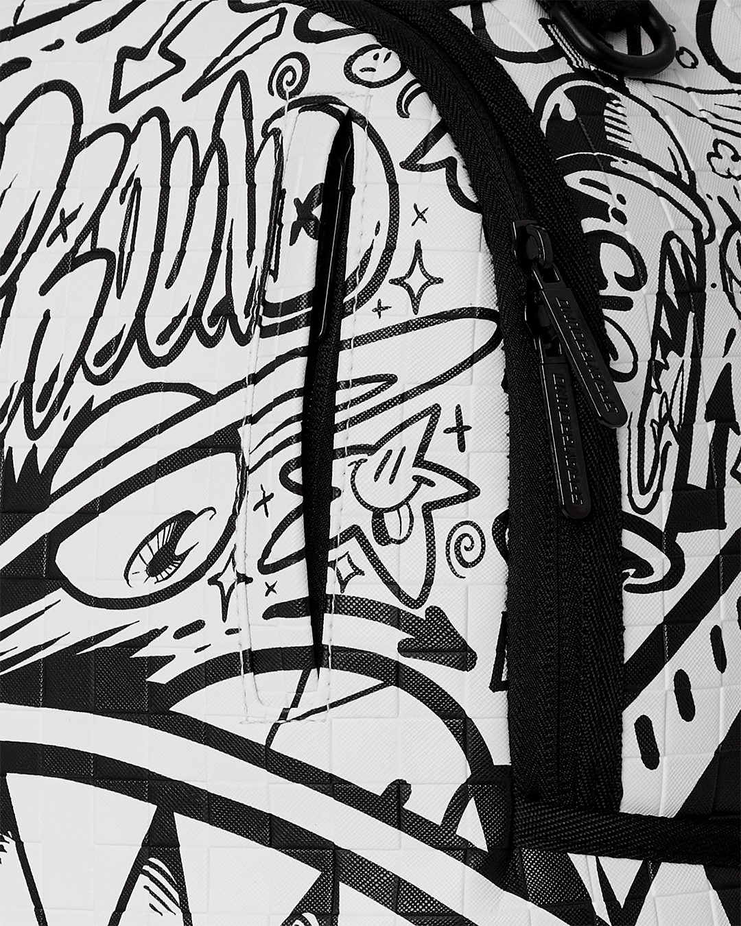 Embossed Check Pattern. Dimensions: 18" x 6" x 11.5" • Front zipper pocket • Side pockets • Zippered Stash pocket • Separate velour sunglass compartment • Ergonomic mesh back padding • Adjustable Straps for custom sizing • Gold zippers with metal hardware • Metal "Sprayground Authentic" badge • Slide through back sleeve connects to carry-on luggage to free your hands