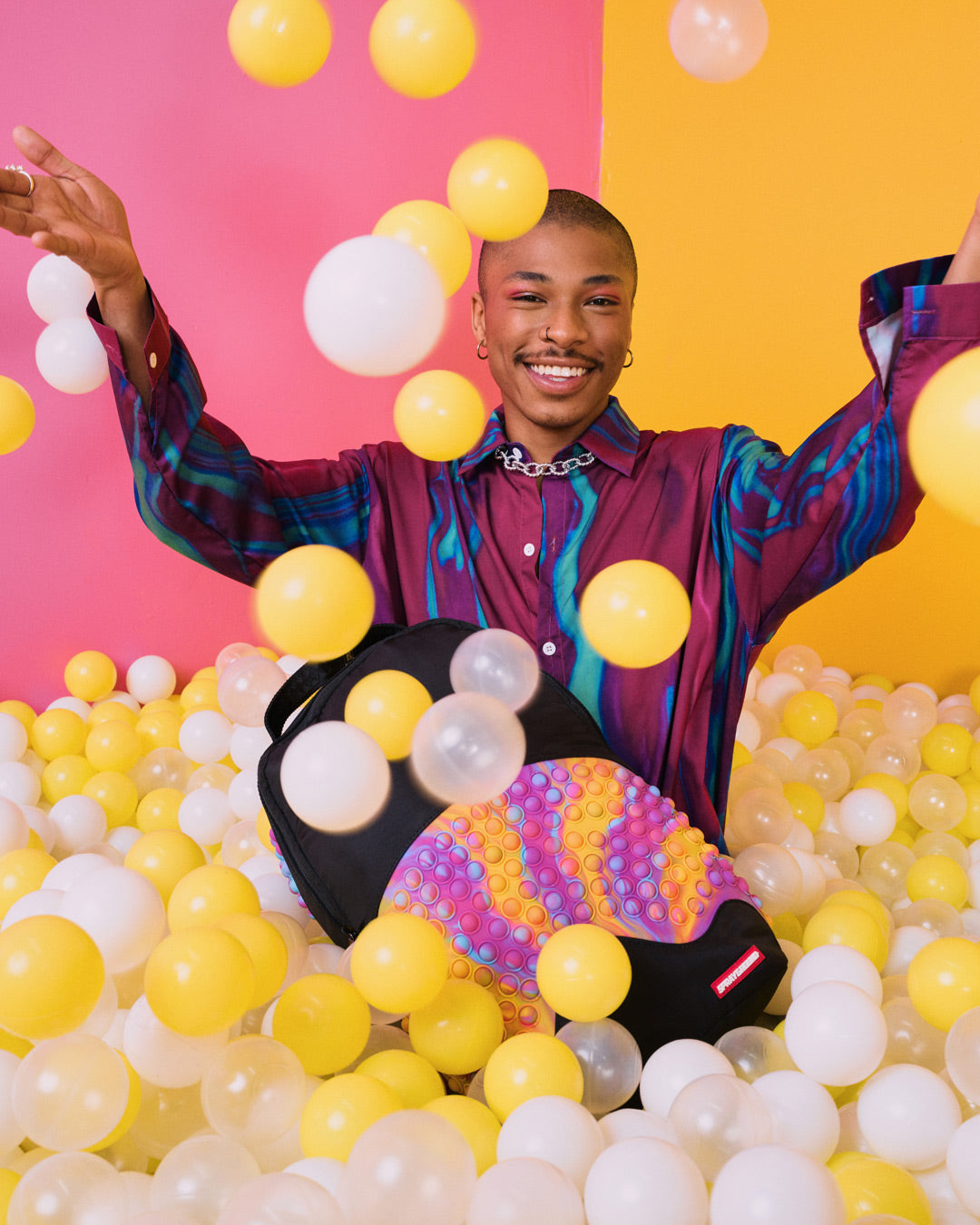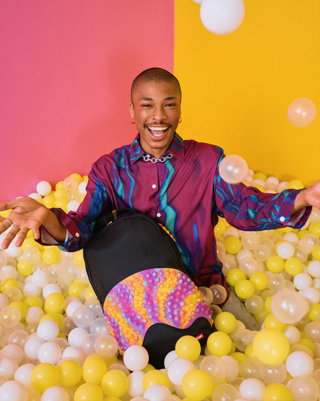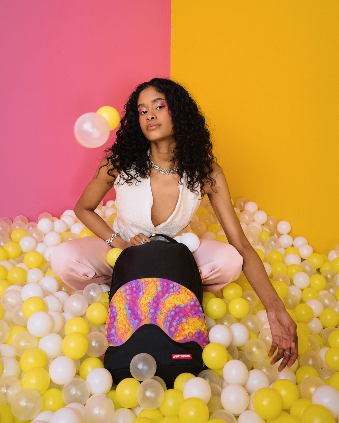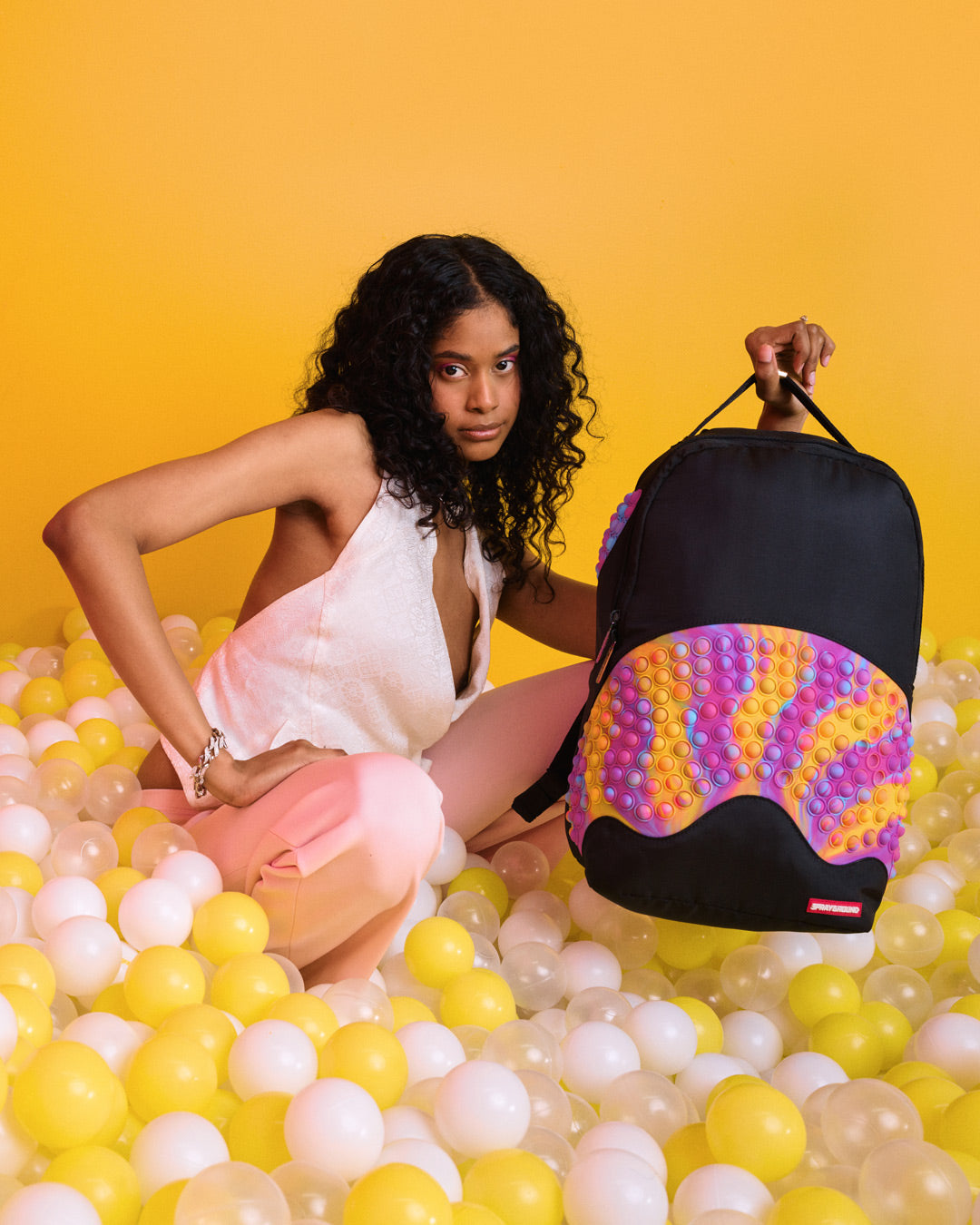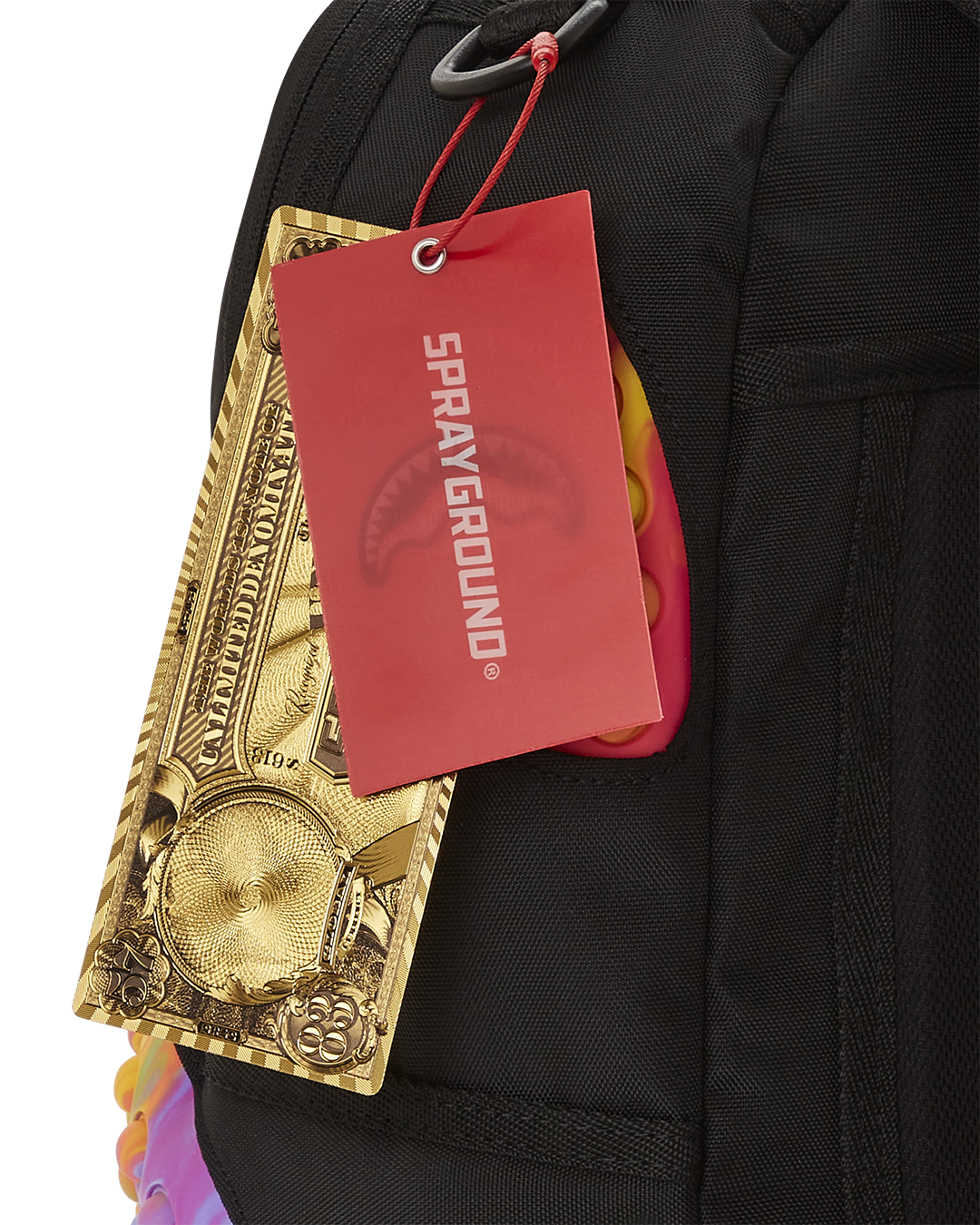 Dimensions: 18" x 6" x 11.5" • Front zipper pocket • Side pockets • Zippered Stash pocket • Separate velour sunglass compartment • Ergonomic mesh back padding • Adjustable Straps for custom sizing • Gold zippers with metal hardware • Metal "Sprayground Authentic" badge • Slide through back sleeve connects to carry-on luggage to free your hands