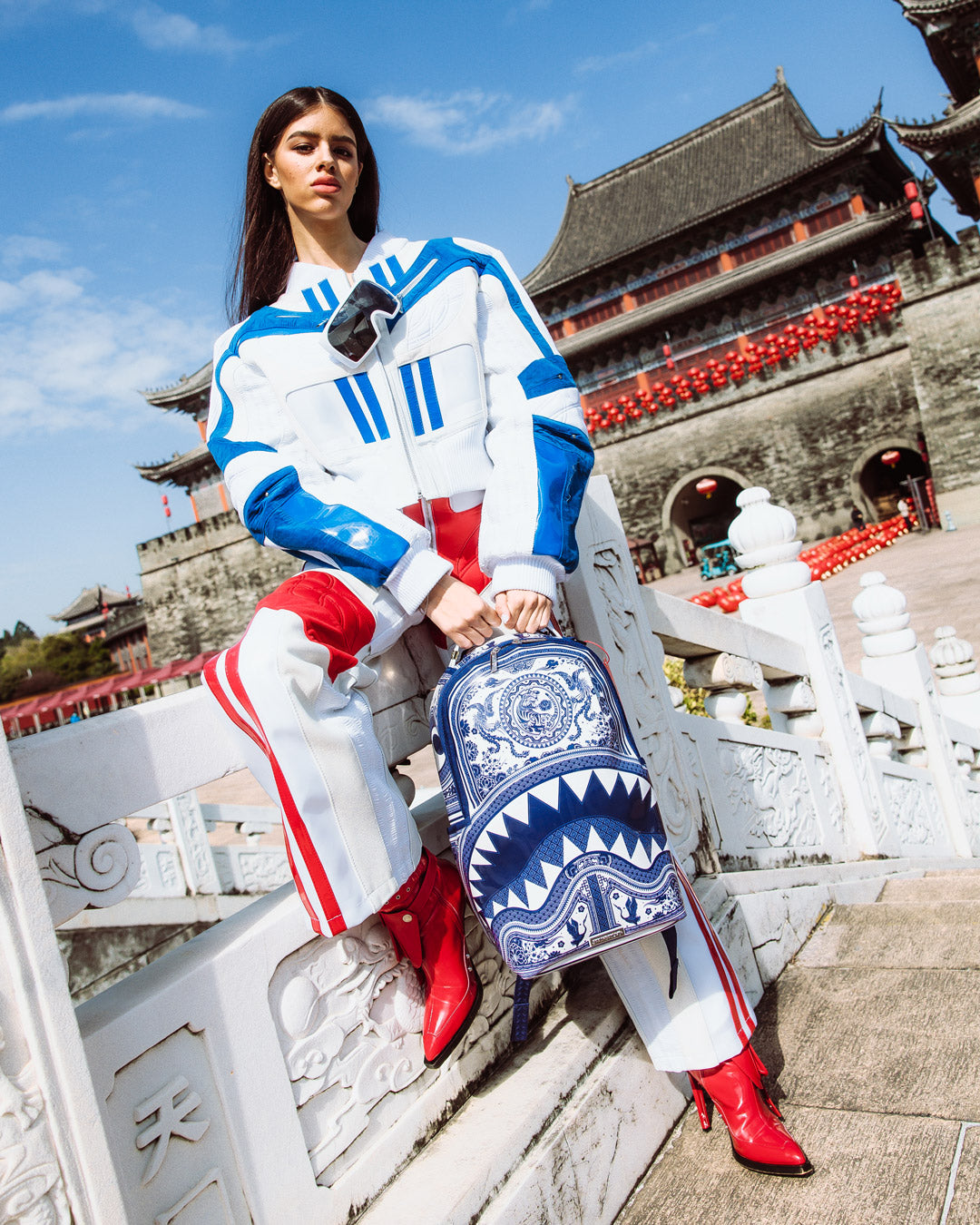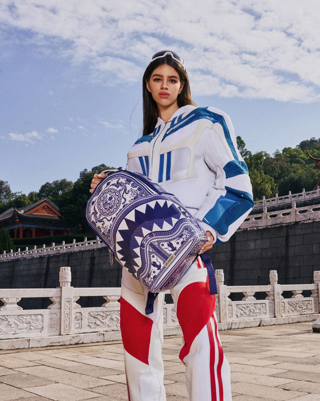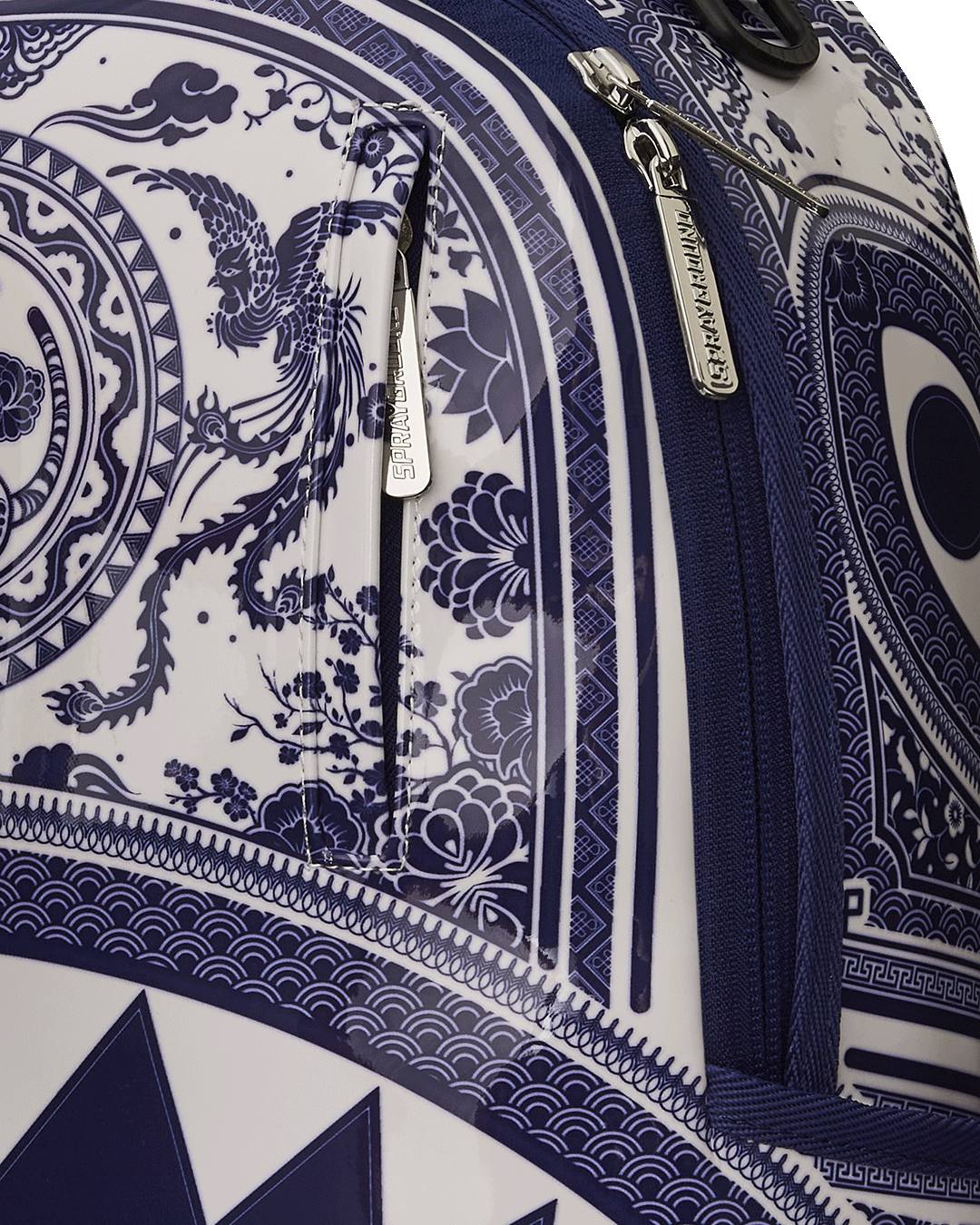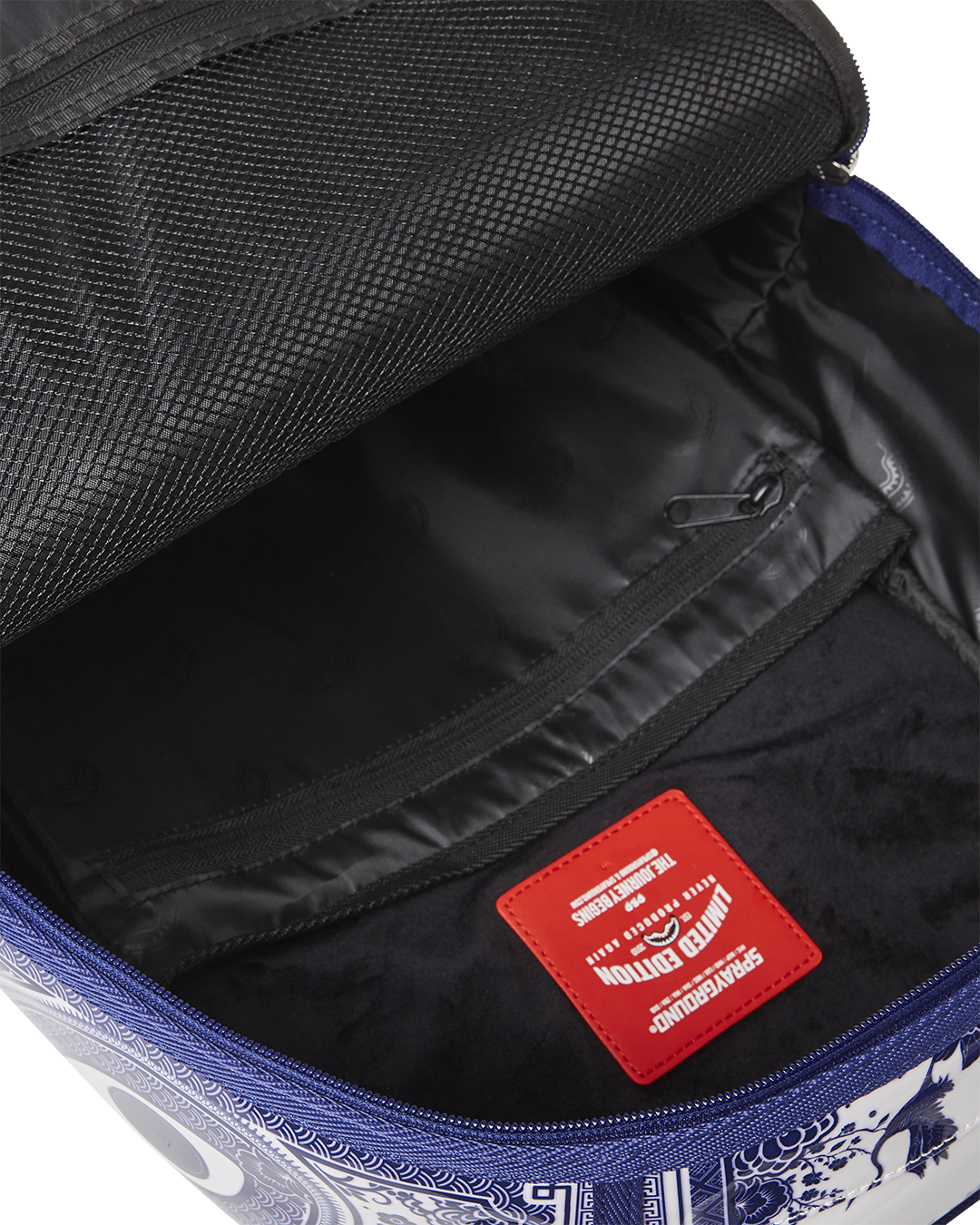 Dimensions: 18" x 6" x 11.5" • Front zipper pocket • Side pockets • Zippered Stash pocket • Separate velour sunglass compartment • Ergonomic mesh back padding • Adjustable Straps for custom sizing • Gold zippers with metal hardware • Metal "Sprayground Authentic" badge • Slide through back sleeve connects to carry-on luggage to free your hands