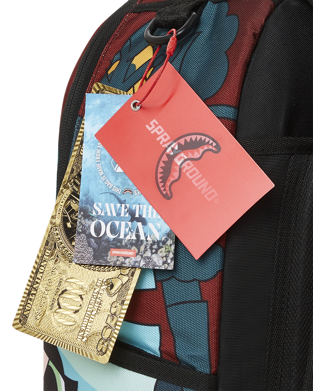 Dimensions: 18" x 6" x 11.5" • Front zipper pocket • Side pockets • Zippered Stash pocket • Separate velour sunglass compartment • Ergonomic mesh back padding • Adjustable Straps for custom sizing • Gold zippers with metal hardware • Metal "Sprayground Authentic" badge • Slide through back sleeve connects to carry-on luggage to free your hands