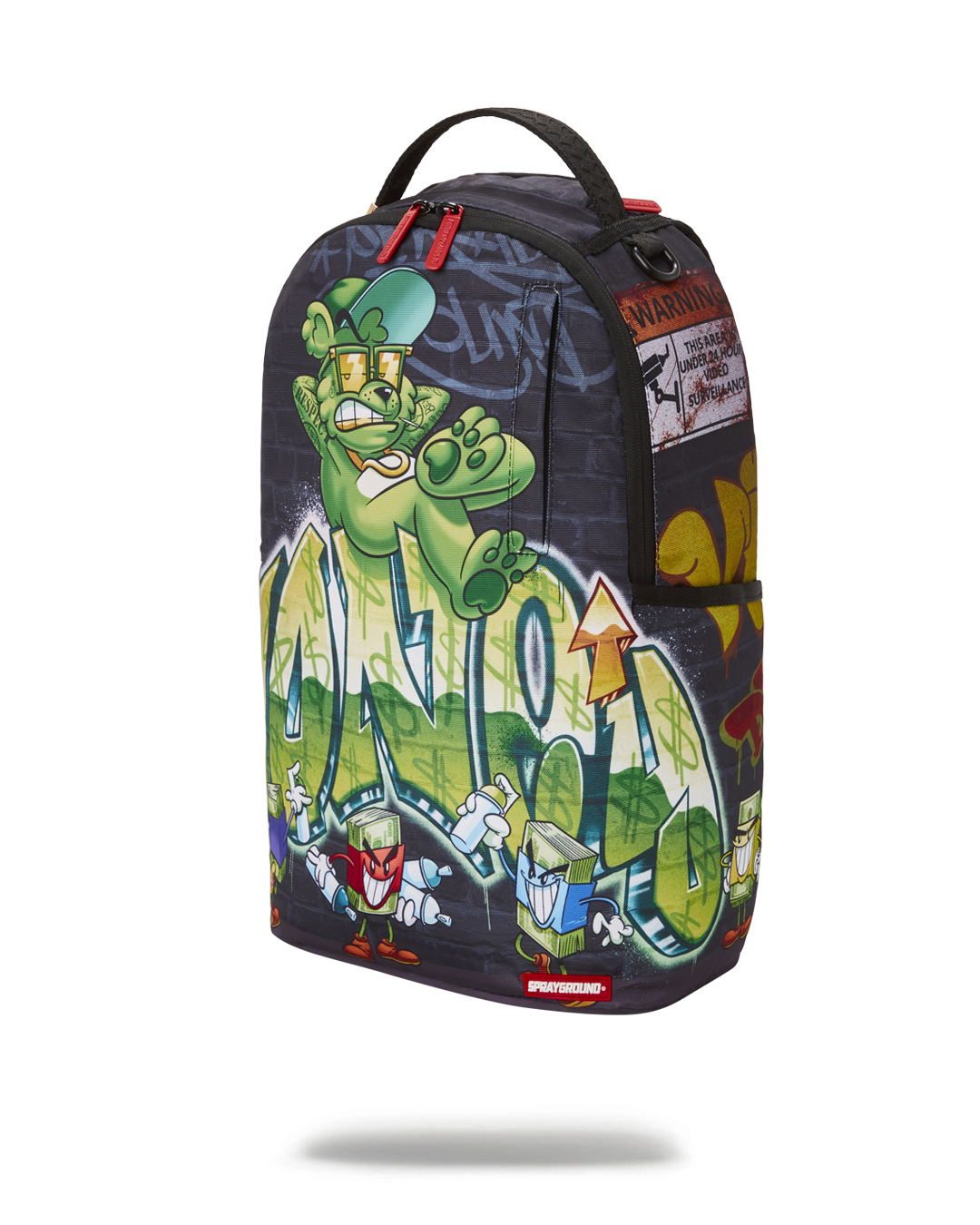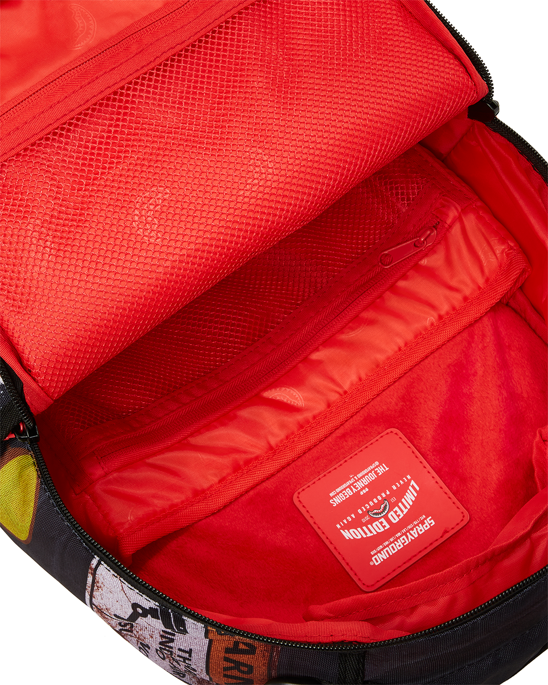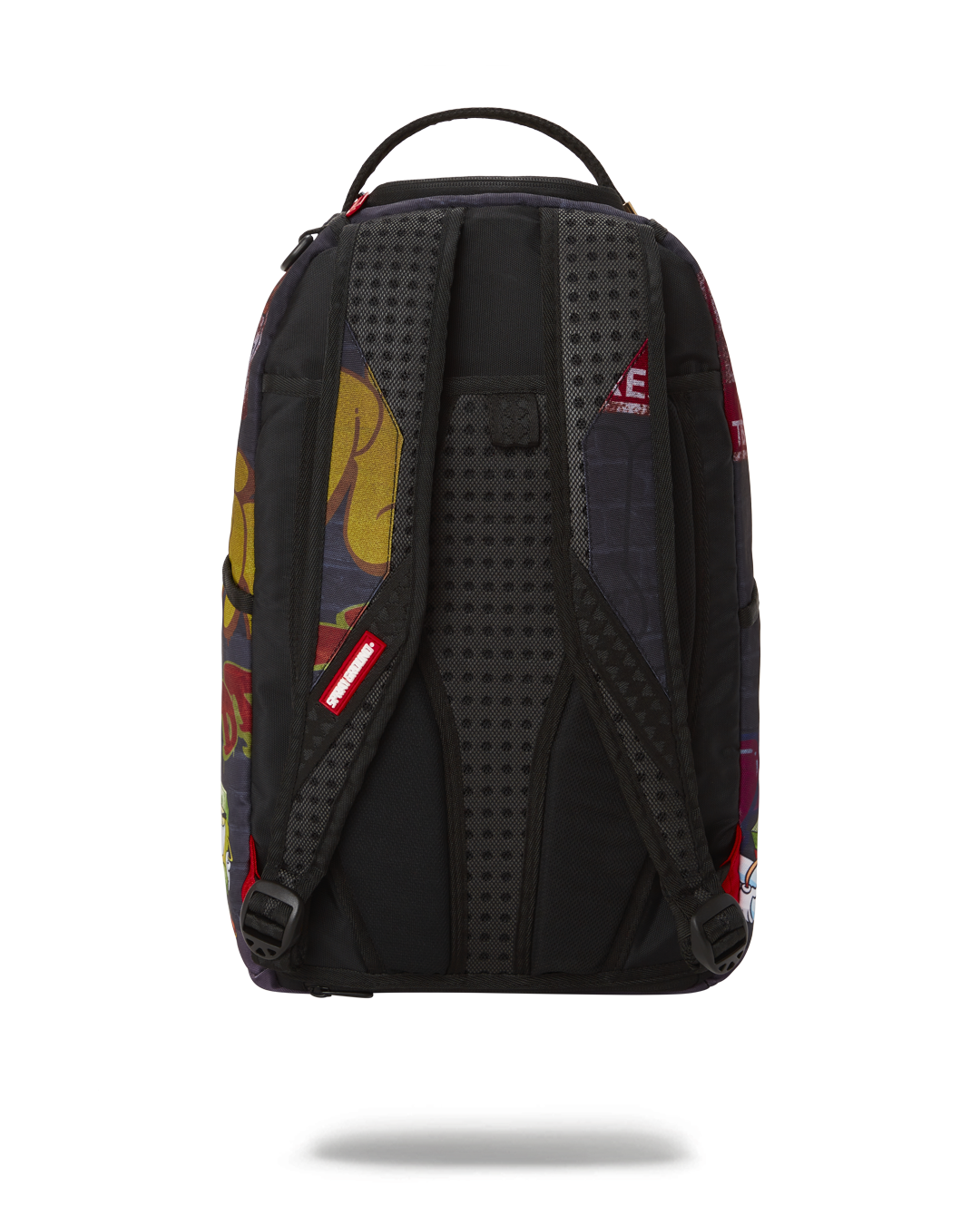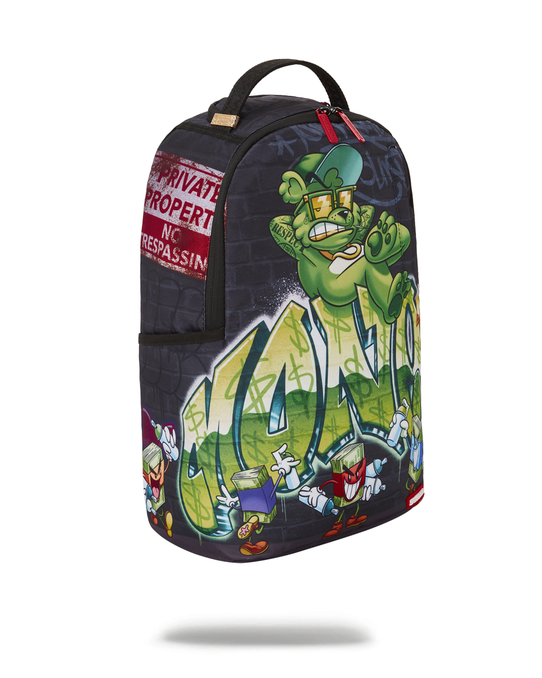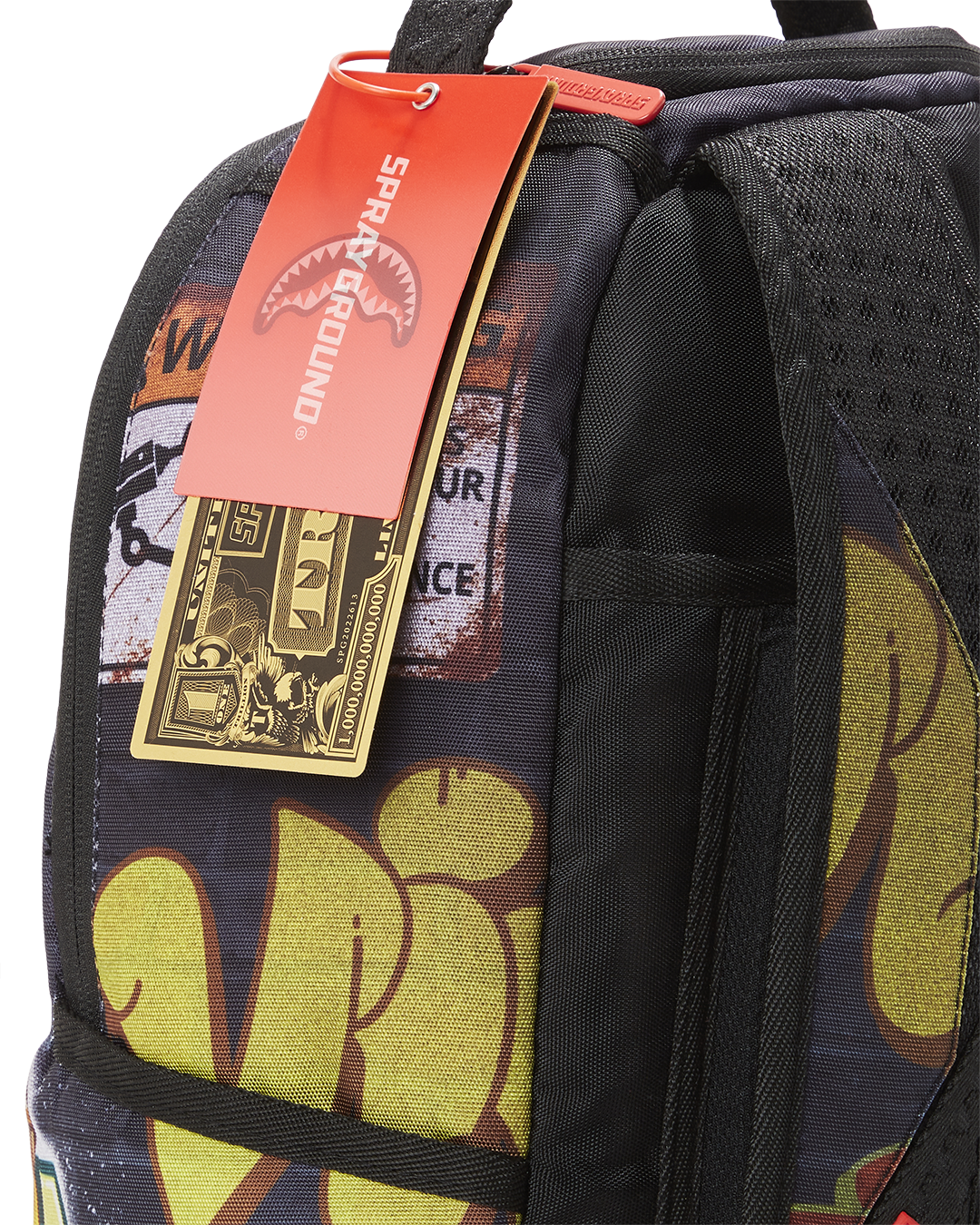 ExteriorDimensions: 18" x 6" x 11.5" • Front zipper pocket • Side pockets • Zippered Stash pocket • Separate velour sunglass compartment • Ergonomic mesh back padding • Adjustable Straps for custom sizing • Green zippers with metal hardware • Metal "Sprayground Authentic" badge • Slide through back sleeve connects to carry on luggage to free your hands