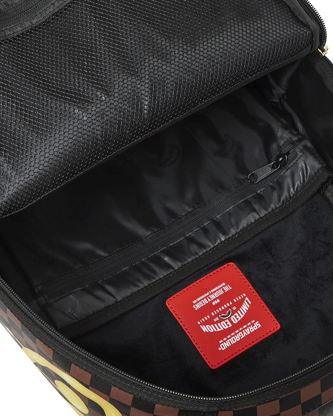Dimensions: 18" x 6" x 11.5" • Front zipper pocket • Side pockets • Zippered Stash pocket • Separate velour sunglass compartment • Ergonomic mesh back padding • Adjustable Straps for custom sizing • Gold zippers with metal hardware • Metal "Sprayground Authentic" badge • Slide through back sleeve connects to carry-on luggage to free your hands