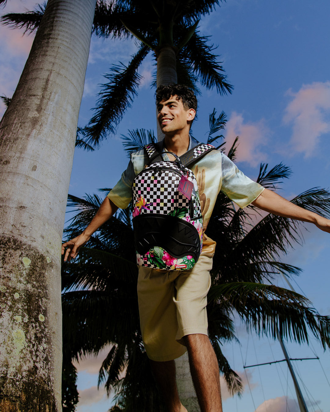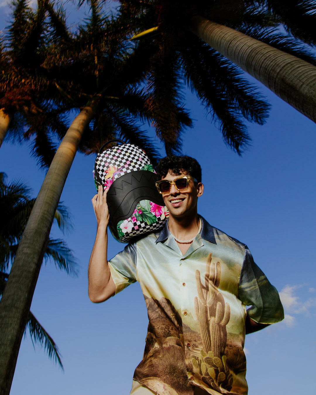 Dimensions: 18" x 6" x 11.5" • Front zipper pocket • Side pockets • Zippered Stash pocket • Separate velour sunglass compartment • Ergonomic mesh back padding • Adjustable Straps for custom sizing • Gold zippers with metal hardware • Metal "Sprayground Authentic" badge • Slide through back sleeve connects to carry-on luggage to free your hands
