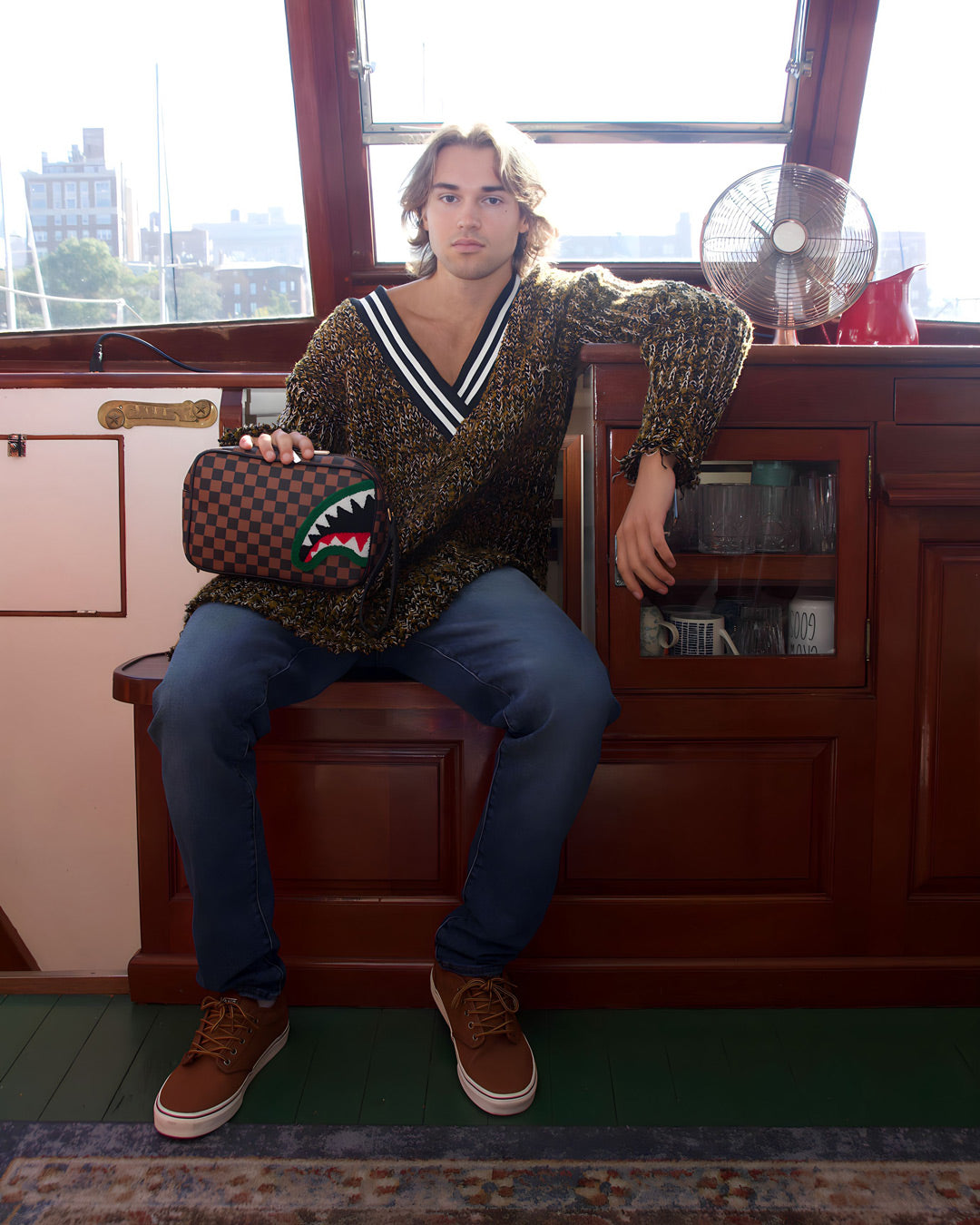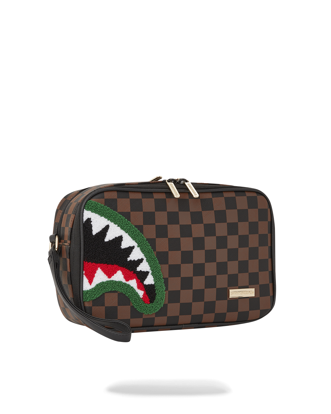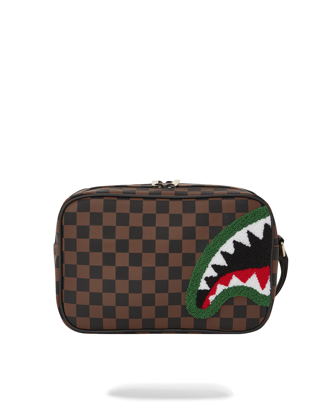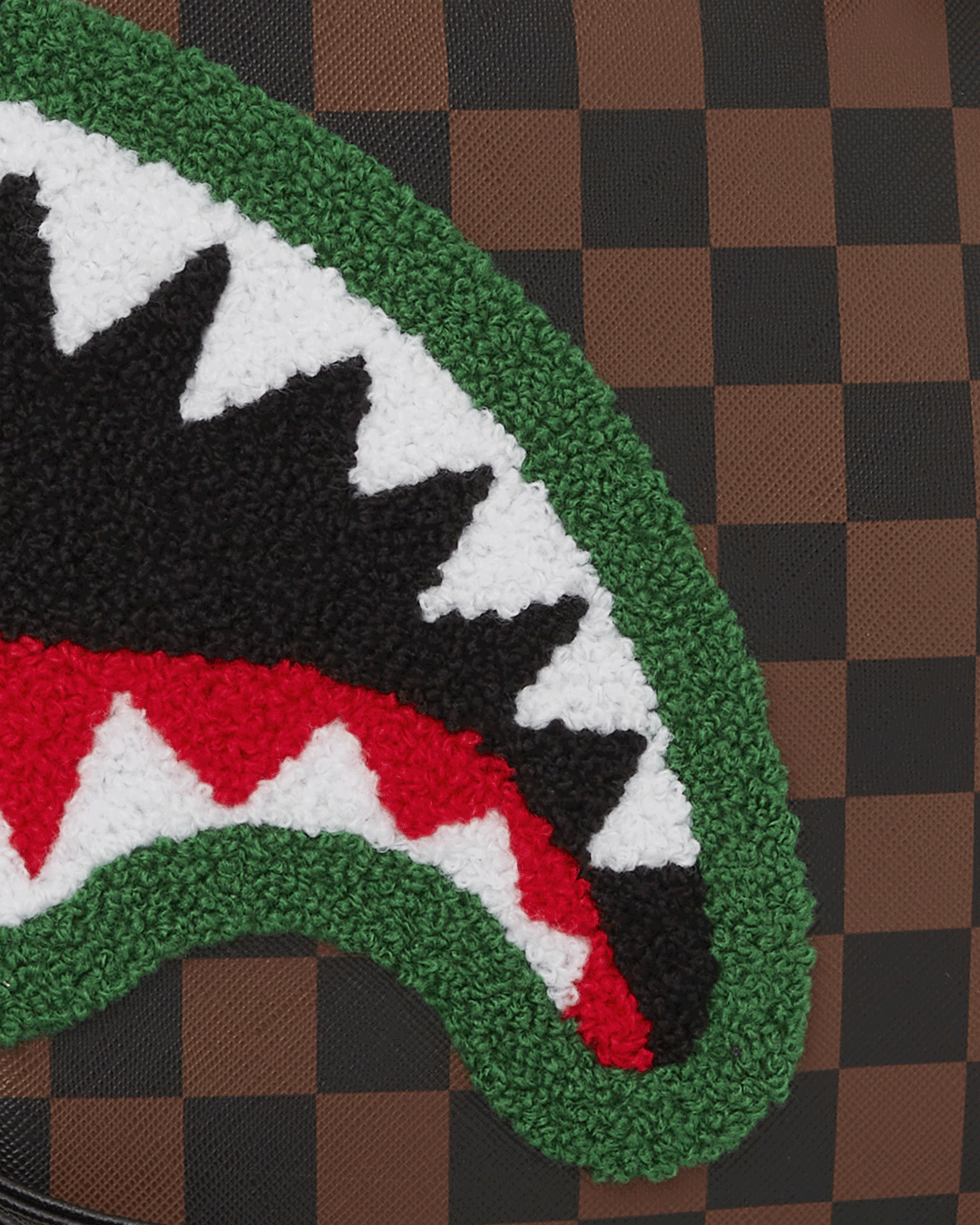 100% PVC Sharks in Paris check pattern on PVC material with textured chenille shark mouth on top featuring gold hardware