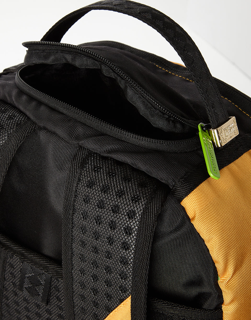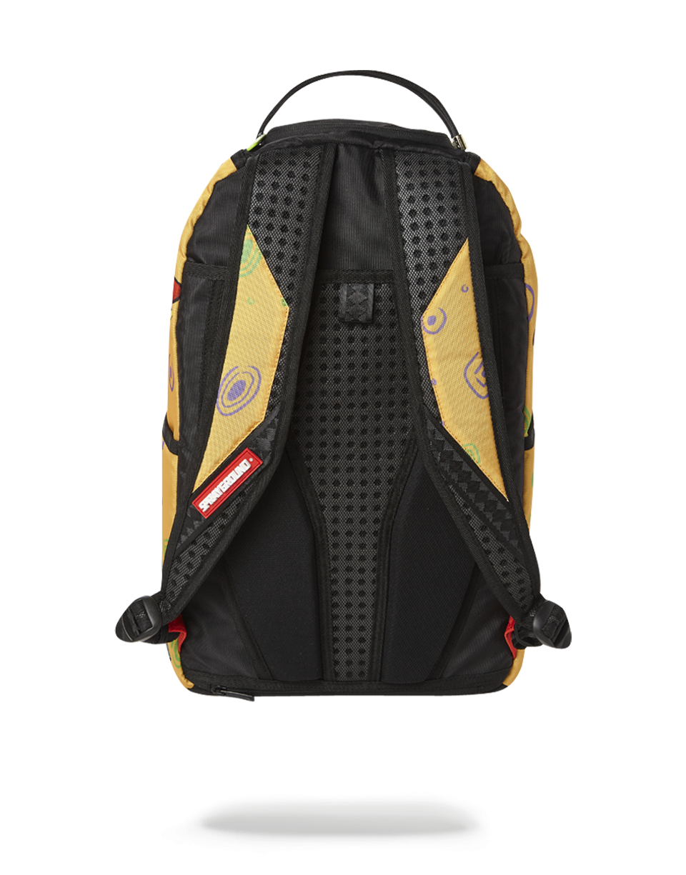 ExteriorDimensions: 18" x 6" x 11.5" • Front zipper pocket • Side pockets • Zippered Stash pocket • Separate velour sunglass compartment • Ergonomic mesh back padding • Adjustable Straps for custom sizing • Red zippers with metal hardware • Metal "Sprayground Authentic" badge • Slide through back sleeve connects to carry-on luggage to free your hands