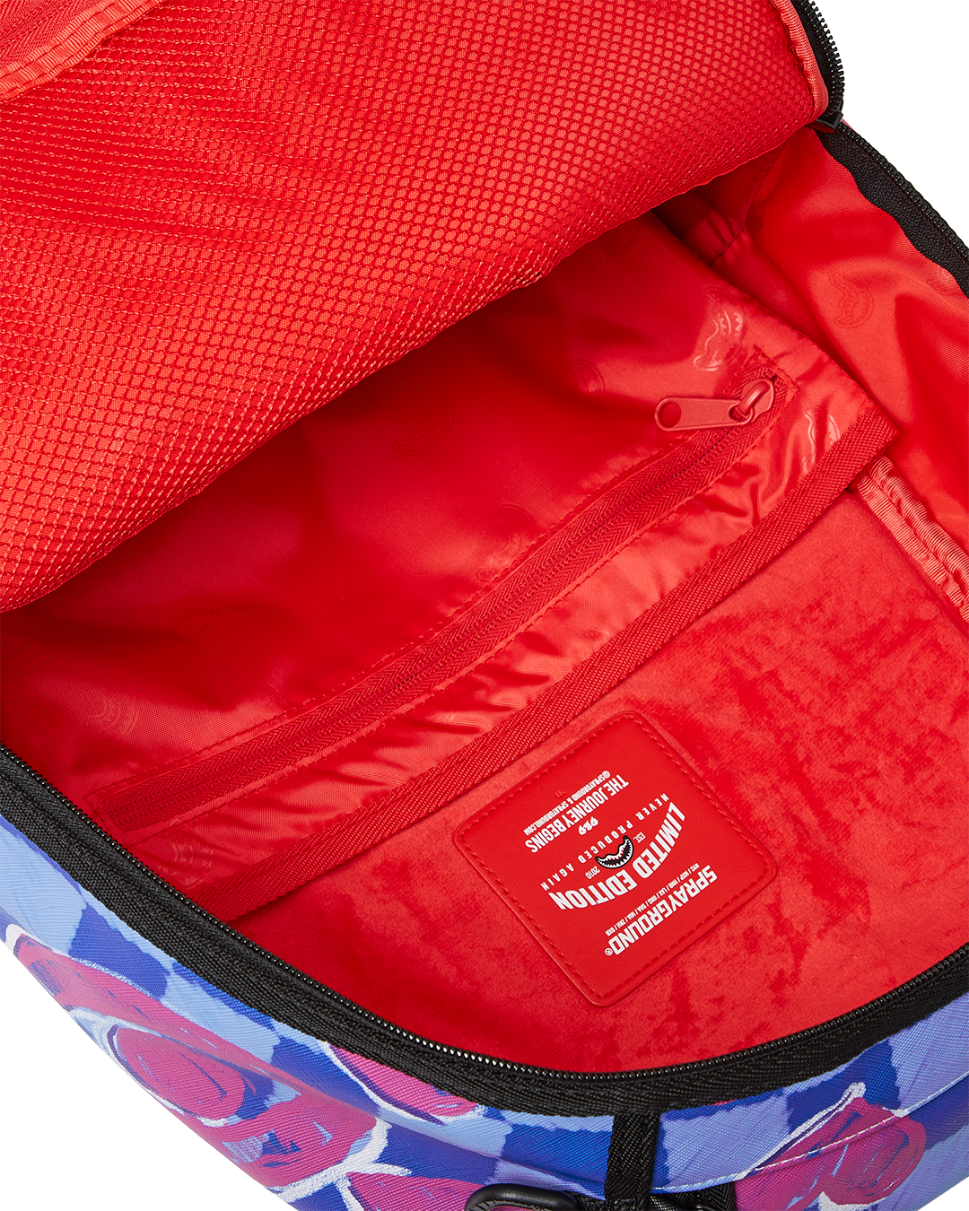 Dimensions: 18" x 6" x 11.5" • Front zipper pocket • Side pockets • Zippered Stash pocket • Separate velour sunglass compartment • Ergonomic mesh back padding • Adjustable Straps for custom sizing • Gold zippers with metal hardware • Metal "Sprayground Authentic" badge • Slide through back sleeve connects to carry-on luggage to free your hands