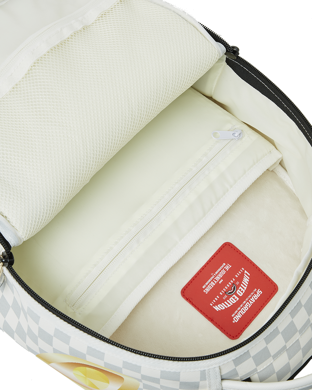 Dimensions: 18" x 6" x 11.5" • Front zipper pocket • Side pockets • Zippered Stash pocket • Separate velour sunglass compartment • Ergonomic mesh back padding • Adjustable Straps for custom sizing • Gold zippers with metal hardware • Metal "Sprayground Authentic" badge • Slide through back sleeve connects to carry-on luggage to free your hands