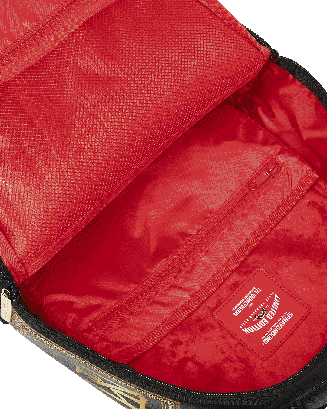 Dimensions: 18" x 6" x 11.5" • Front zipper pocket • Side pockets • Zippered Stash pocket • Separate velour sunglass compartment • Ergonomic mesh back padding • Adjustable Straps for custom sizing • Gold zippers with metal hardware • Metal "Sprayground Authentic" badge • Slide through back sleeve connects to carry-on luggage to free your hands