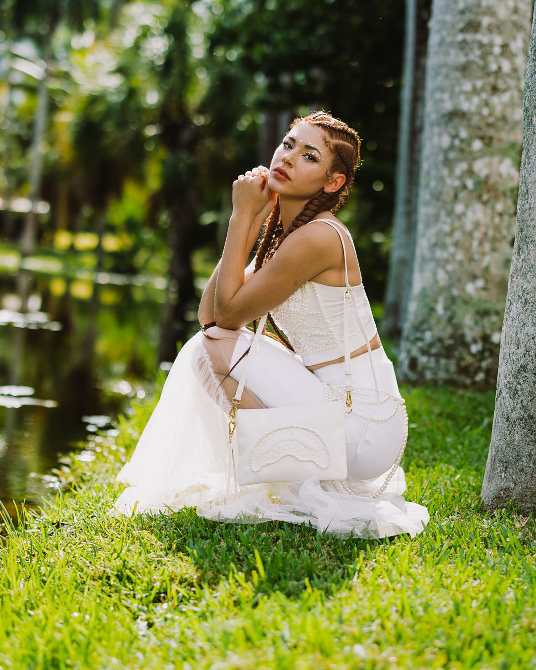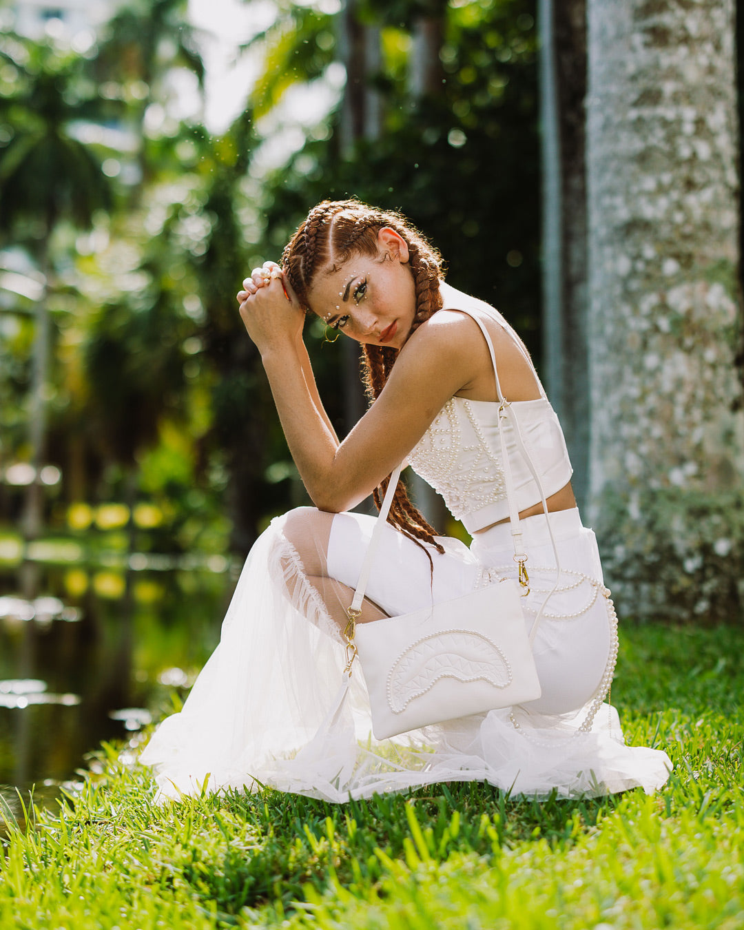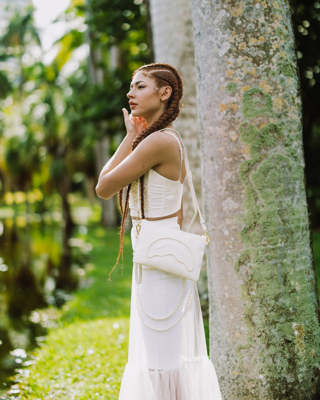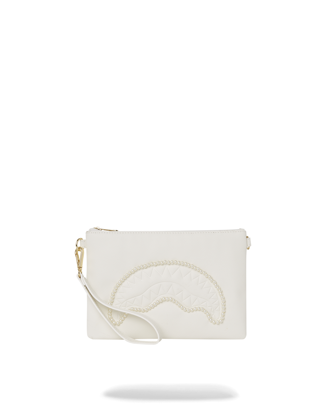 100% PVC embossed sharkmouth embellished with faux pearls featuring gold hardware
