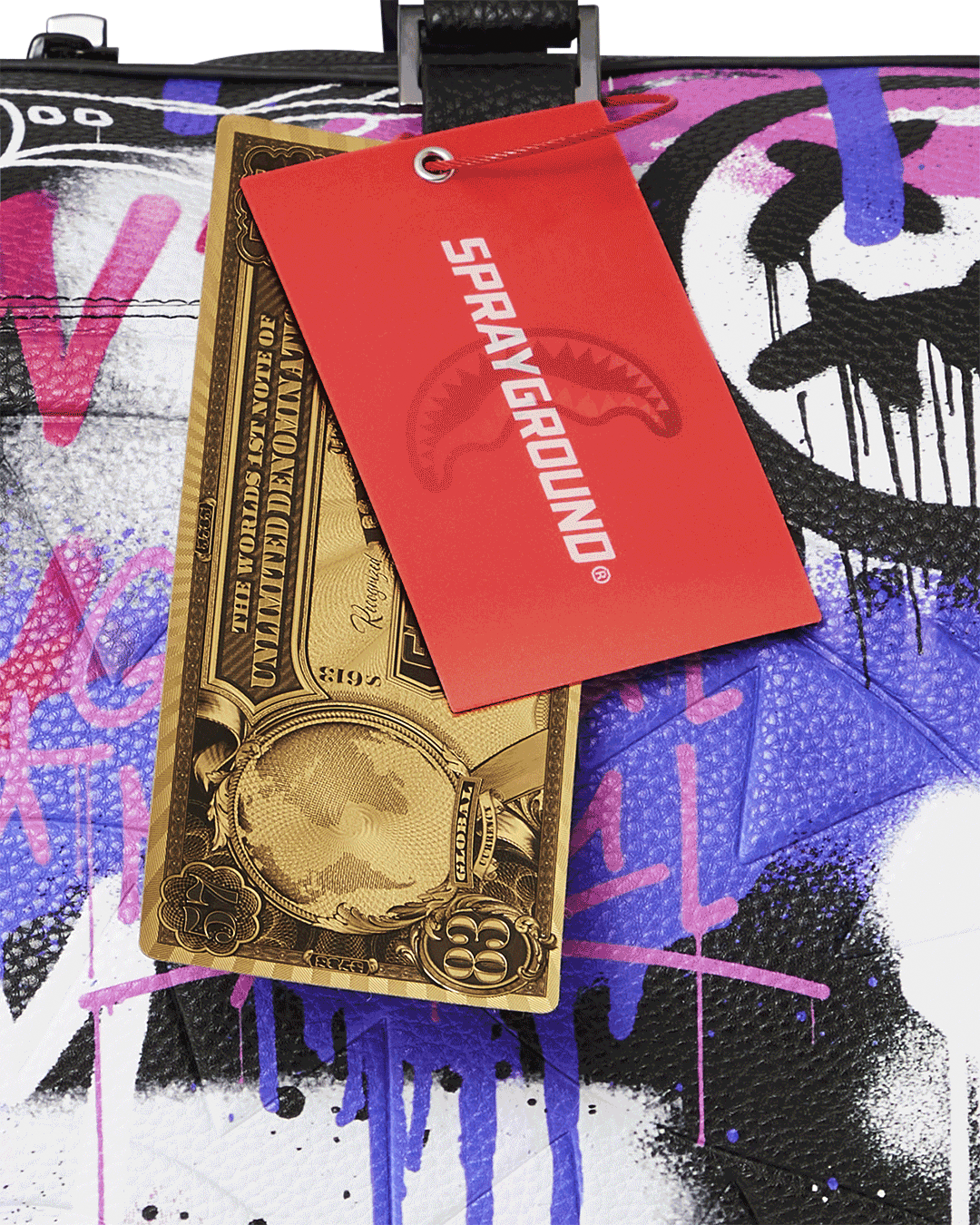 Dimensions: 20" x 10" x 10.75" • Metal zipper pocket• Back Zippers •Zippered sneaker pocket • gold zippers • Adjustable Straps for custom sizing •Metal Zippers with Metal Hardware • bag of Sprayground money