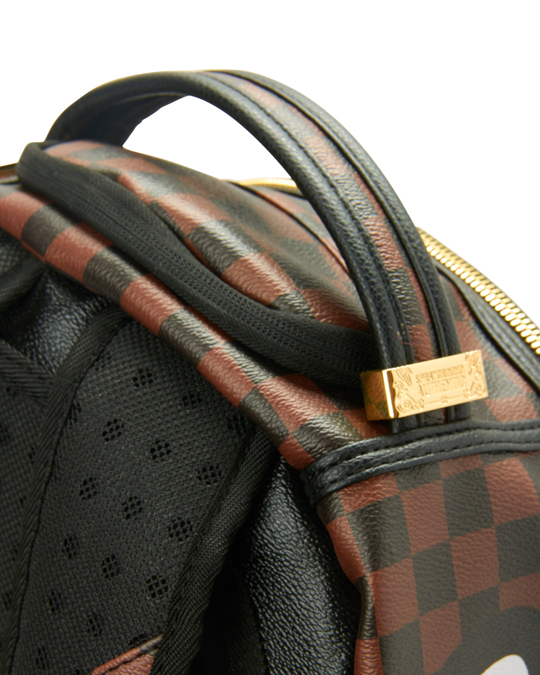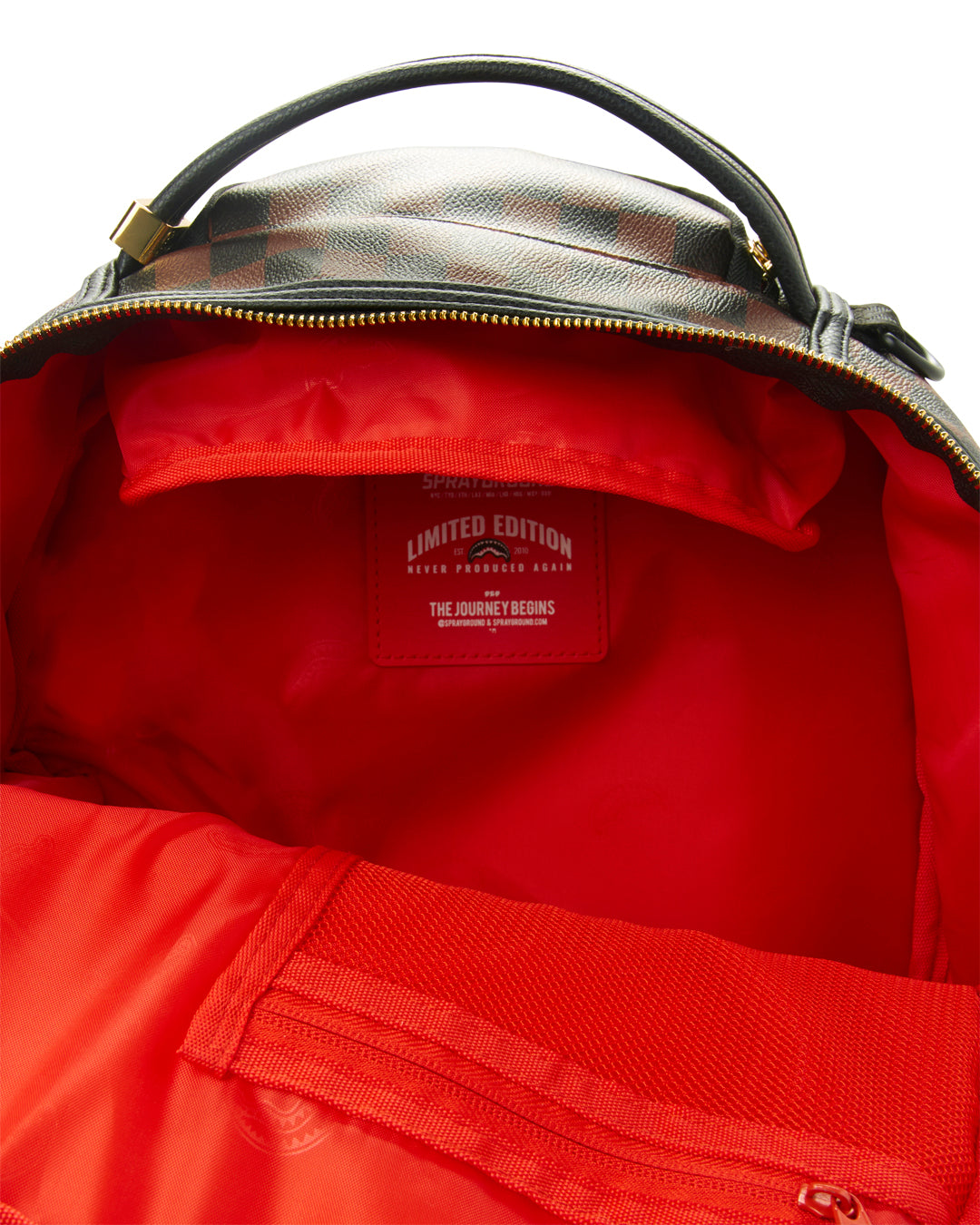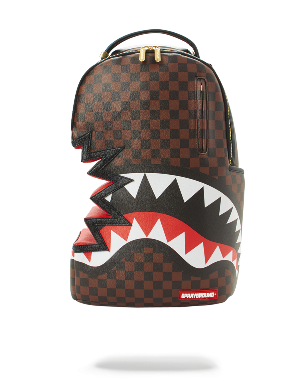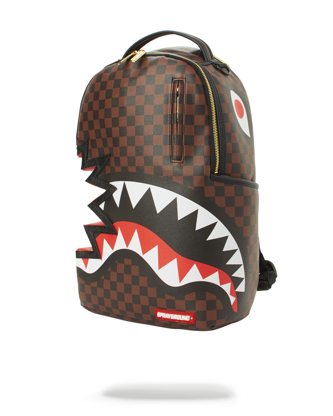 ExteriorHighly Detailed Constructed Shark Bite. Bag Dimensions: 18" x 6" x 11.5" • Front zipper pocket • Side pockets • Separate velour sunglass compartment • Ergonomic mesh back padding • Adjustable Straps for custom sizing • gold metal zippers with metal hardware • Metal "Sprayground Authentic" badge • Slide through back sleeve connects to carry-on luggage to free your hands • Stash Pocket (if u can find it)!
