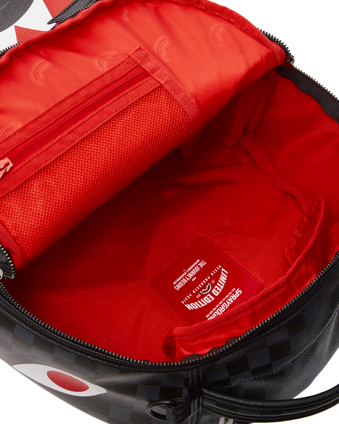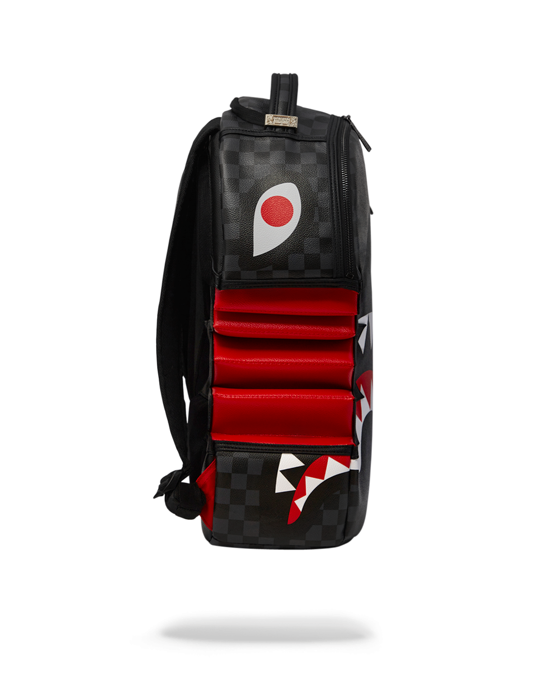 ExteriorDimensions: 18" x 6" x 11.5" • Front zipper pocket • Side pockets • Zippered Stash pocket • Separate velour sunglass compartment • Ergonomic mesh back padding • Adjustable Straps for custom sizing • Gold zippers with metal hardware • Metal "Sprayground Authentic" badge • Slide through back sleeve connects to carry-on luggage to free your hands