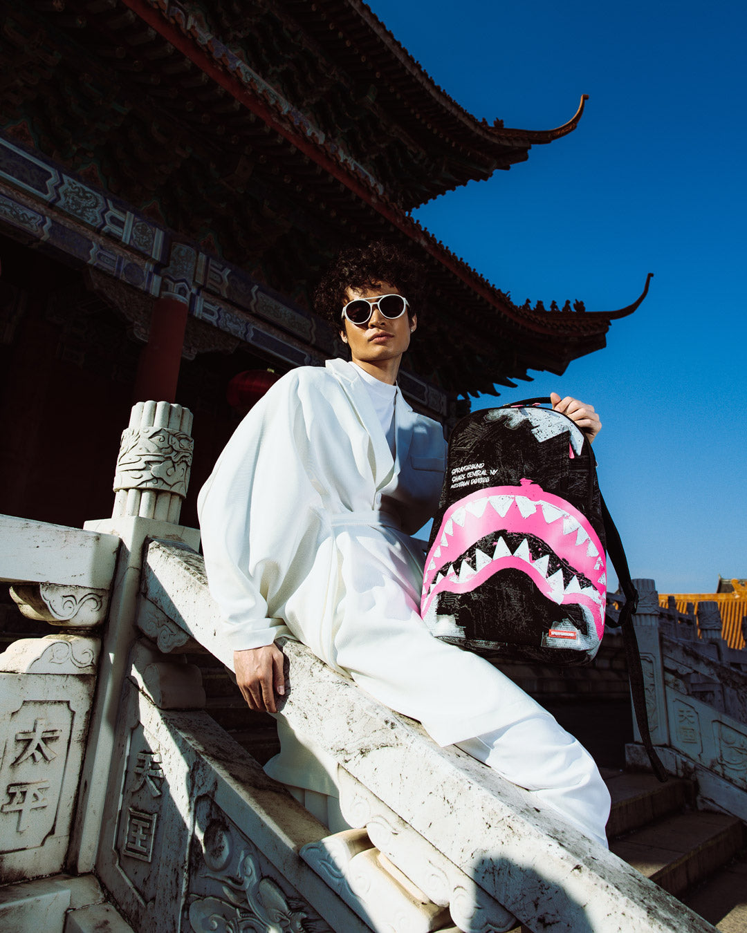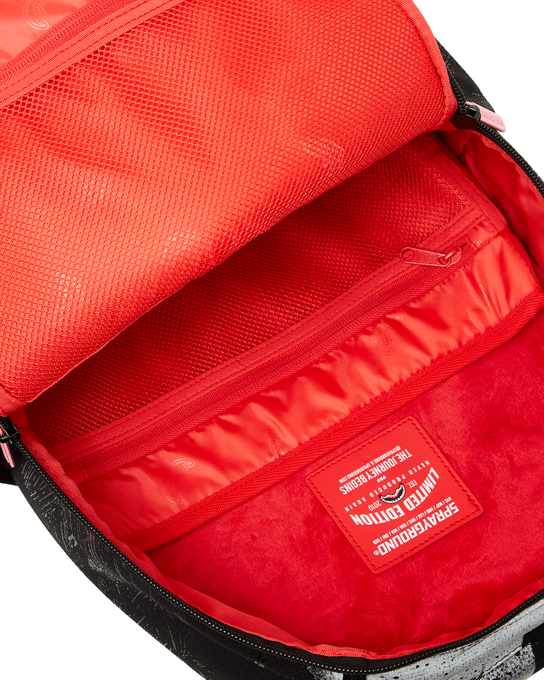 Dimensions: 18" x 6" x 11.5" • Front zipper pocket • Side pockets • Zippered Stash pocket • Separate velour sunglass compartment • Ergonomic mesh back padding • Adjustable Straps for custom sizing • Gold zippers with metal hardware • Metal "Sprayground Authentic" badge • Slide through back sleeve connects to carry-on luggage to free your hands