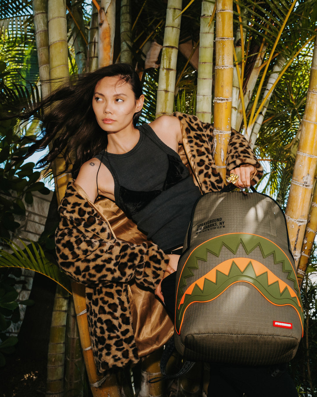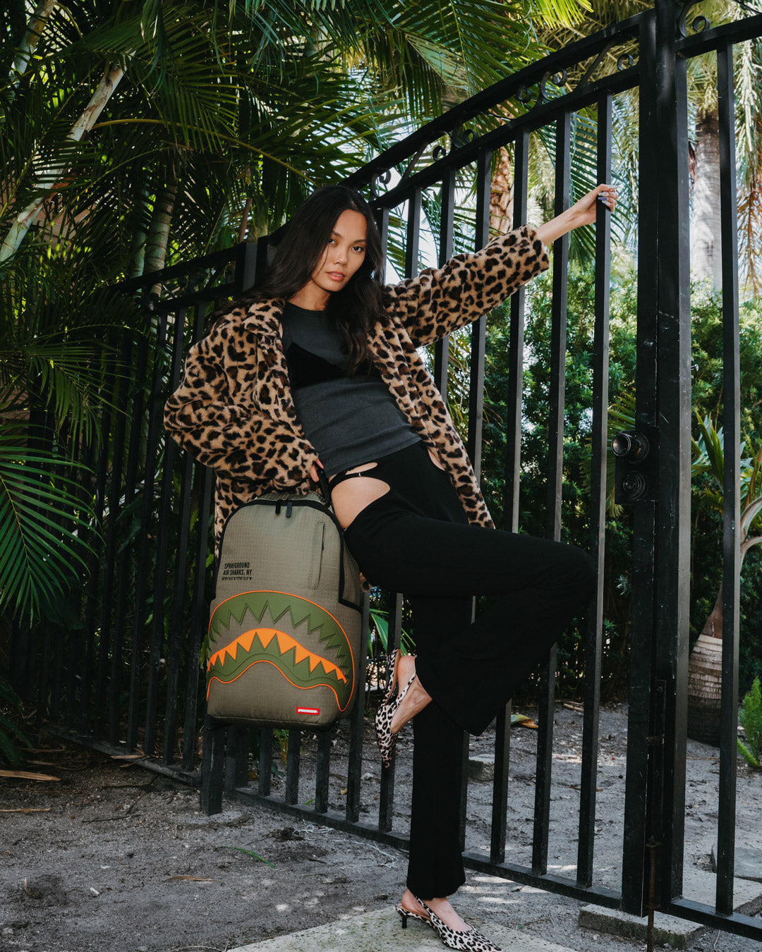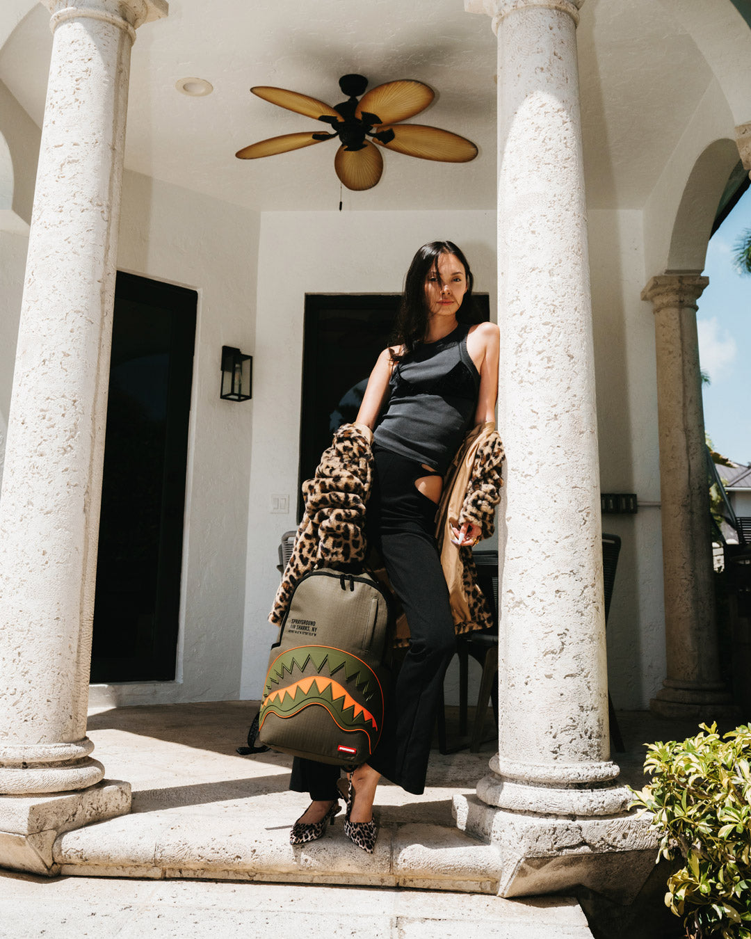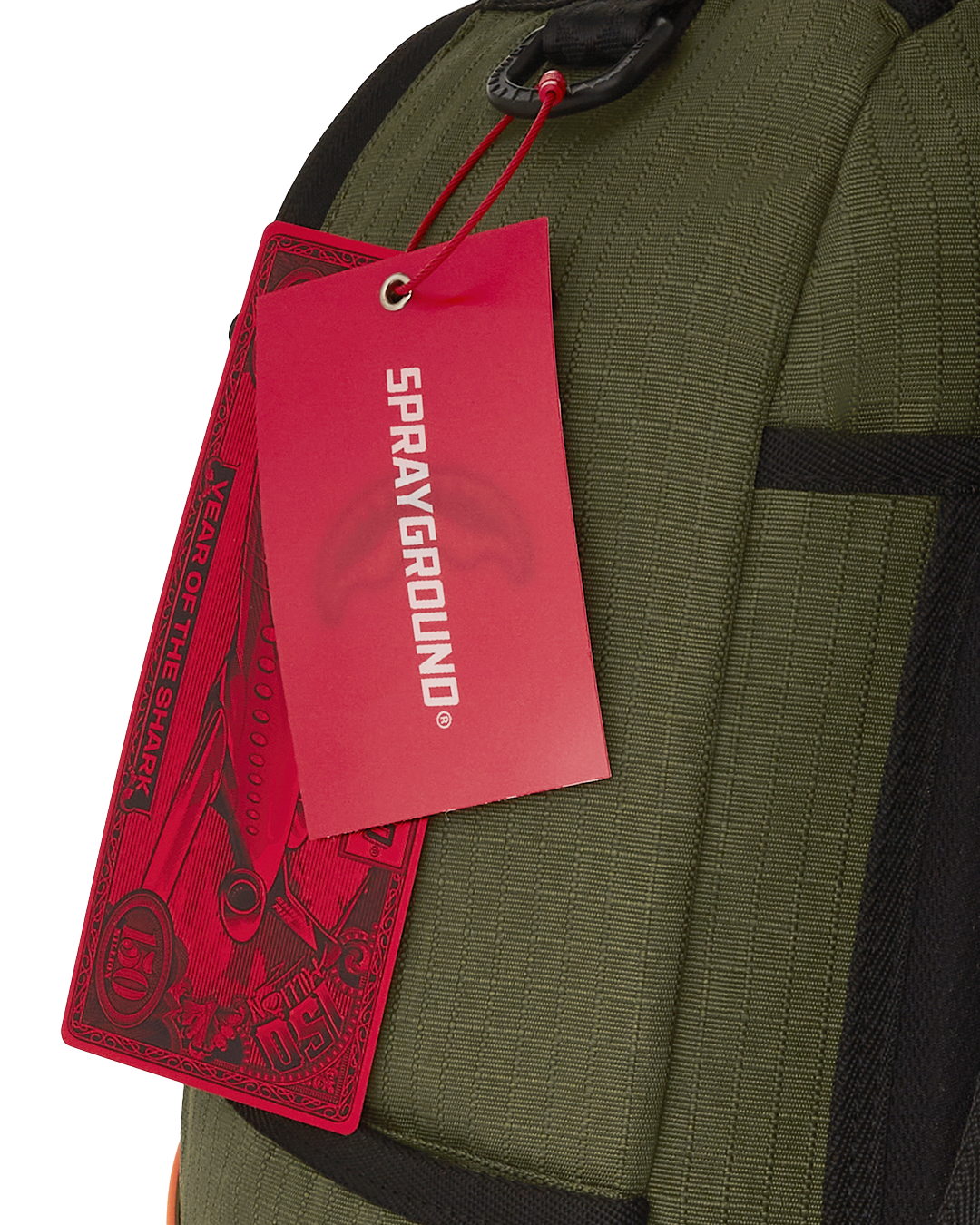Dimensions: 18" x 6" x 11.5" • Front zipper pocket • Side pockets • Zippered Stash pocket • Separate velour sunglass compartment • Ergonomic mesh back padding • Adjustable Straps for custom sizing • Gold zippers with metal hardware • Metal "Sprayground Authentic" badge • Slide through back sleeve connects to carry-on luggage to free your hands